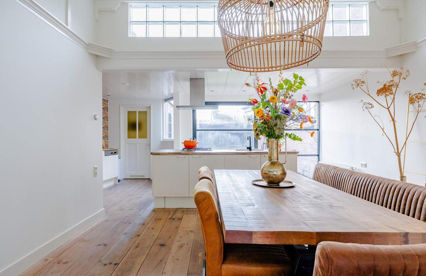 Via de entree betreedt u een woning waarin de authentieke elementen direct de toon zetten. De woonkamer aan de voorzijde wordt gekenmerkt door de erker met glas-in-lood bovenramen, hoge plafonds met sierlijsten en strak afgewerkte wanden. De houtkachel vormt een sfeervol middelpunt in de ruimte. De originele ensuite-schuifdeuren met glas-in-lood verbinden de woonkamer met de eetkamer. Dit detail geeft niet alleen karakter, maar zorgt ook voor een prettige indeling waarbij u ruimtes kunt afscheiden of juist samenvoegen. Aan de achterzijde bevindt zich de open keuken met kookeiland. De keuken is uitgevoerd in lichte tinten met een houten werkblad en voorzien van diverse inbouwapparatuur. Het kookeiland vormt een natuurlijke ontmoetingsplek in huis. Via de brede pui kijkt u uit op de tuin en stapt u zo naar buiten. Aansluitend is er een praktische bijkeuken met extra bergruimte en toegang naar buiten – ideaal als achterom of voor dagelijks gebruik. Op de eerste verdieping bevinden zich drie slaapkamers. De zichtbare balken geven hier extra sfeer. In 2024 is de verdieping vernieuwd met drie dakkapellen, waardoor de kamers verrassend ruim en licht zijn. De badkamer is modern uitgevoerd en voorzien van een ligbad, inloopdouche, toilet en wastafel met meubel.