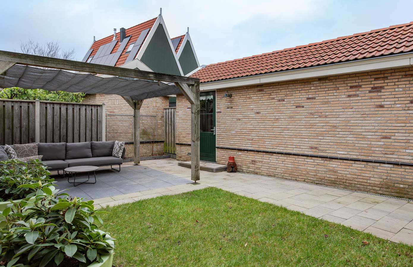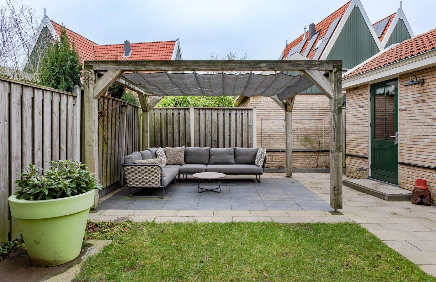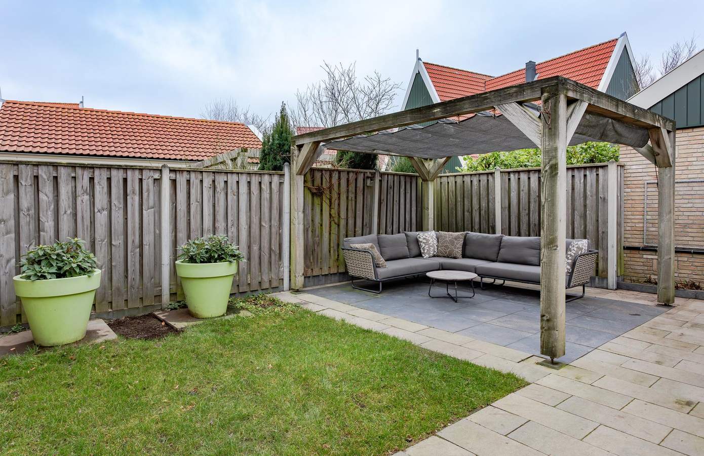 De achtertuin biedt volop mogelijkheden om te ontspannen en te genieten. Achterin de tuin staat een pergola met schaduwdoek, waar u een heerlijke zithoek kunt creëren om optimaal van uw tuin te genieten. Ook vanuit de tuin heeft u directe toegang tot de garage/berging. Met voldoende ruimte om te spelen, tuinieren of ontspannen is deze tuin een fijne plek voor jong en oud.