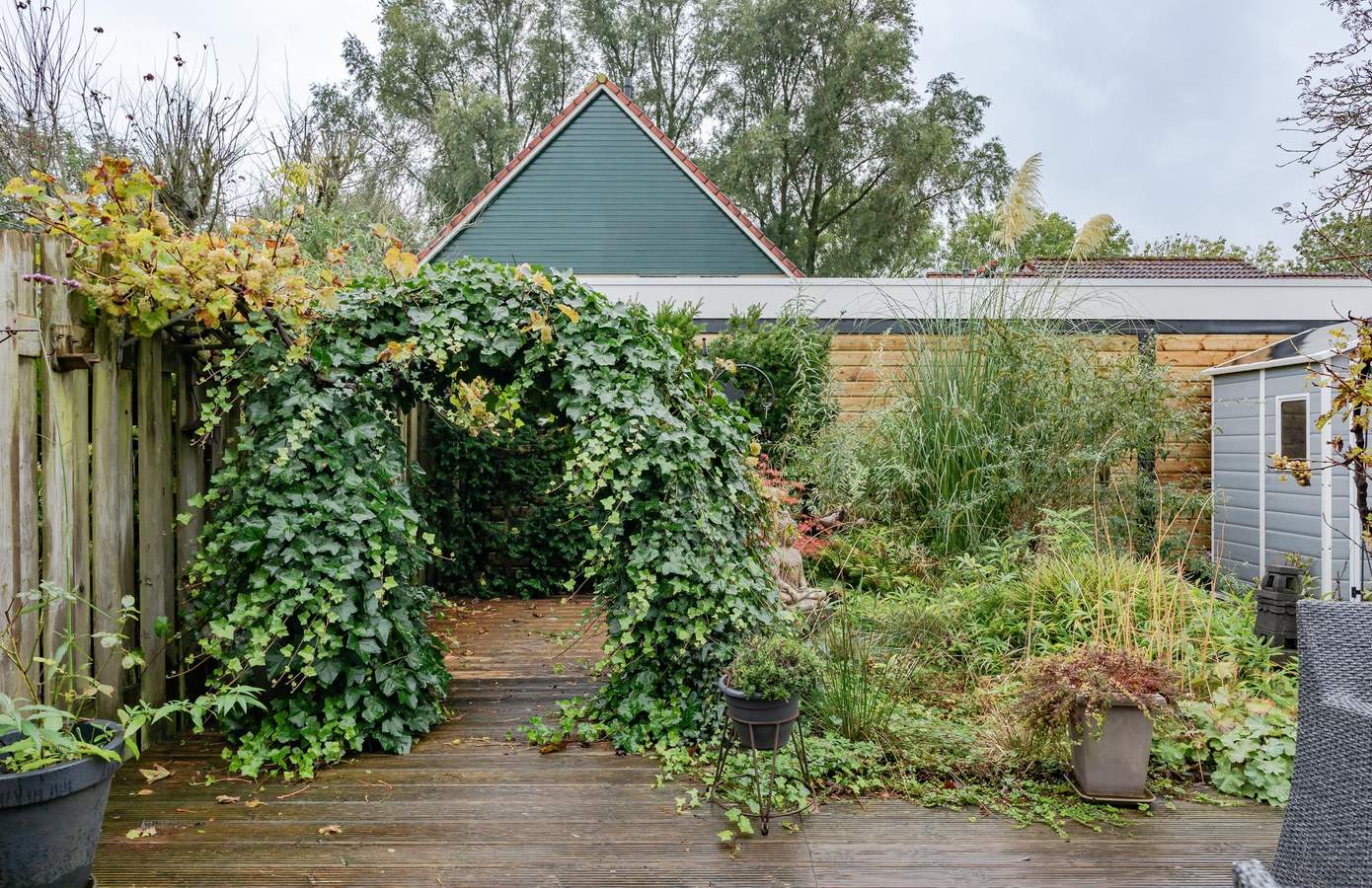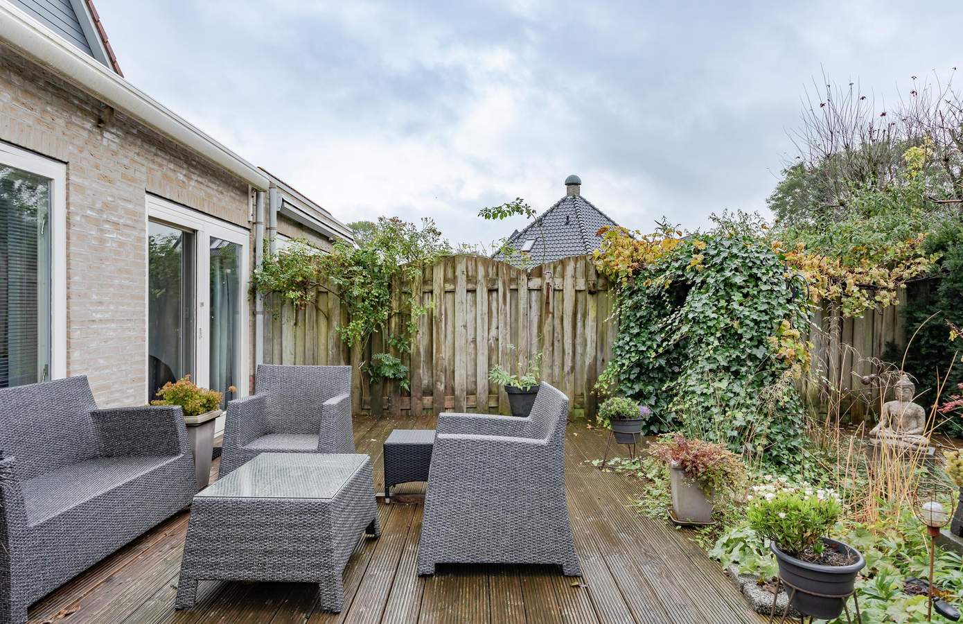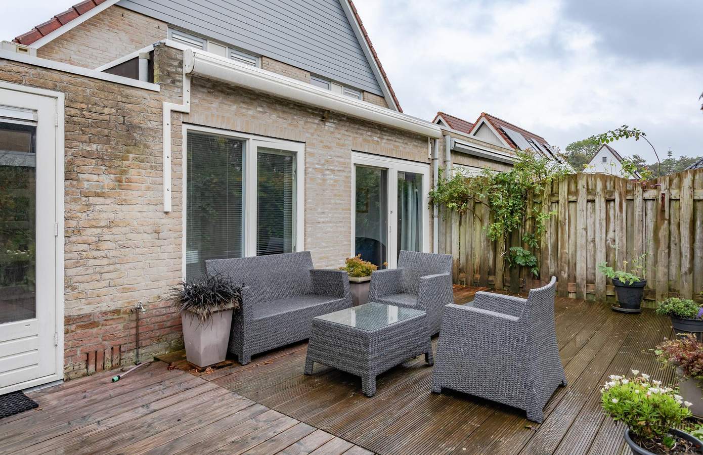 Met een heerlijke zonnige tuin op het zuidwesten, kunt u volop genieten van de zon. Het grootste deel van de tuin bestaat uit houten vlonders, met voldoende ruimte achterin voor een schuurtje om al uw tuingereedschap op te bergen. Aan de achtergevel is een elektrisch bedienbaar zonnescherm bevestigd, wat op warme dagen voor welkome schaduw en verkoeling zorgt. Bovendien beschikt de woning over een eigen oprit naast de voortuin, waar u twee auto’s kunt parkeren.