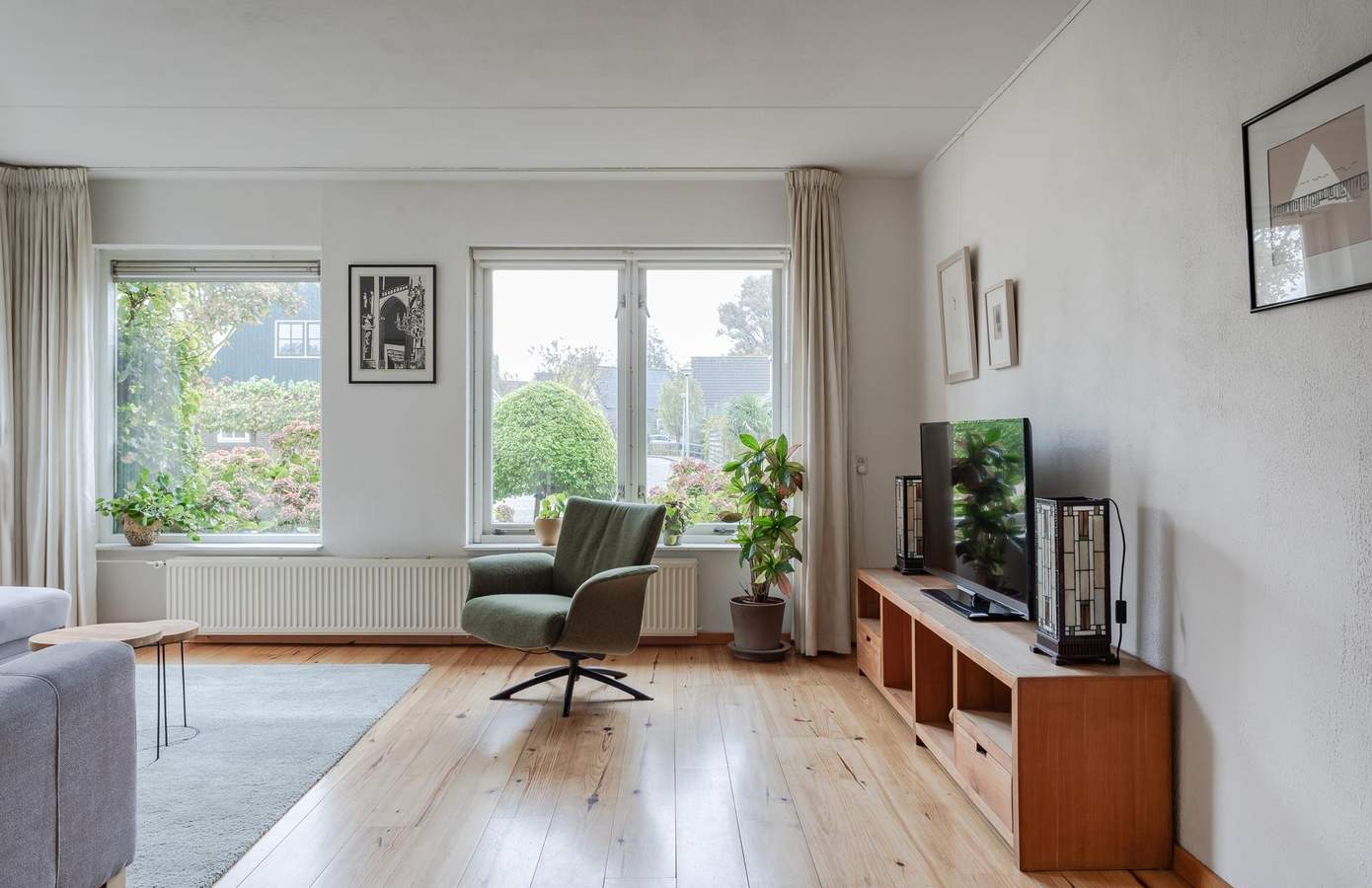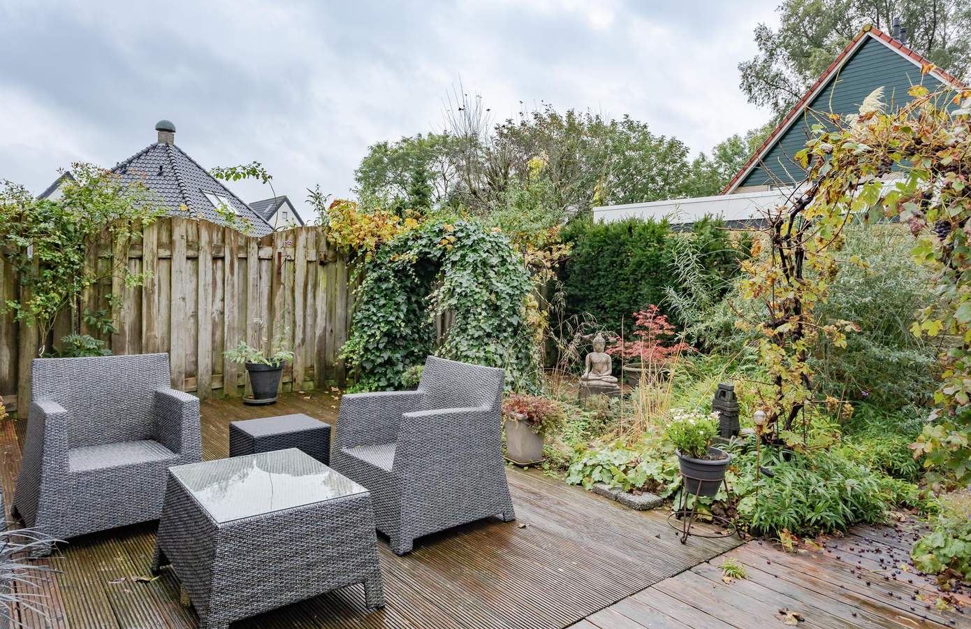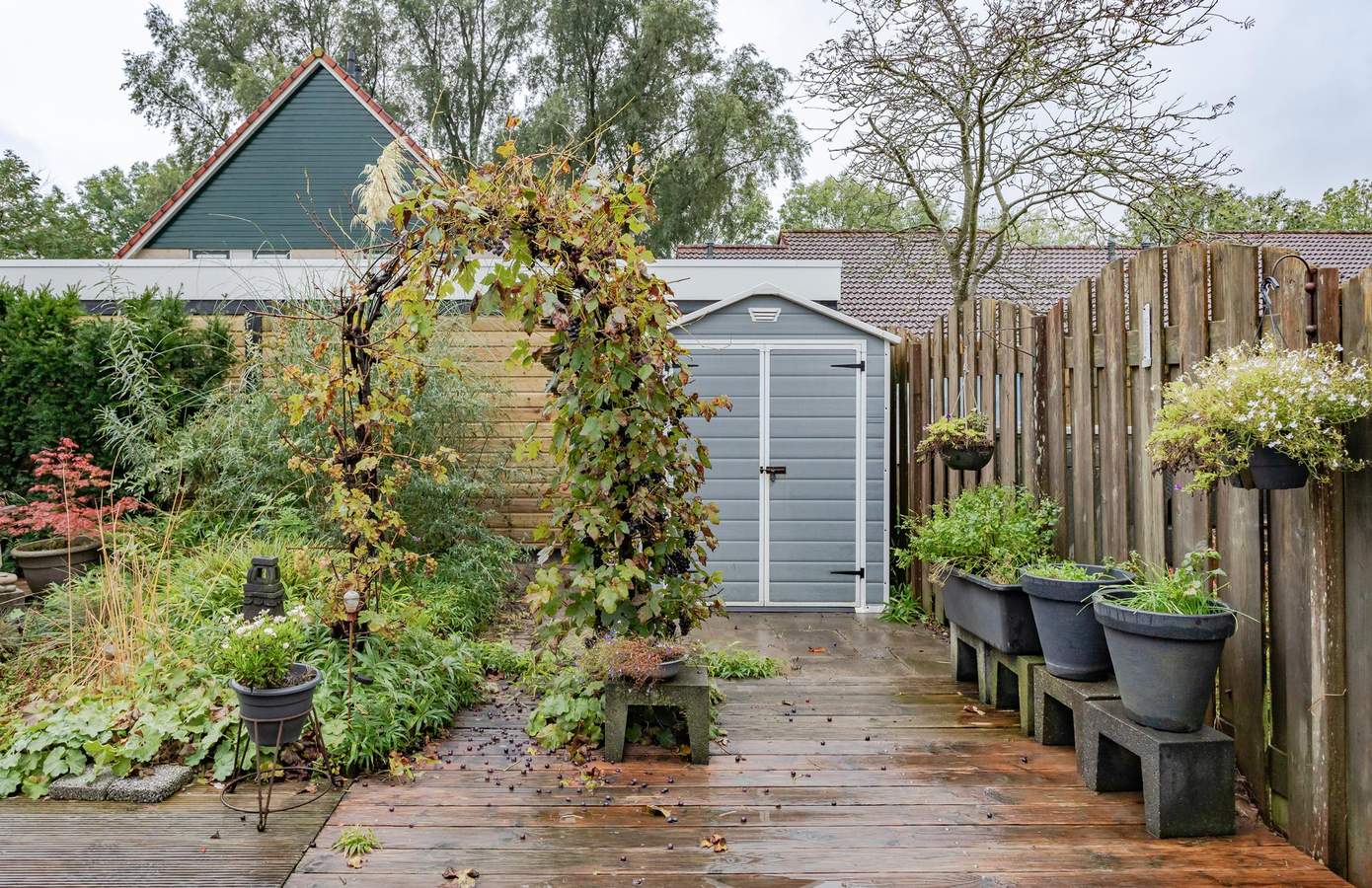 Met een heerlijke zonnige tuin op het zuidwesten, kunt u volop genieten van de zon. Het grootste deel van de tuin bestaat uit houten vlonders, met voldoende ruimte achterin voor een schuurtje om al uw tuingereedschap op te bergen. Aan de achtergevel is een elektrisch bedienbaar zonnescherm bevestigd, wat op warme dagen voor welkome schaduw en verkoeling zorgt. Bovendien beschikt de woning over een eigen oprit naast de voortuin, waar u twee auto’s kunt parkeren.