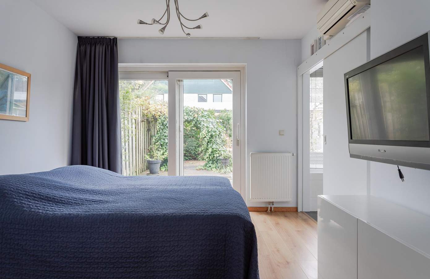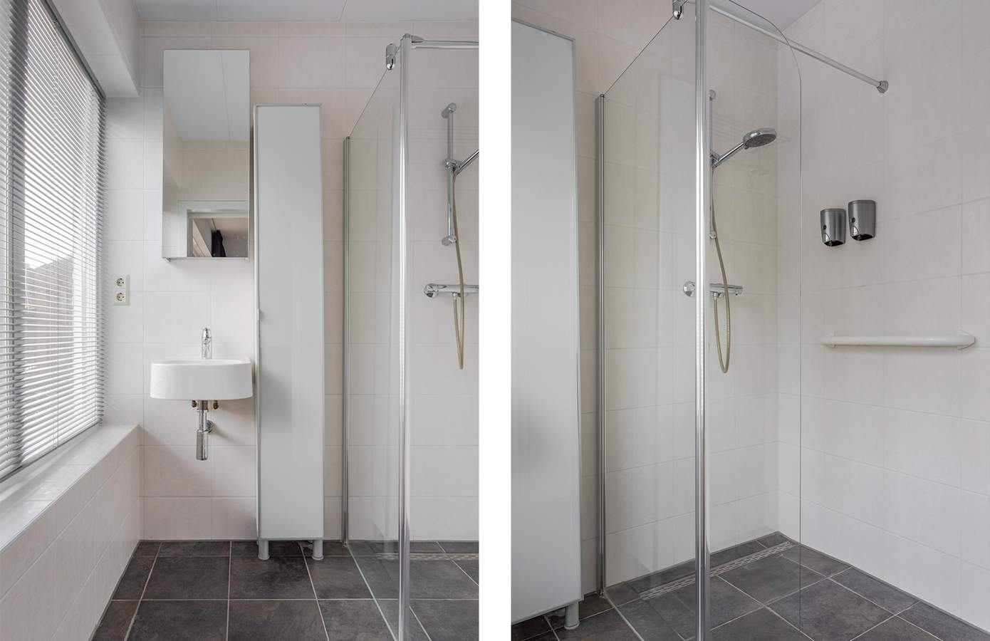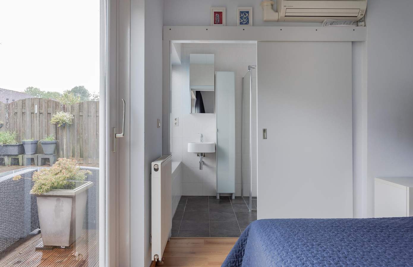 Aan de tuinzijde is een slaapkamer met een aangrenzende badkamer gecreëerd, wat ideaal is voor wie op zoek is naar een levensloopbestendige woning. De slaapkamer biedt uitzicht op de achtertuin en veel daglicht dankzij een grote schuifpui en een lichtkoepel. De badkamer is voorzien van vloerverwarming, een wastafel en een douche.