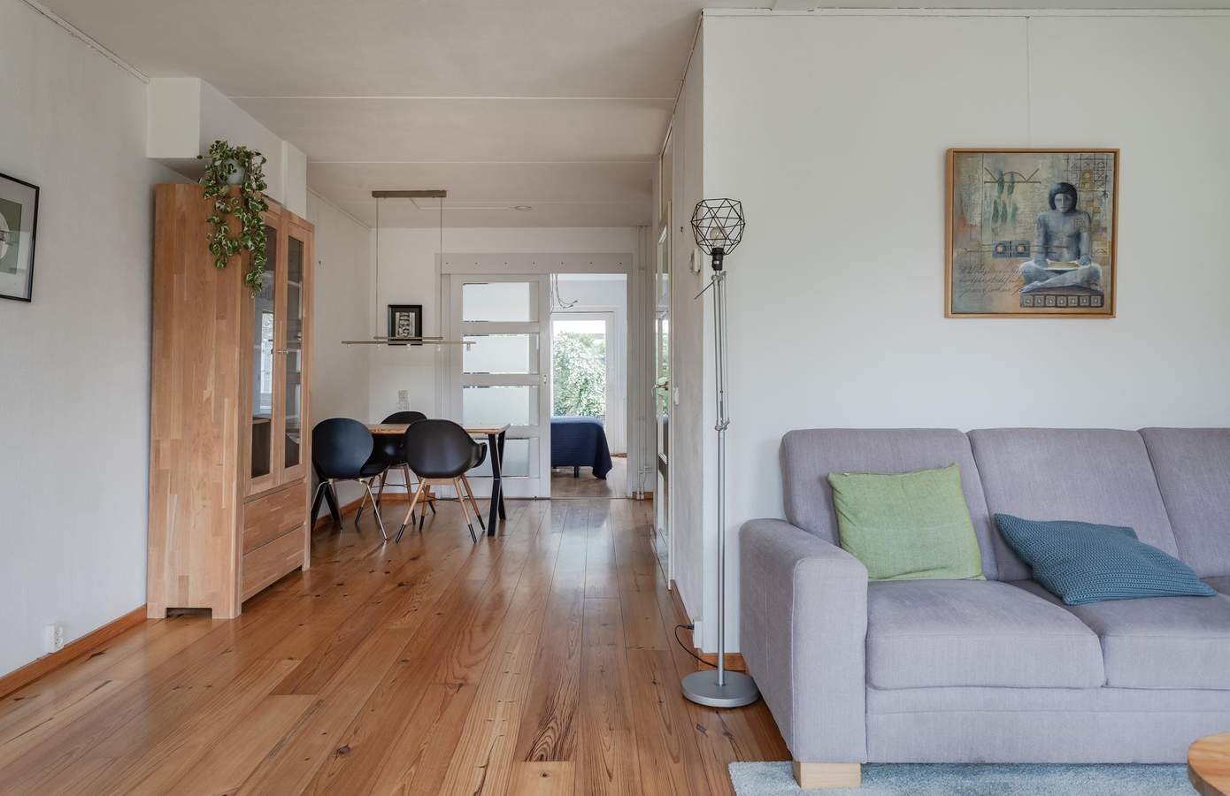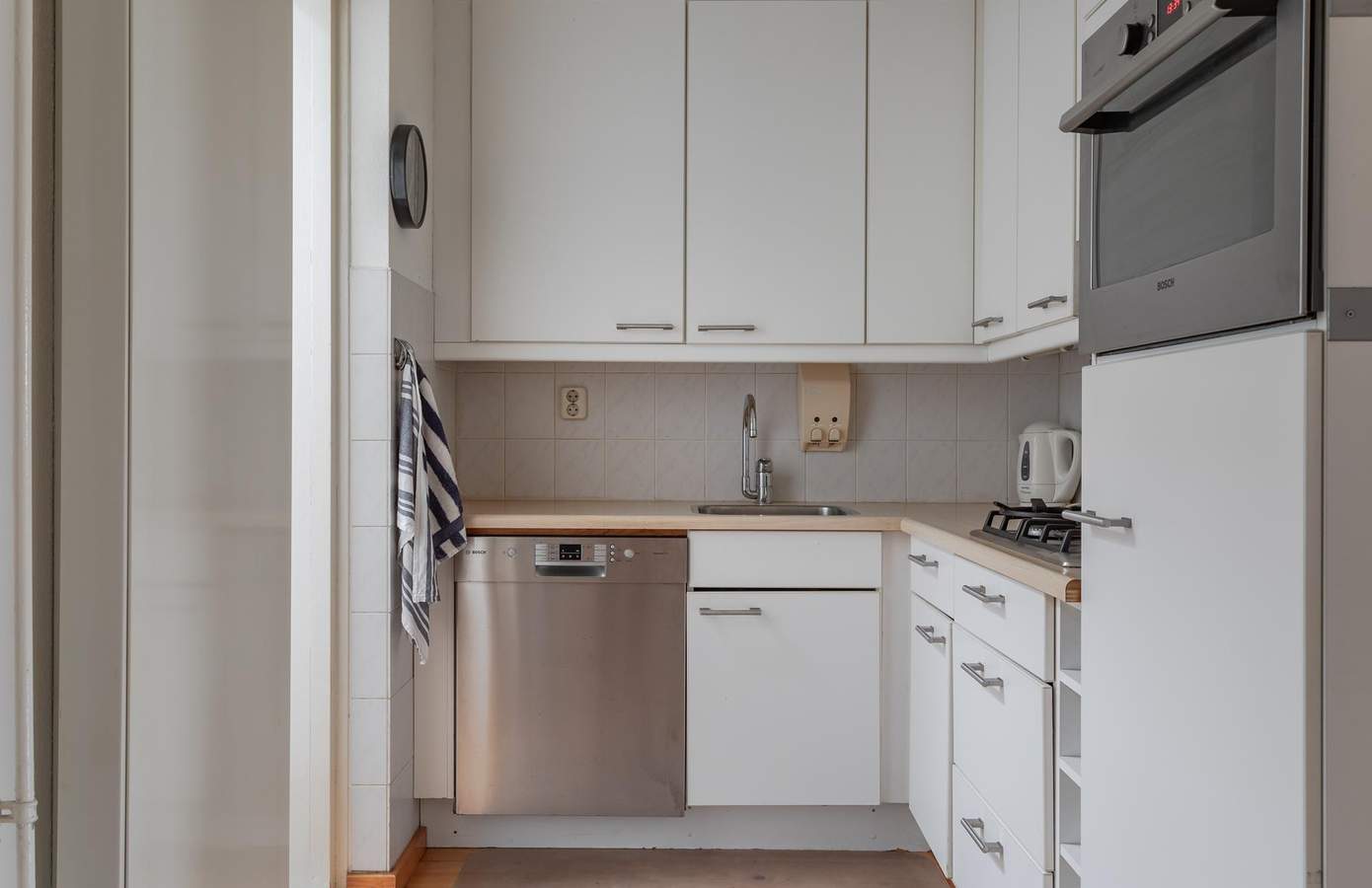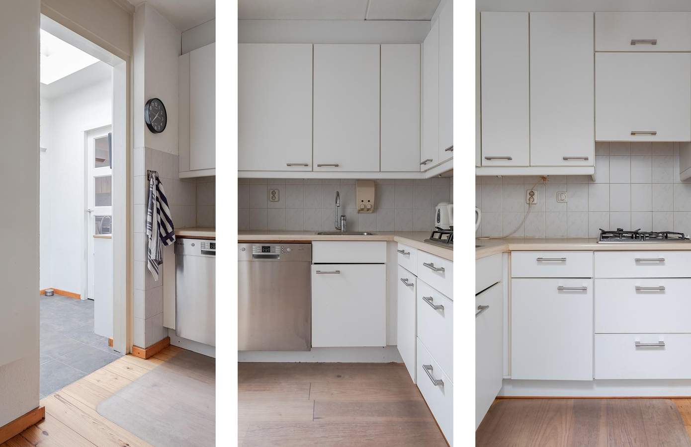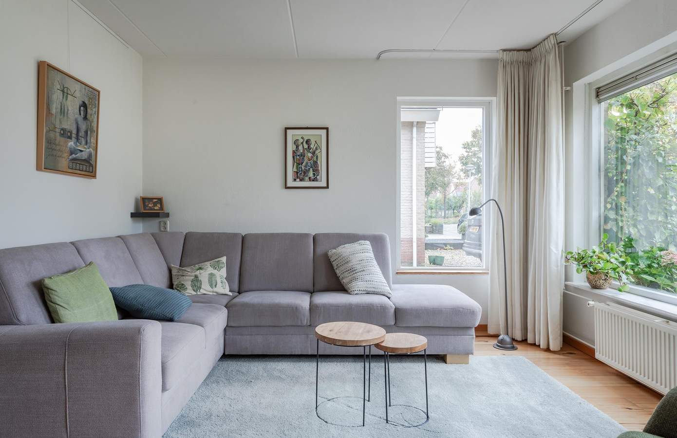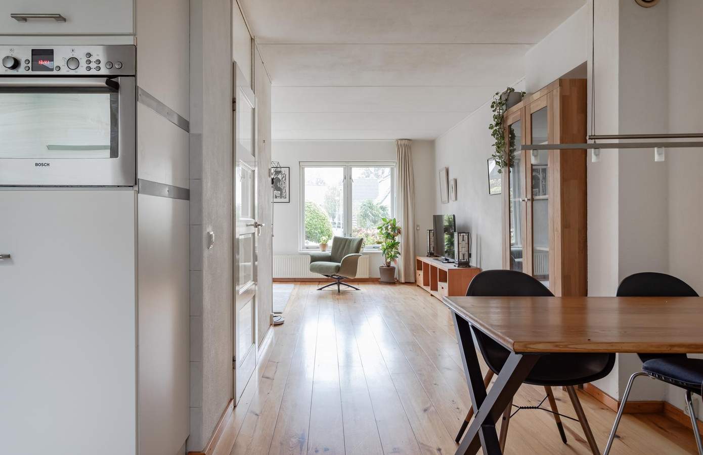 Via de hal met een apart toilet en de trap naar boven, komt u binnen in de woonkamer aan de voorkant van de woning, waardoor u door de grote ramen veel lichtinval heeft. De halfopen keuken geeft toegang tot een kleine bijkeuken met een lichtkoepel, van waaruit u inpandig toegang heeft tot de berging/garage.