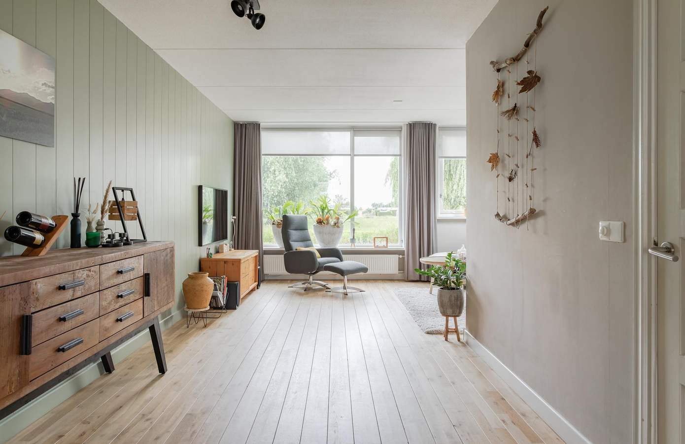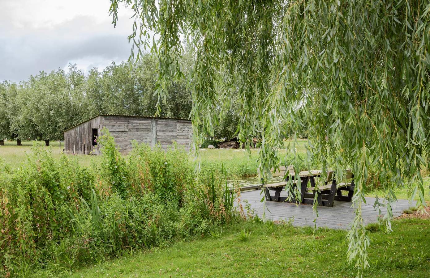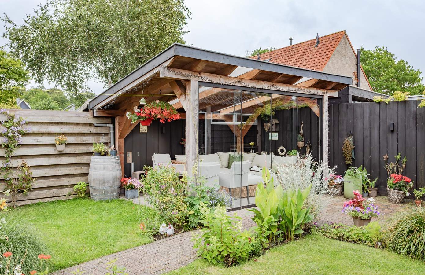 De achtertuin is in 2020 verrijkt met een nieuwe veranda en berging in dezelfde stijl, waardoor u hier heerlijk beschut kunt zitten en genieten van lange avonden buiten. De veranda kan worden afgesloten met een glazen wand, waardoor het hier het hele jaar goed vertoeven is. Dankzij de openslaande deuren aan de achterzijde van de keuken haalt u buiten naar binnen en andersom. De tuin is sfeervol aangelegd, met ruimte voor kinderen om te spelen en voldoende plek voor een grote eettafel en loungeset. Op de oprit aan de voorzijde is ruimte om uw auto’s te parkeren. Aan de overkant van de woning ligt een groenstrook met uitzicht over water en grazende schapen. Hier kunt u de zon prachtig zien ondergaan.