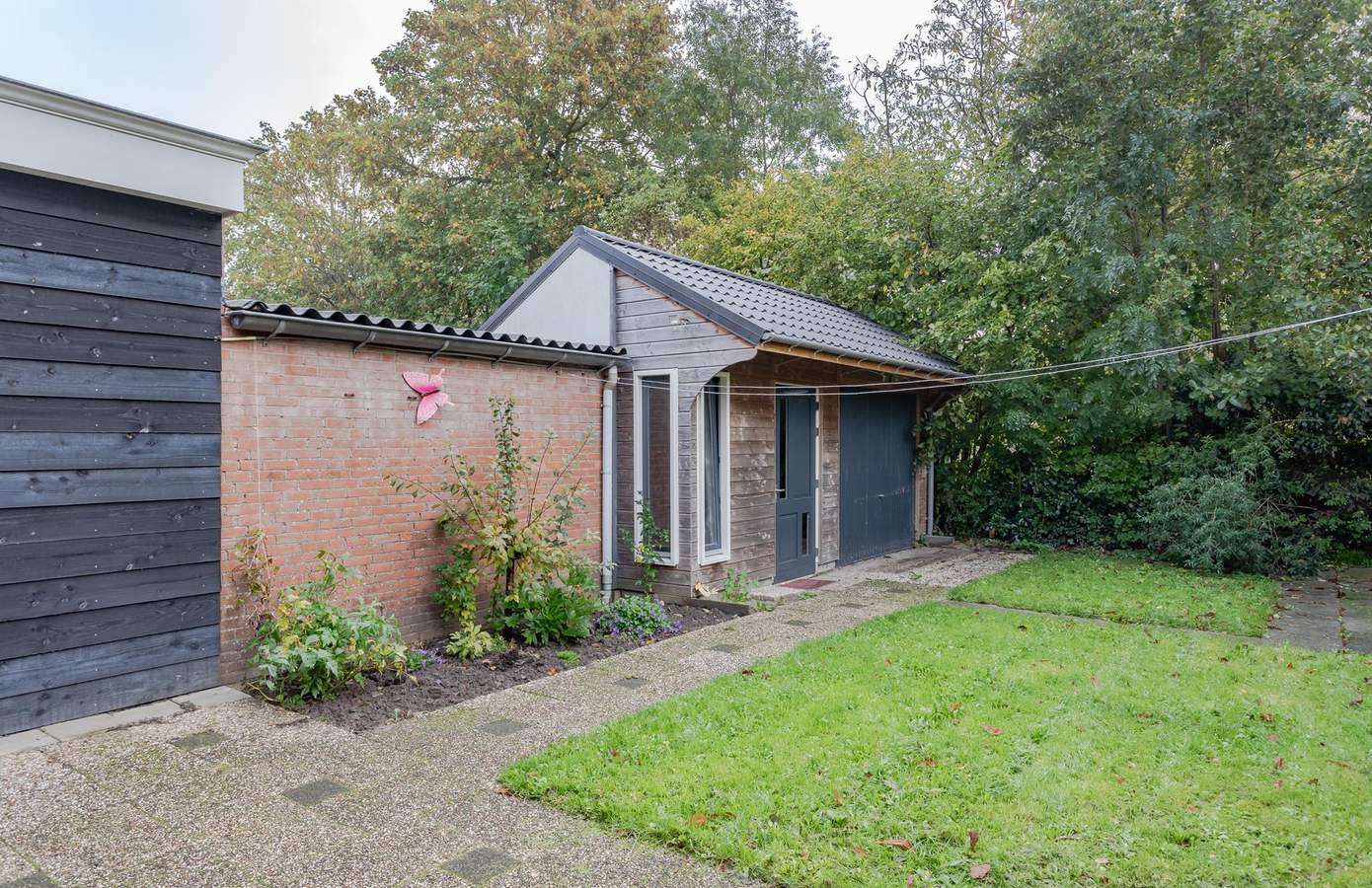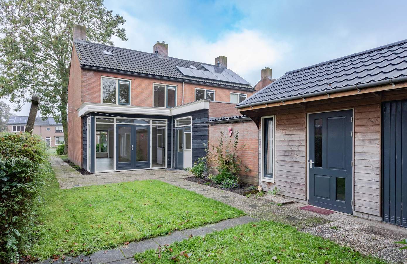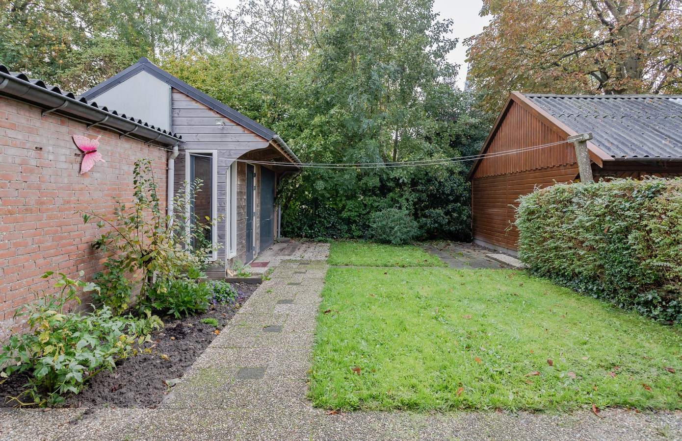 De achtertuin is gelegen op het zuidoosten. De aanbouw aan de achterzijde van de woning biedt niet alleen extra ruimte binnen, maar ook een prachtige overgang naar de buitenruimte. Er is zonwering en verlichting geïnstalleerd, waardoor de tuin een sfeervolle plek is voor lange zomeravonden. De berging zorgt voor een handige opbergruimte en is voorzien van een werkbank.