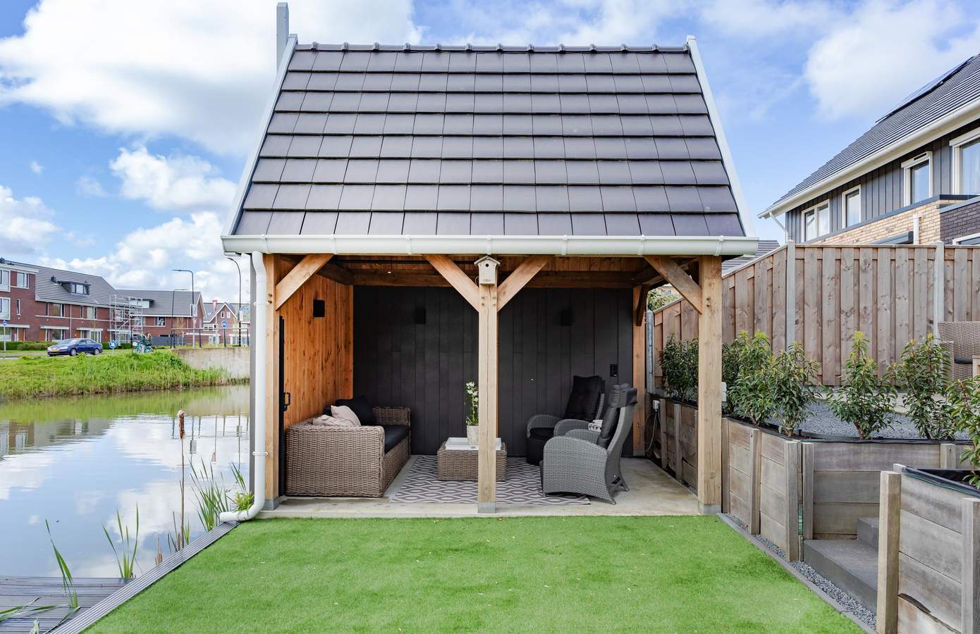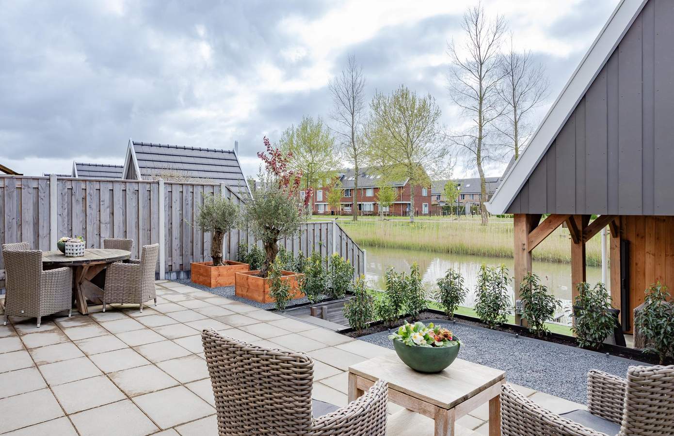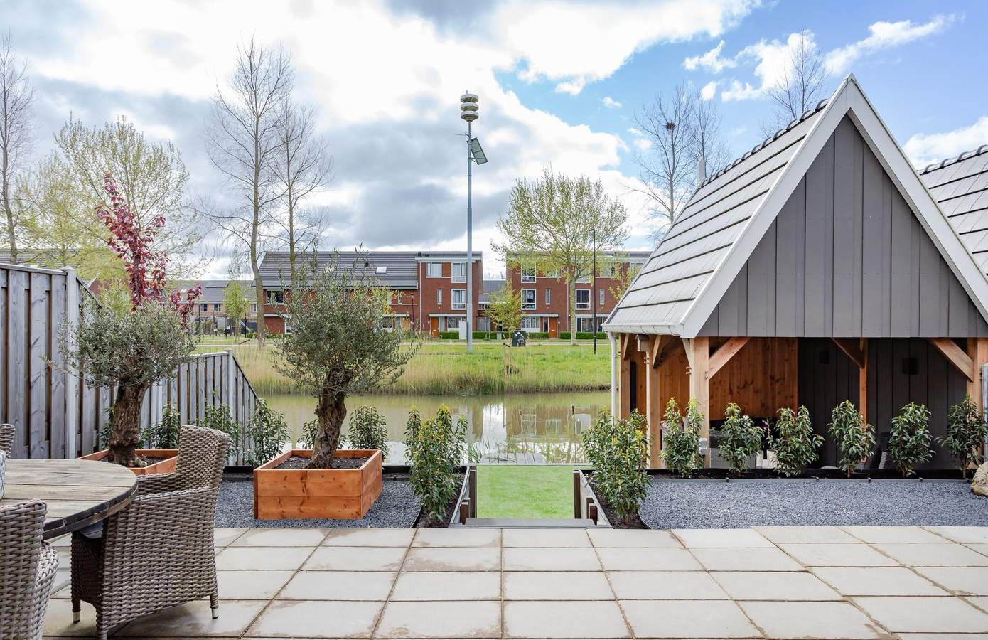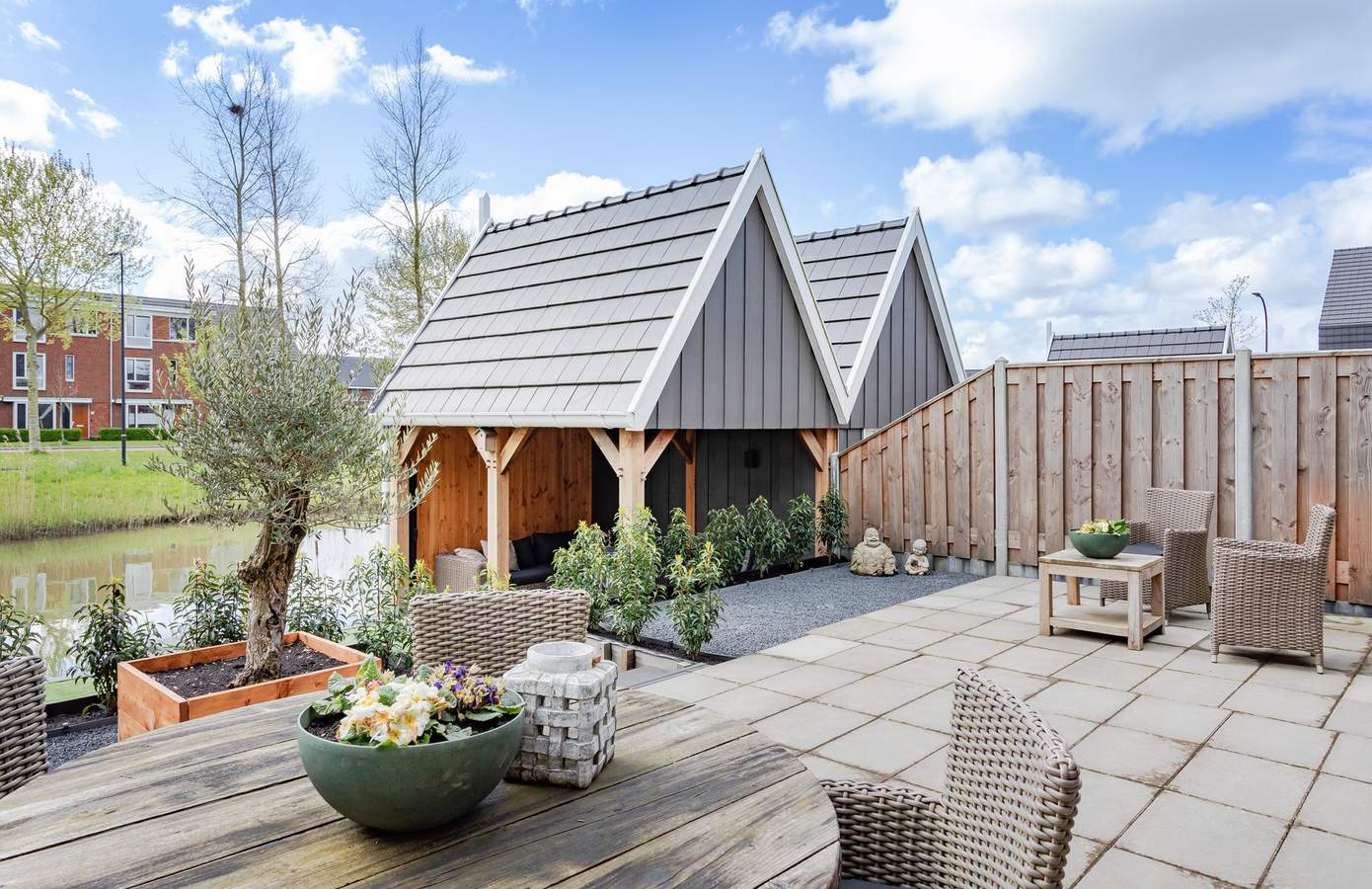 Een fijn pluspunt van deze woning is de achtertuin die op het zuiden ligt en direct aan het water grenst. Hier kunt u de hele dag genieten van de rust en de zon. Het ruime terras aan de woning biedt een perfecte plek om te ontspannen. Via een trap bereikt u het tweede terras aan het water met een sfeervolle veranda. Onder deze moderne veranda kunt u heerlijk zitten, aangenaam in de schaduw en beschermd tegen de wind terwijl u uitkijkt over het water.