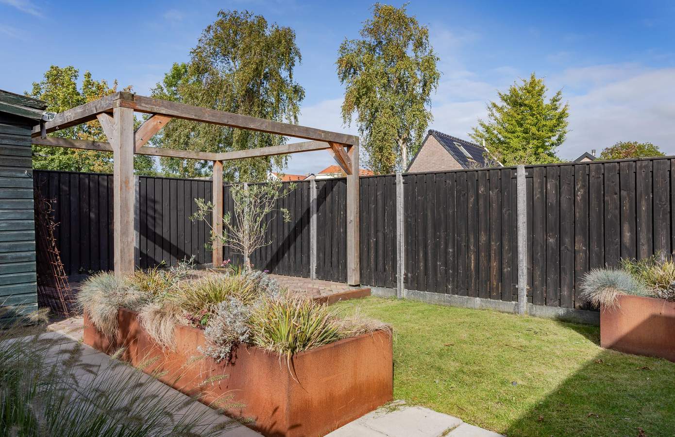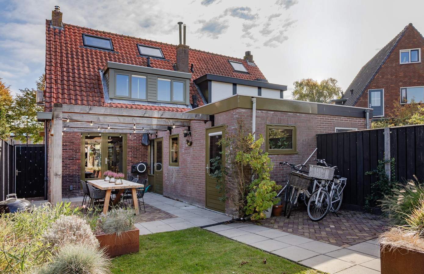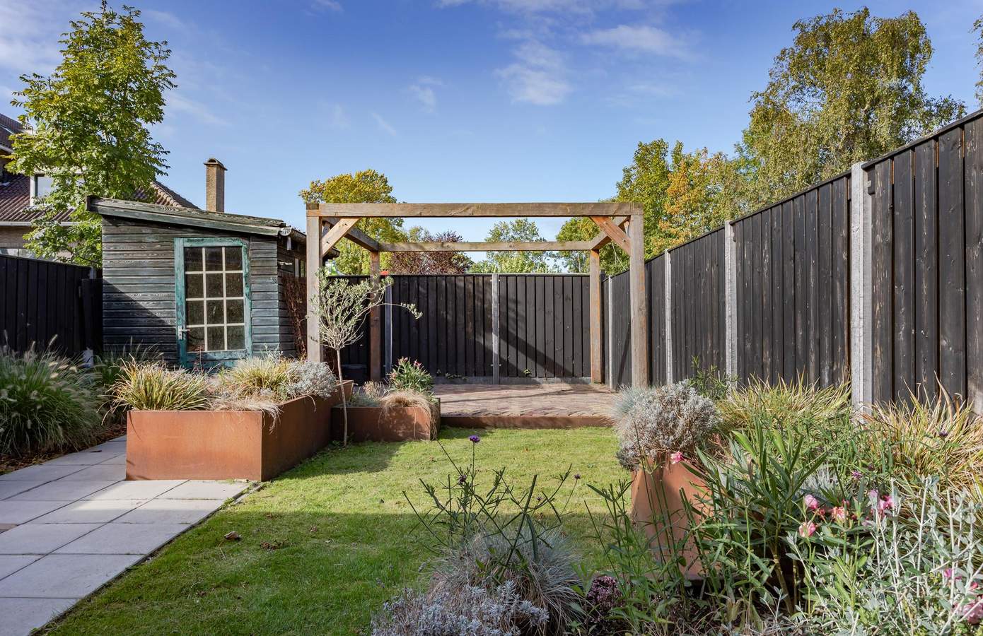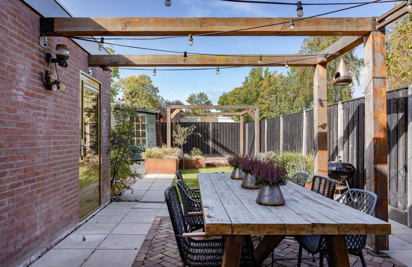 Ook buiten is veel aandacht besteed aan comfort en uitstraling. De achtertuin, opnieuw ingericht in 2021, straalt rust en privacy uit. Met de pergola, schutting en het zonnige terras is dit een fijne plek om lange zomeravonden door te brengen.