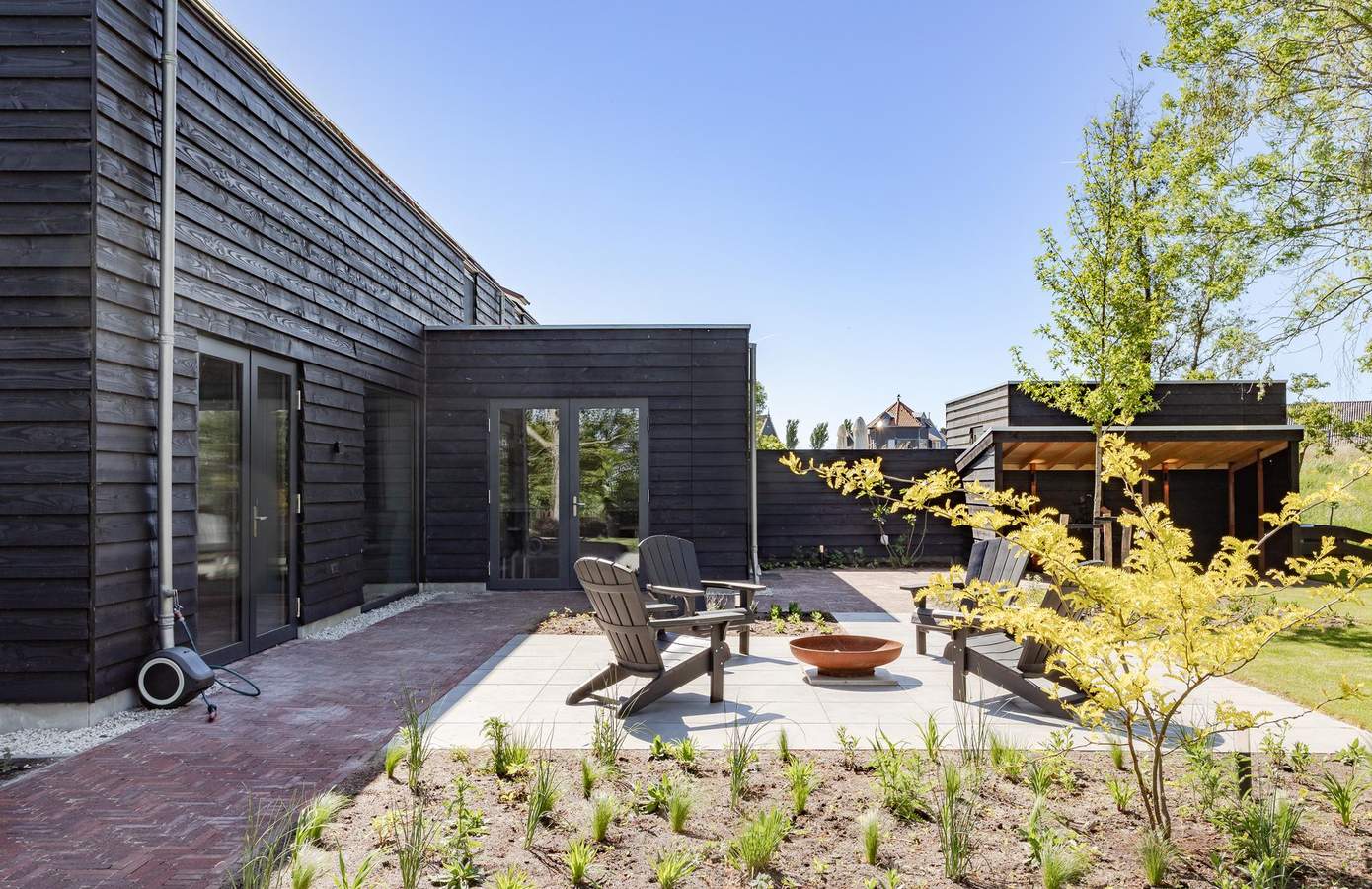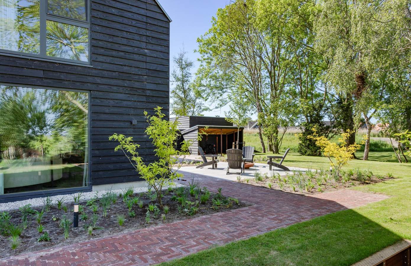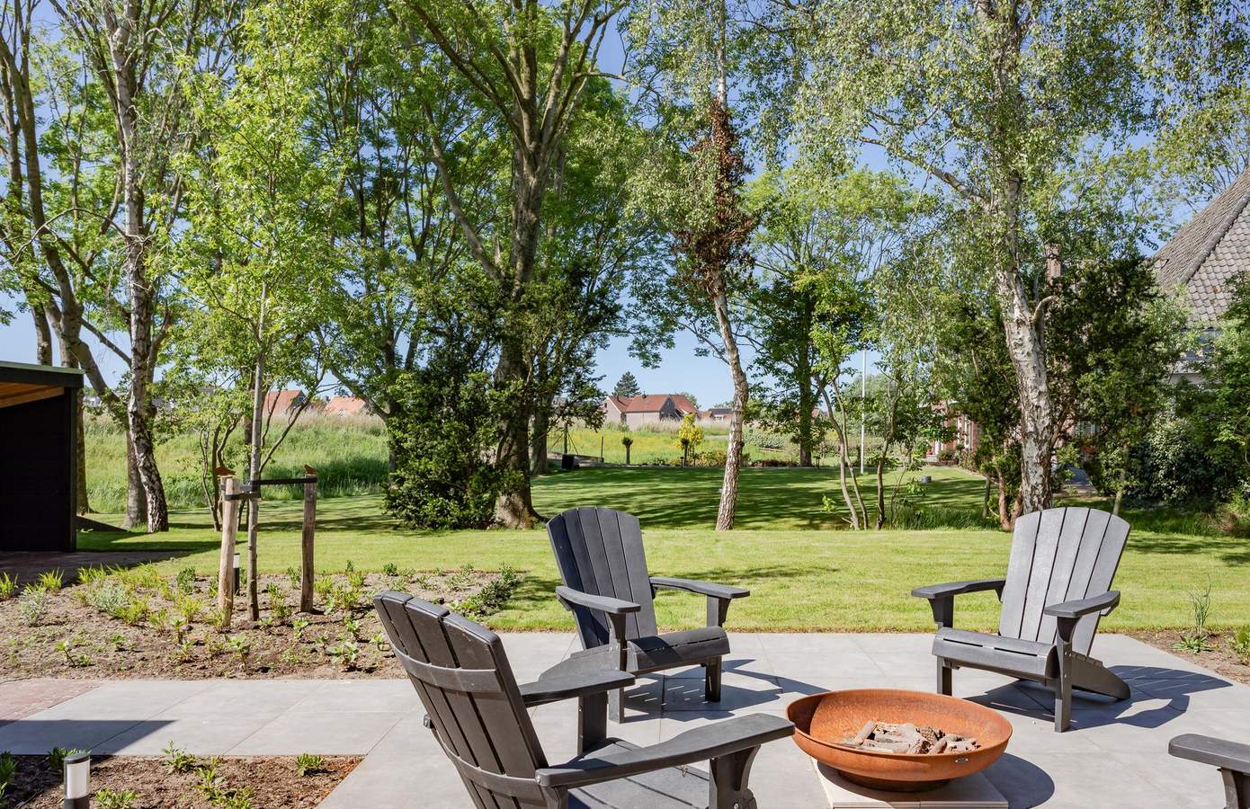 De zijtuin en achtertuin van de woning sluiten naadloos aan op het landelijke karakter van de omgeving. Deze tuin is in 2025 opgeleverd door John Komen hoveniers. Dankzij de grote schuifdeuren vanuit de woonkamer en de keuken loopt u zo het terras op. De volwassen bomen, jonge aanplant en de vrije ligging zorgen voor ultieme privacy en rust. Aan de voorzijde heeft u twee parkeerplaatsen. De zongerichte tuin op het westen biedt ruimte om te loungen, te spelen of te tuinieren – en met een knapperend vuurtje bij de vuurplaats wordt elke avond een moment om naar uit te kijken. In 2024 is er in de achtertuin nog een fietsenschuur geplaatst.