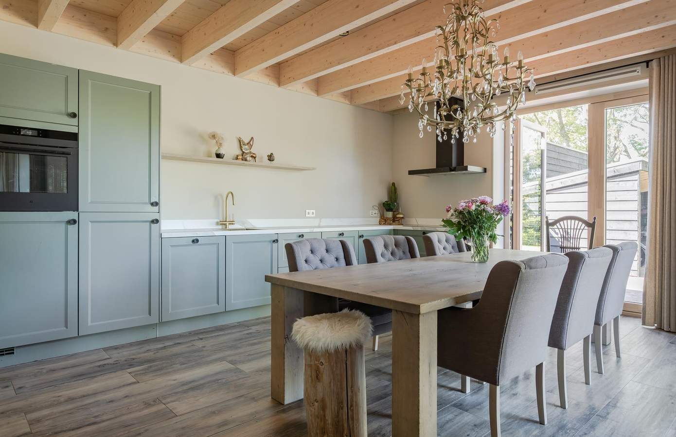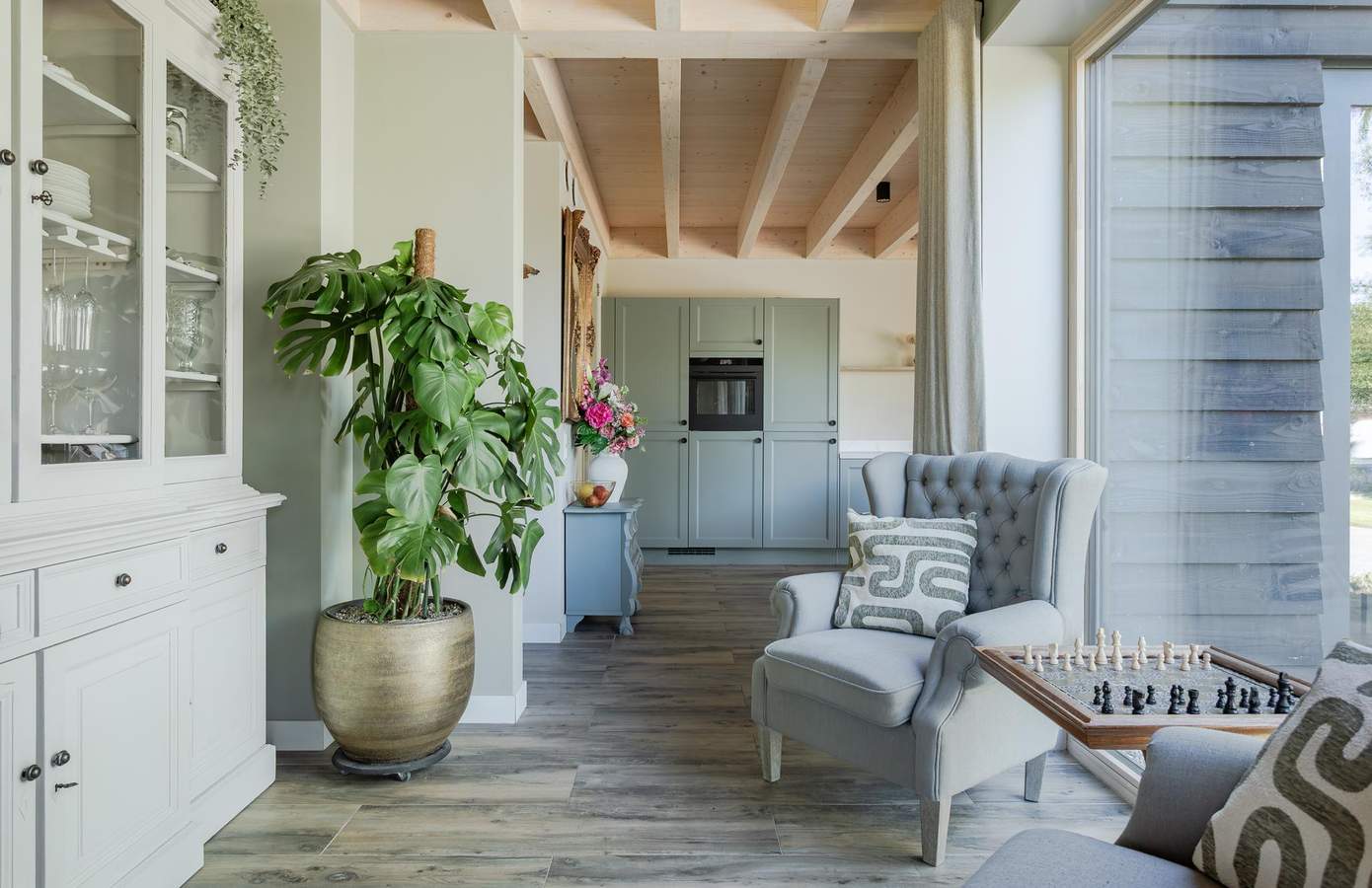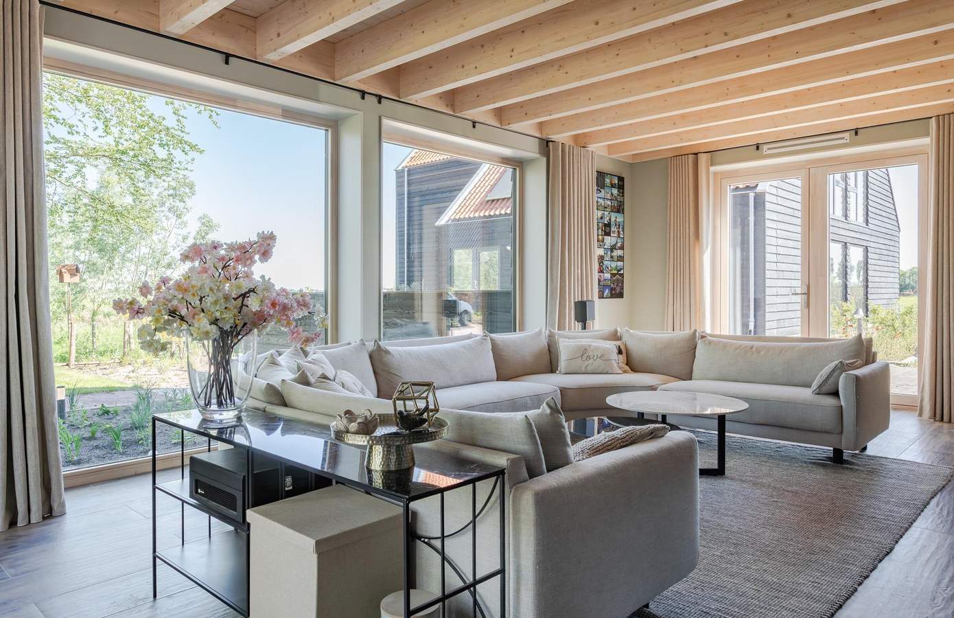 Binnen ervaart u direct de luxe van eenvoud: een royale woonkamer met een houten balkenplafond, grote raampartijen en een sfeervolle verbinding tussen binnen en buiten. De open keuken met aangrenzende bijkeuken en openslaande deuren naar de tuin is praktisch, modern en van alle gemakken voorzien.
