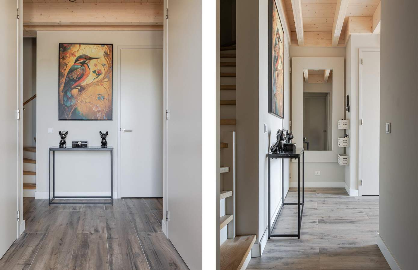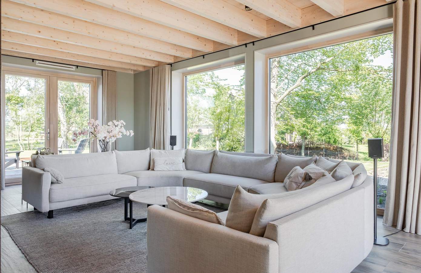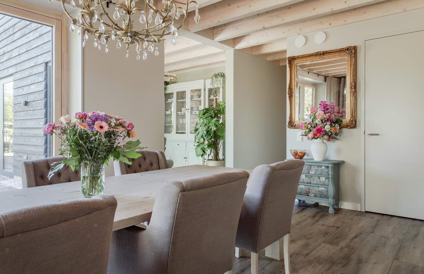 Binnen ervaart u direct de luxe van eenvoud: een royale woonkamer met een houten balkenplafond, grote raampartijen en een sfeervolle verbinding tussen binnen en buiten. De open keuken met aangrenzende bijkeuken en openslaande deuren naar de tuin is praktisch, modern en van alle gemakken voorzien.