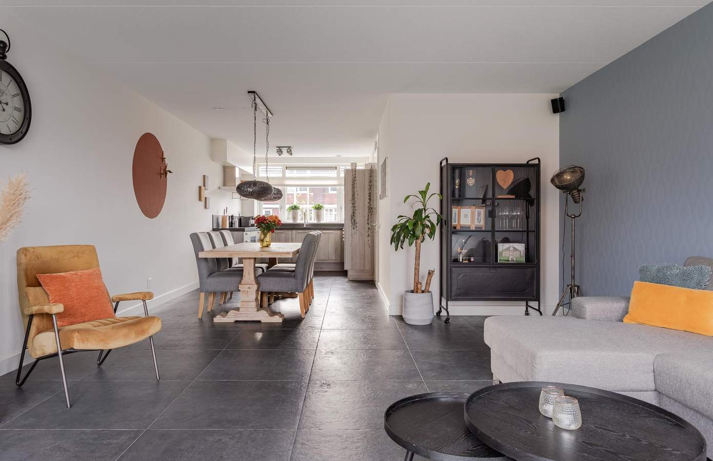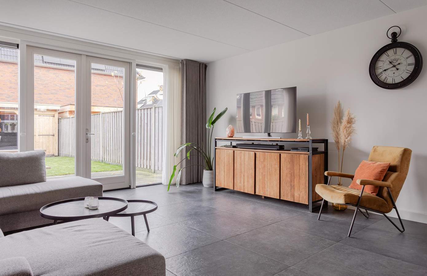 Via de zij-entree betreedt u de woning in een royale hal met toegang tot de toiletruimte, meterkast, diepe provisiekast, de trapopgang en de woonkamer. De woonkamer is opvallend licht dankzij de grote raampartijen, terwijl de tegelvloer met vloerverwarming zorgt voor een aangename basis. Aan de achterzijde verbinden openslaande deuren de woonkamer direct met de tuin. De woonkeuken ligt aan de voorzijde en is voorzien van alle benodigde inbouwapparatuur, waaronder een koel-/vriescombinatie, inductiekookplaat, combi-oven en vaatwasmachine. Vanuit de hal bereikt u tevens de garage, met daarachter een multifunctionele ruimte die dankzij de nette afwerking, verwarming en warmwatervoorziening uitstekend geschikt is als praktijkruimte, thuiswerkplek of salon aan huis.