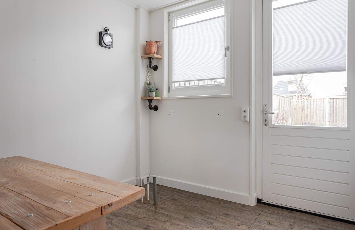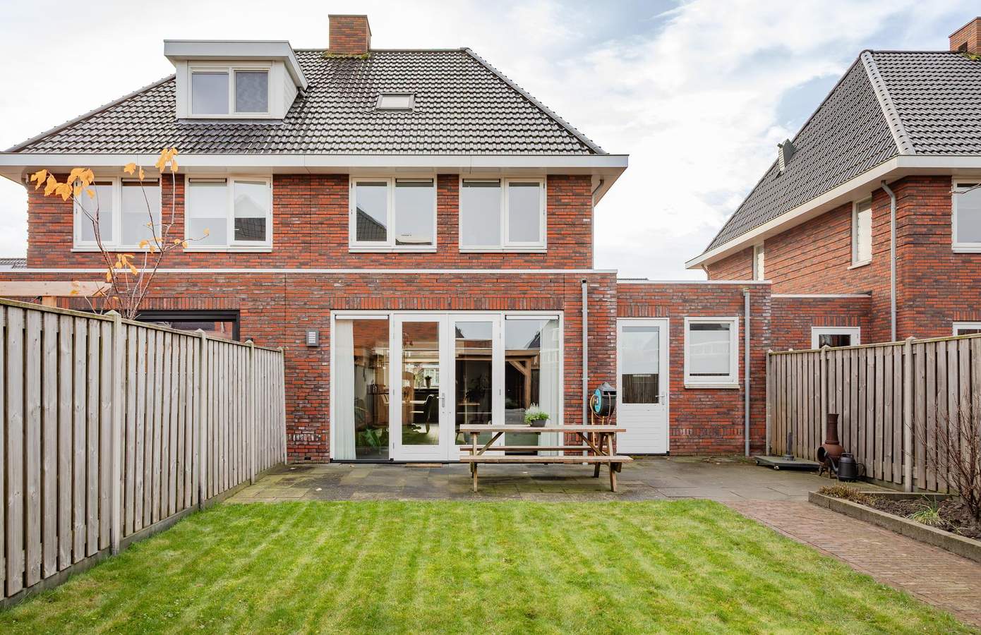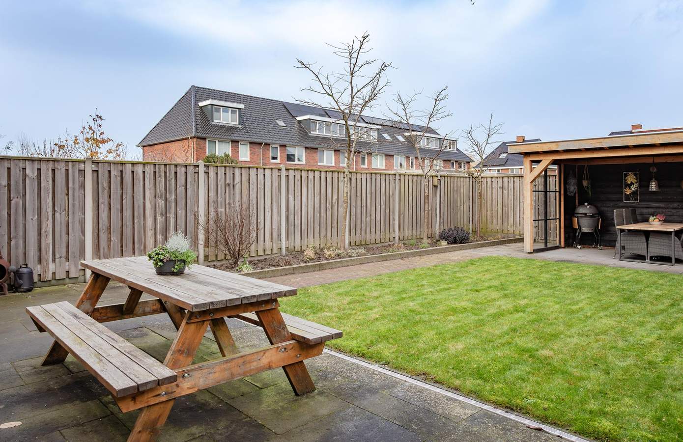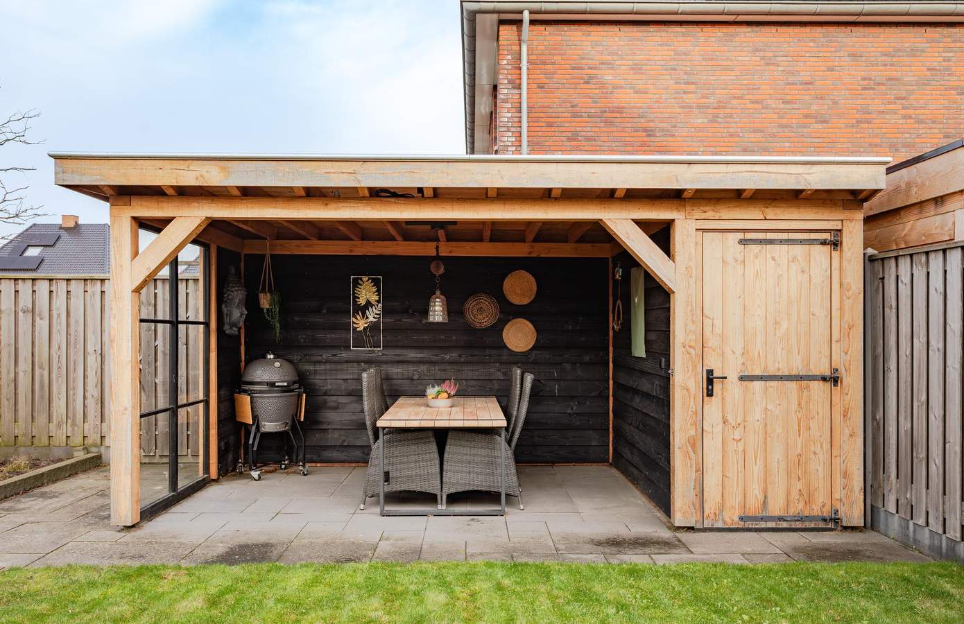 De achtertuin is een fijne plek om het hele jaar door van het buitenleven te genieten. Met een diepte van ruim 14 meter heeft u zowel zon- als schaduwplekken. De tuin is verzorgd aangelegd met een groen gazon, een grote border met vaste beplanting en een ruim terras waar u ontspannen kunt zitten. De blikvanger in de tuin is de fraaie overkapping (2020) met geïntegreerde berging. Een ideale plek voor lange zomeravonden, een loungehoek of een eettafel. De berging biedt daarnaast praktische opbergruimte voor onder andere tuingereedschap en fietsen. Aan de zijkant van de woning vindt u de oprit, waar u op eigen terrein kunt parkeren.