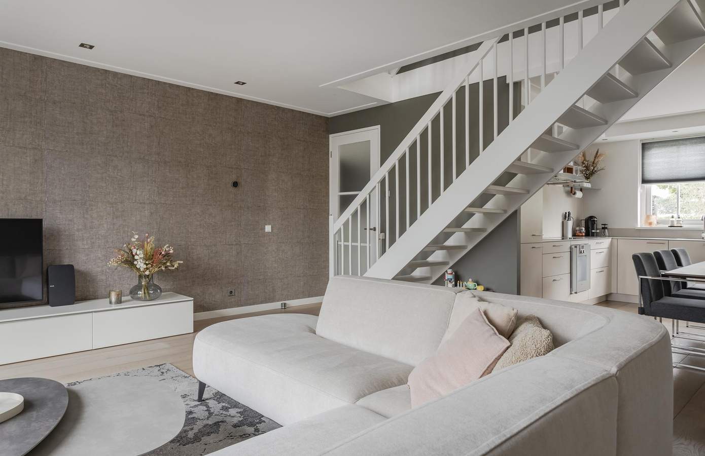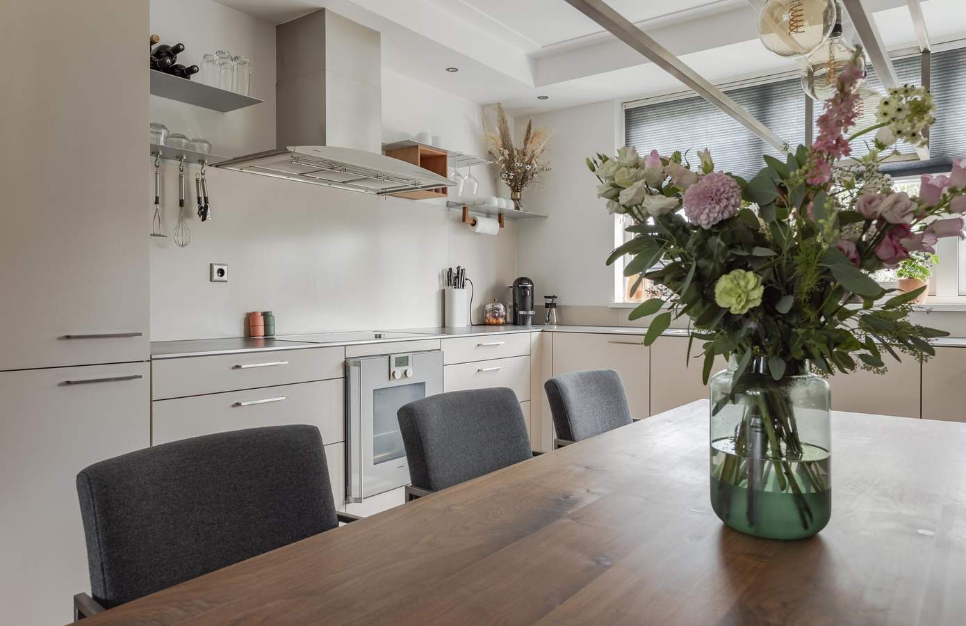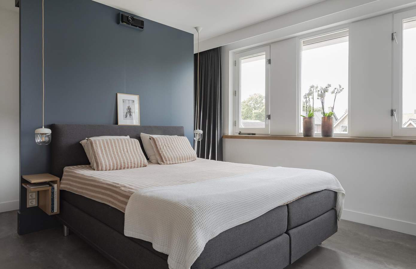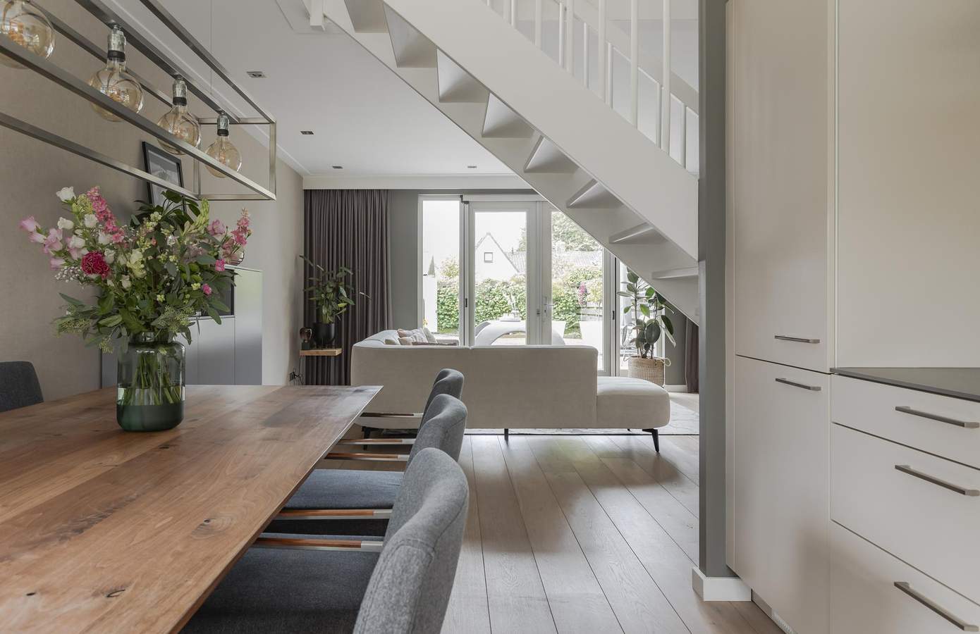 De grote raampartijen zorgen ervoor dat er een weldaad aan natuurlijk licht binnen komt in de living. De open keuken is uitgerust met hoogwaardige Gaggenau-apparatuur, waardoor koken hier een genot wordt. Centraal tussen de living en de keuken bevindt zich de speelse open trap naar de verdieping. Op de verdieping geeft de ruime overloop toegang tot de twee slaapkamers en de luxe badkamer. De badkamer is de perfecte plek om na een drukke (werk-)dag te ontspannen. Er is een fijn ligbad, een ruime inloopdouche, een op maat gemaakt wastafelmeubel met twee ronde waskommen en inbouwkranen, een toilet en vloerverwarming. De master bedroom is aan de achterzijde gelegen. Deze kamer heeft een grote vaste kastenwand. De zolderverdieping is een ware verrassing: een zeer ruime slaapkamer met een grote dakkapel, die volop licht en extra ruimte biedt. De dakkapel is over de gehele breedte van de kamer gesitueerd en heeft de hoogst mogelijke isolatiewaarde en warmte werend glas. Op deze verdieping bevindt zich ook de technische ruimte en de wasmachine-/drogeropstelling. Naast de zeer ruime kamer heeft deze verdieping ook nog veel handige opbergruimte. Kortom, een instapklare woning met een kwalitatief hoogwaardig afwerkingsniveau waar u zich zeker thuis voelt!