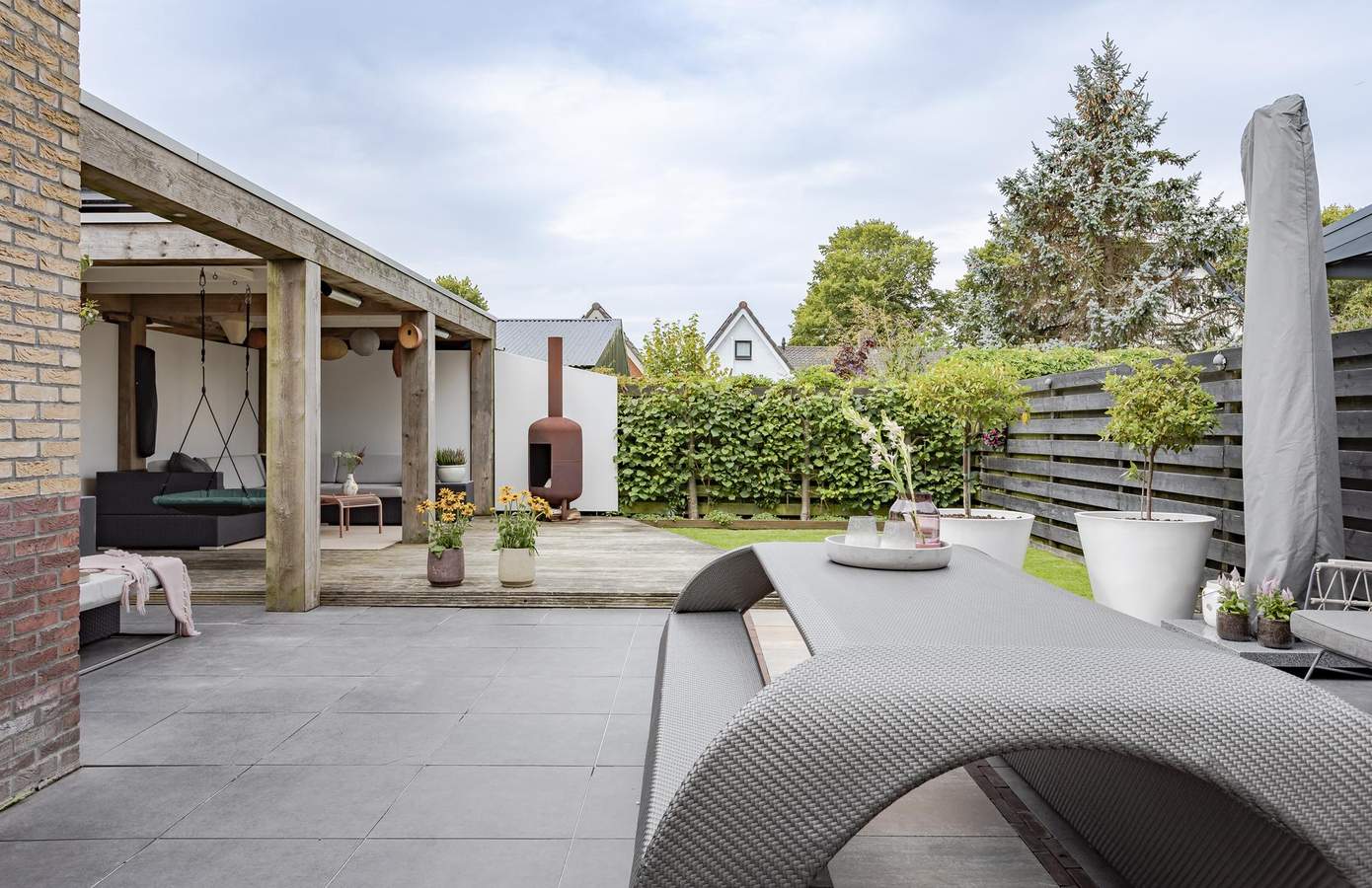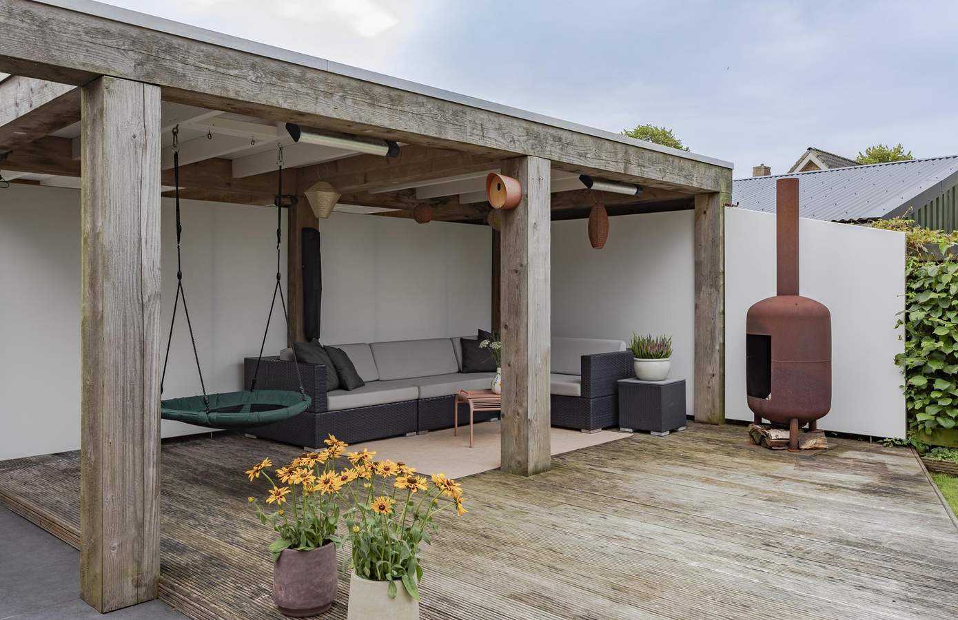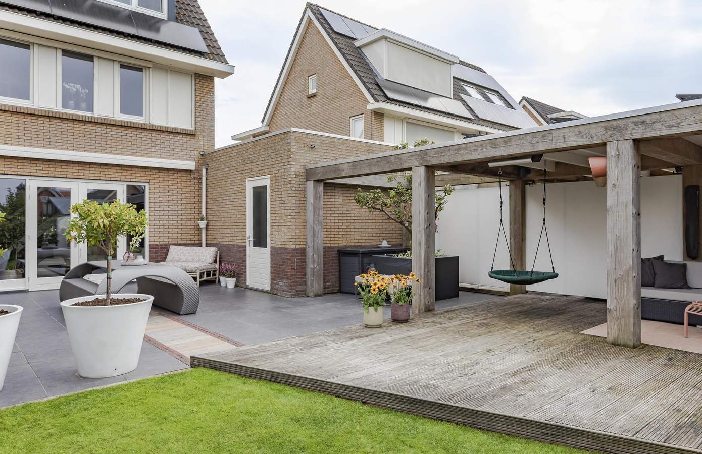 De tuin op het zuidwesten biedt de hele dag zon, hier geniet u in rust en hoort u de vogels fluiten. Onder de robuuste overkapping kunt u in ieder seizoen ontspannen. Door de heaters is het er zelfs op minder zonnige dagen goed vertoeven. Het zonnescherm aan de achterzijde van de woning en de tuinverlichting maken de tuin nog comfortabeler. Op de oprit is plaats voor twee auto’s. Met een handige carport stapt u altijd droog uit de auto. De garage is vanuit de achtertuin én vanuit de carport te bereiken en is met 19 m² zeer ruim te noemen. Momenteel is de garage in gebruik als berging. Deze ruimte is multifunctioneel te gebruiken en kan desgewent omgebouwd worden als bijvoorbeeld kantoor-/werkruimte aan huis.