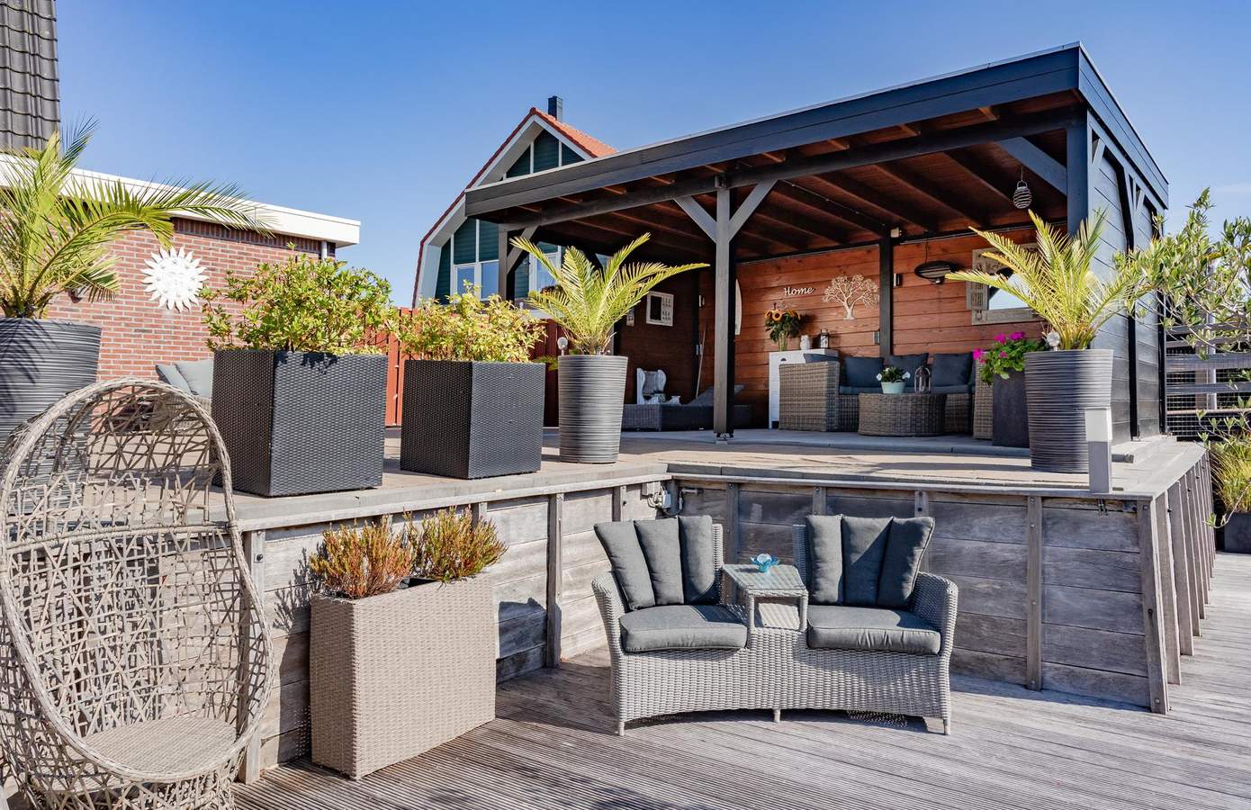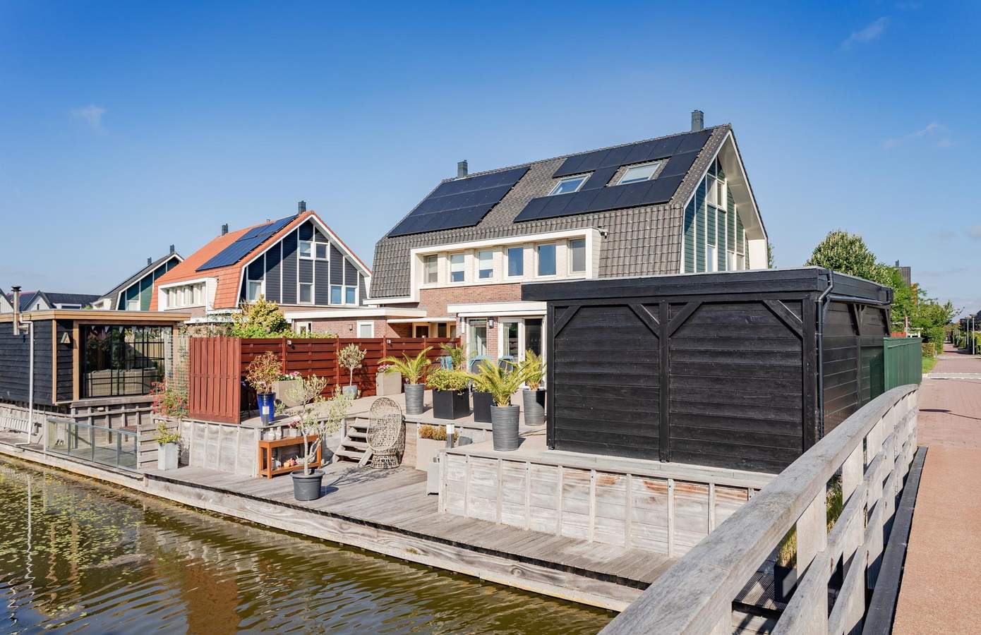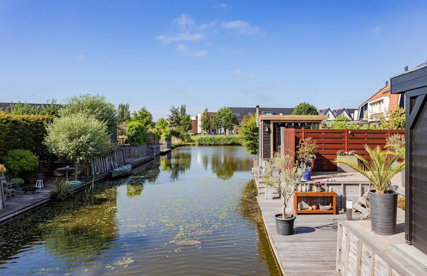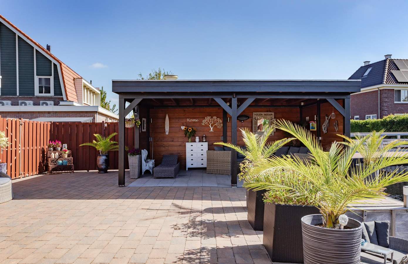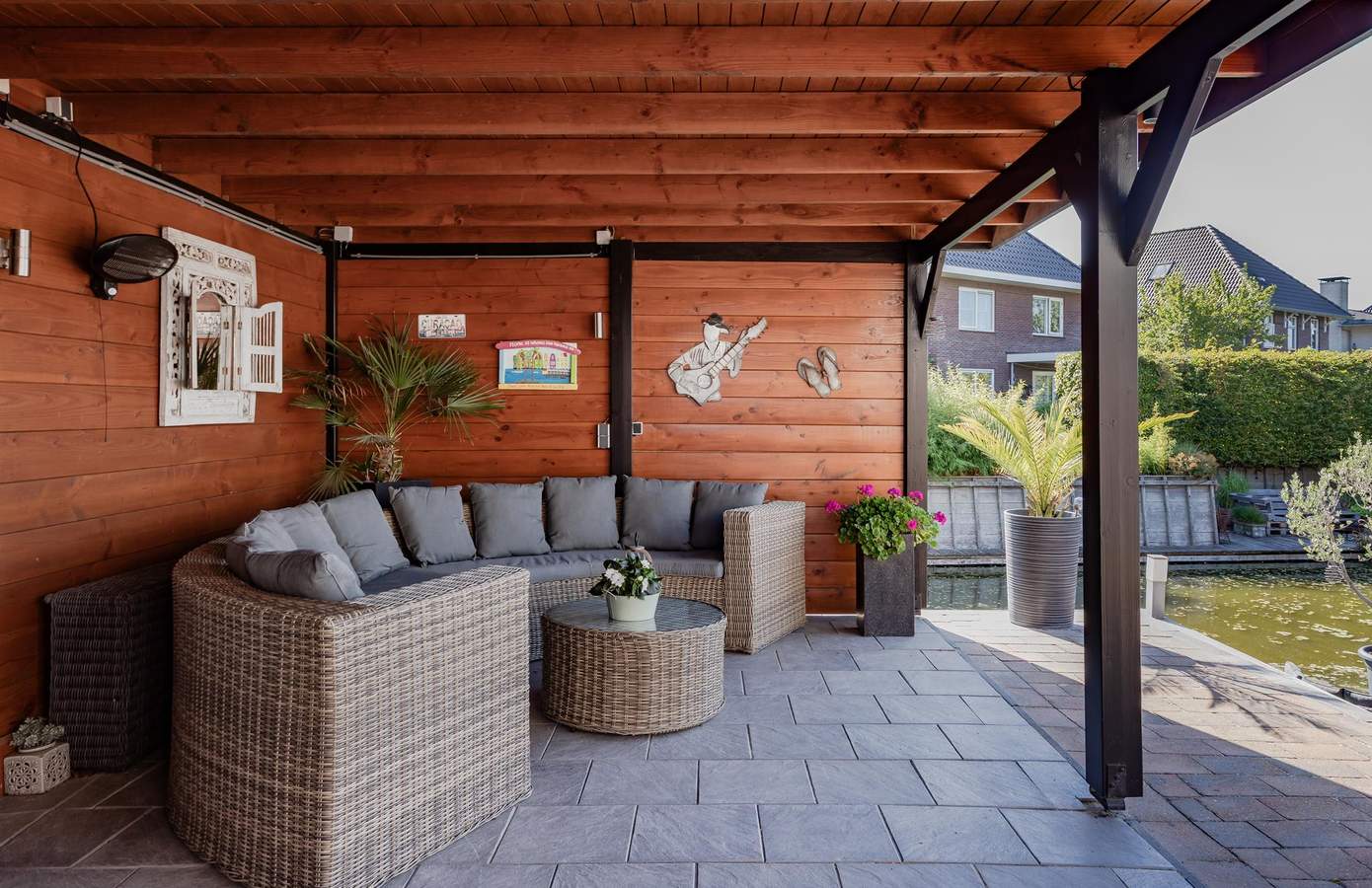 Met de tuin op het zuidoosten is het buitenleven hier werkelijk optimaal. Er is volop ruimte voor een grote eettafel om lange zomeravonden samen te tafelen en een royale lounge-set kunt u hier met gemak kwijt. De fraai aangelegde tuin biedt daarnaast voldoende privacy, zodat u in alle rust kunt genieten. Dat de woning bovendien direct aan het water ligt, maakt dit een fraai decor dat zorgt voor een blijvend vakantiegevoel. De ruime overkapping zorgt voor een beschutte plek op warme en koudere dagen. Het is hier goed vertoeven, van de eerste kop koffie in de ochtend tot de laatste avondzon. Op de oprit heeft u de mogelijkheid om meerdere auto’s op uw eigen erf te parkeren.