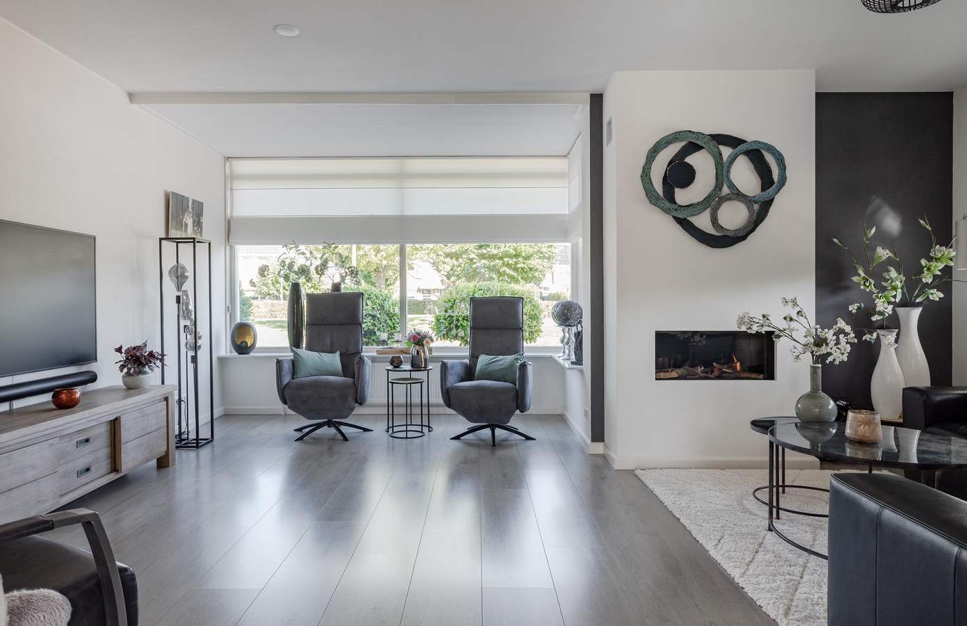 Wanneer u de woning binnenstapt, wordt u verwelkomd in de hal. Vanuit hier loopt u door naar de ruime woonkamer met sfeervolle gashaard. Dankzij de grote ramen en de uitgebouwde eetkamer is het een zeer aangename en lichte ruimte. De openslaande deuren zorgen ervoor dat de tuin een verlengstuk wordt van uw leefruimte. De moderne open keuken sluit hier goed op aan en heeft diverse inbouwapparatuur. Vanuit de keuken bereikt u bovendien direct de ruime garage, die zich perfect leent voor het stallen van de auto, fietsen of als extra bergruimte. Op de eerste verdieping bevinden zich drie comfortabele slaapkamers, elk ruim en licht. De badkamer heeft een ligbad, douche, wastafel en tweede toilet. Via de vaste trap bereikt u de tweede verdieping, waar u verrast wordt door een royale vierde slaapkamer. Deze ruimte biedt volop mogelijkheden, of het nu gaat om een master bedroom of een inspirerende werk- of hobbyruimte. Extra bergruimte en een aparte technische ruimte maken de verdieping compleet.