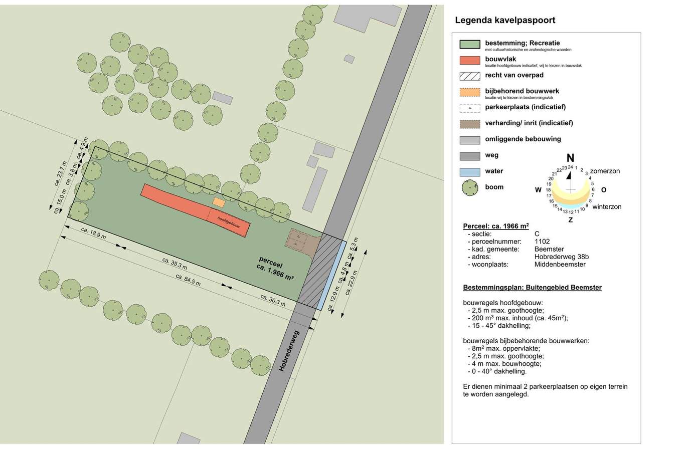 Volgens het bestemmingsplan Buitengebied Beemster heeft het perceel de bestemming Recreatie (met cultuurhistorische en archeologische waarden). Binnen het bouwvlak mag een hoofdgebouw worden gerealiseerd met een maximale goothoogte van 2,5 meter en een maximale inhoud van 200 m³ (circa 45 m²). De toegestane dakhelling bedraagt 15° tot 45°. Daarnaast is er ruimte voor een bijbehorend bouwwerk van maximaal 8 m², met een maximale goothoogte van 2,5 meter en een bouwhoogte van 4 meter (dakhelling 0° tot 40°). Op eigen terrein mogen twee parkeerplaatsen worden aangelegd.