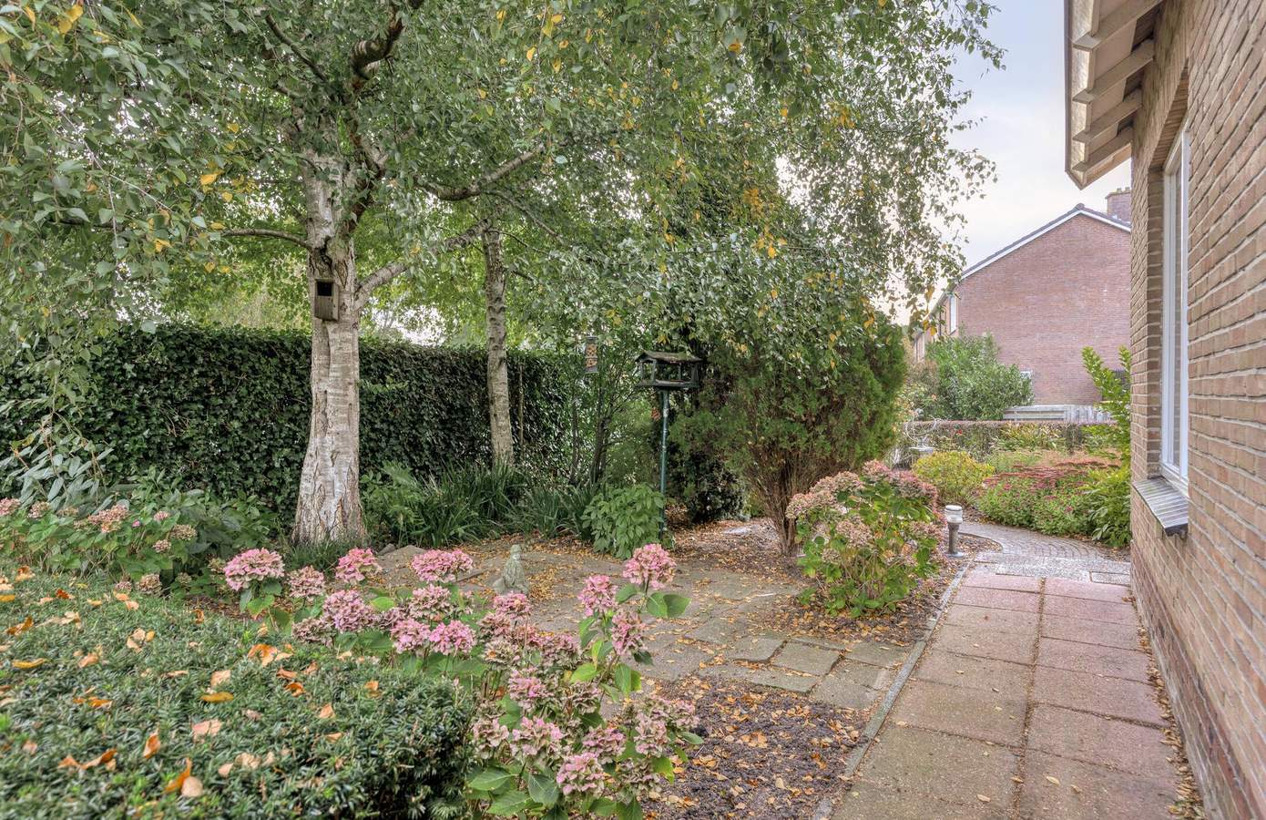 Rondom de woning ligt een met zorg aangelegde tuin op een royaal perceel van 495 m². Aan de voorzijde vindt u een ruime oprit met plek voor meerdere auto’s en een met zorg onderhouden voortuin met wisselende beplanting die de tuin elk seizoen kleur geven. Aan de achterzijde van de woning is een groot terras, hier kunt u beschut zitten. Een heerlijke plek om te ontspannen en te tuinieren.
