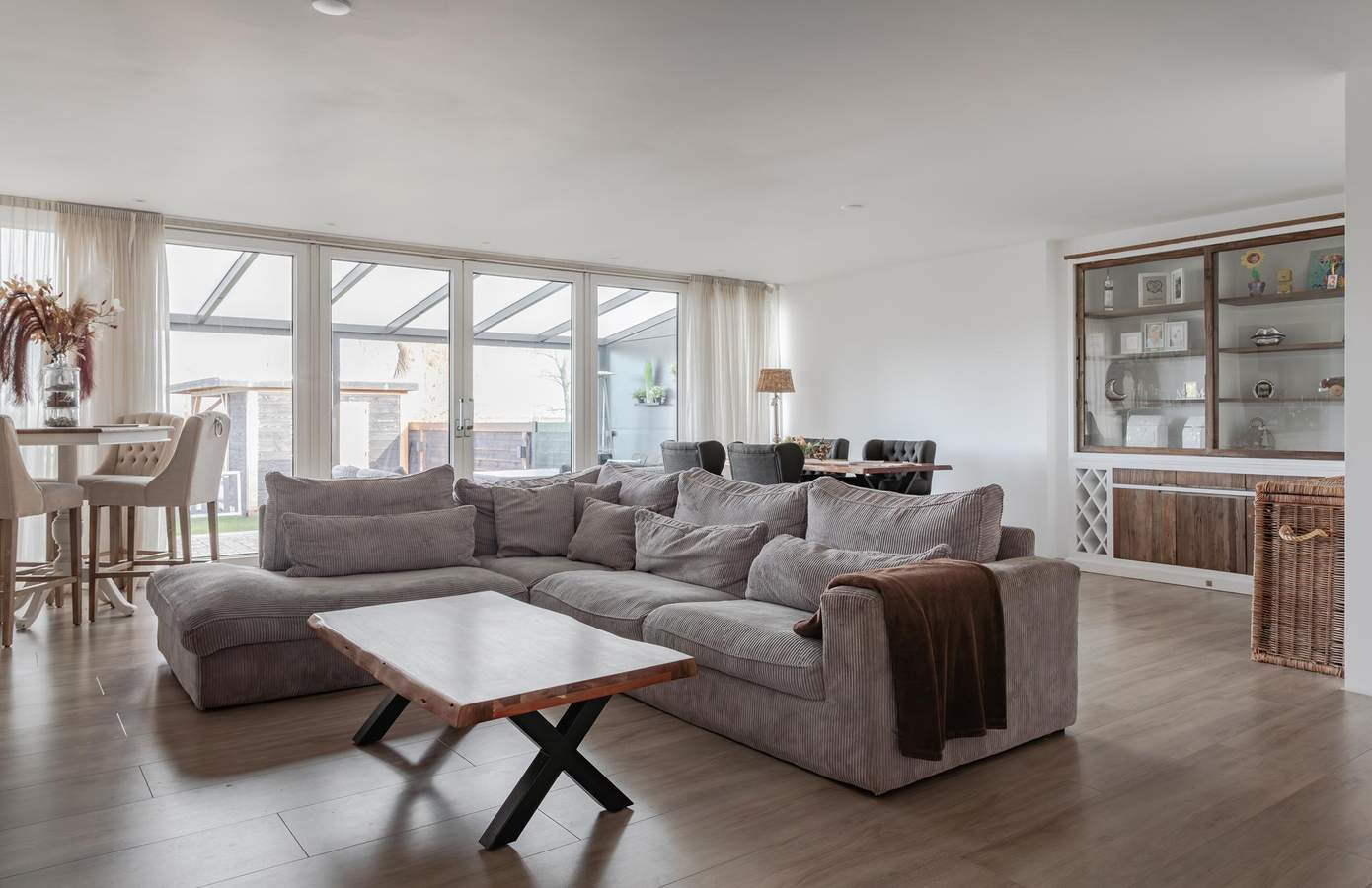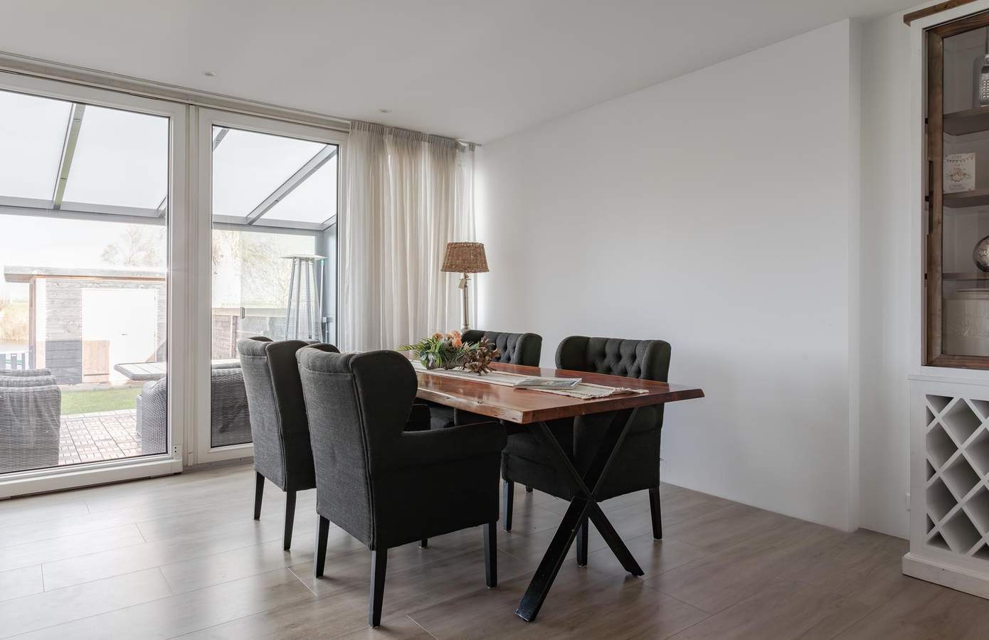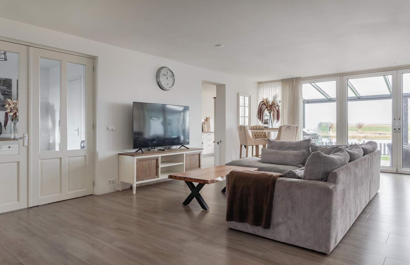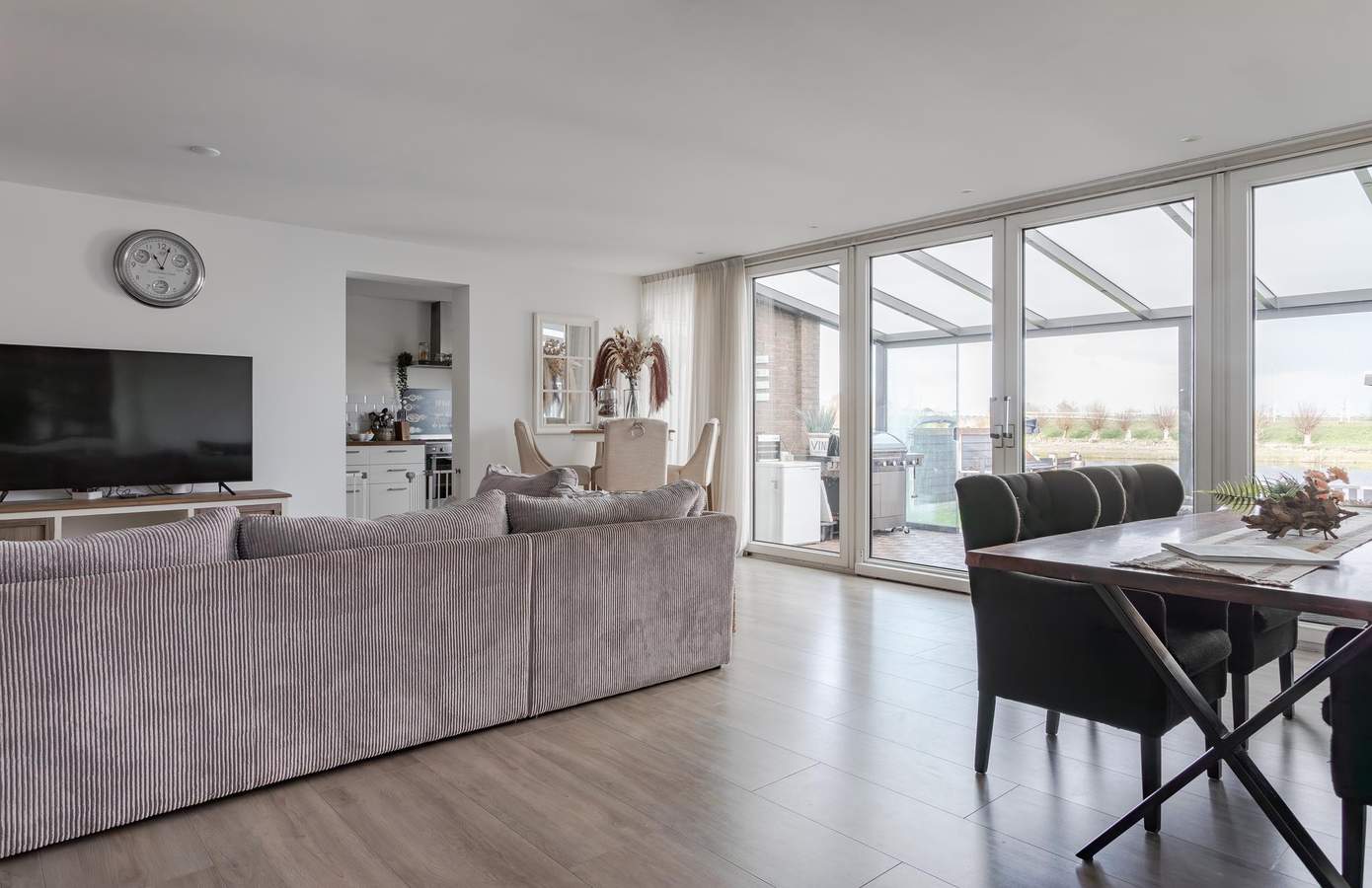 Bij binnenkomst betreedt u de bijzonder ruime hal, praktisch ingedeeld met een ruime garderobe en de toegang tot de toiletruimte. Vanuit de hal heeft u via de dubbele deuren toegang tot een heerlijk ruime woonkamer. De royale woonkamer, mede vergroot door de aangebouwde tuinkamer, ademt licht en ruimte. De grote raampartij met schuifpui zorgt voor een overvloed aan daglicht en biedt een prachtig zicht op de tuin met aangrenzend het doorgaand vaarwater. De keuken sluit perfect aan op de woonkamer. In de keuken is veel bergruimte voor uw kookgerei, kruiden en voorraad. Met de nodige inbouwapparatuur zet u hier binnen een mum van tijd een lekkere maaltijd op tafel. Via de centrale gang komt u in de drie slaapkamers, badkamer, kleedkamer en technische ruimte. Aan de voorzijde van de woning bevinden zich twee ruime slaapkamers, beide met een fijne lichtinval en een aangename indeling. De derde master bedroom, gelegen aan de voorzijde van de woning, heeft een vaste schuifkast en biedt daardoor nog meer opbergmogelijkheden.