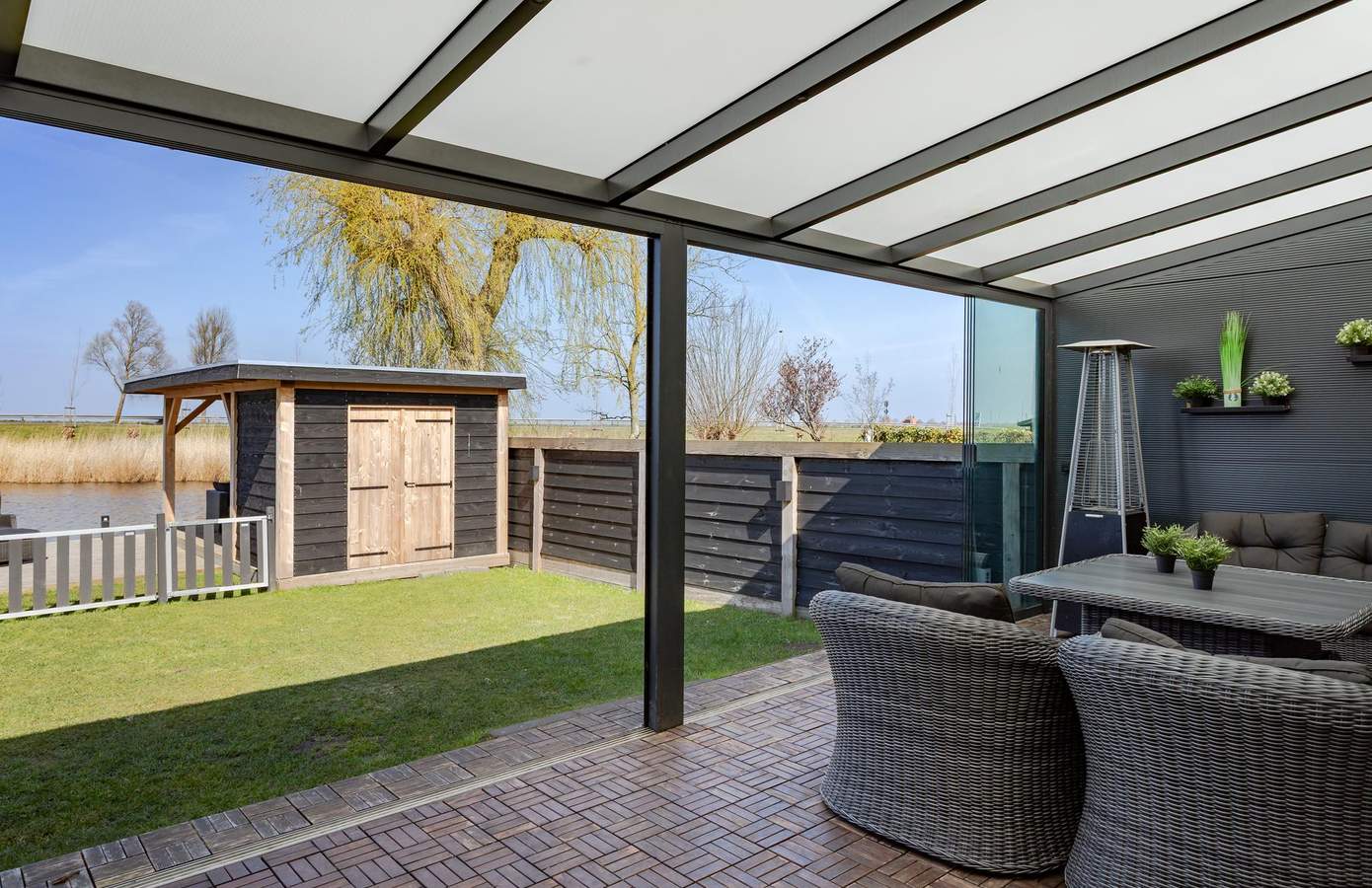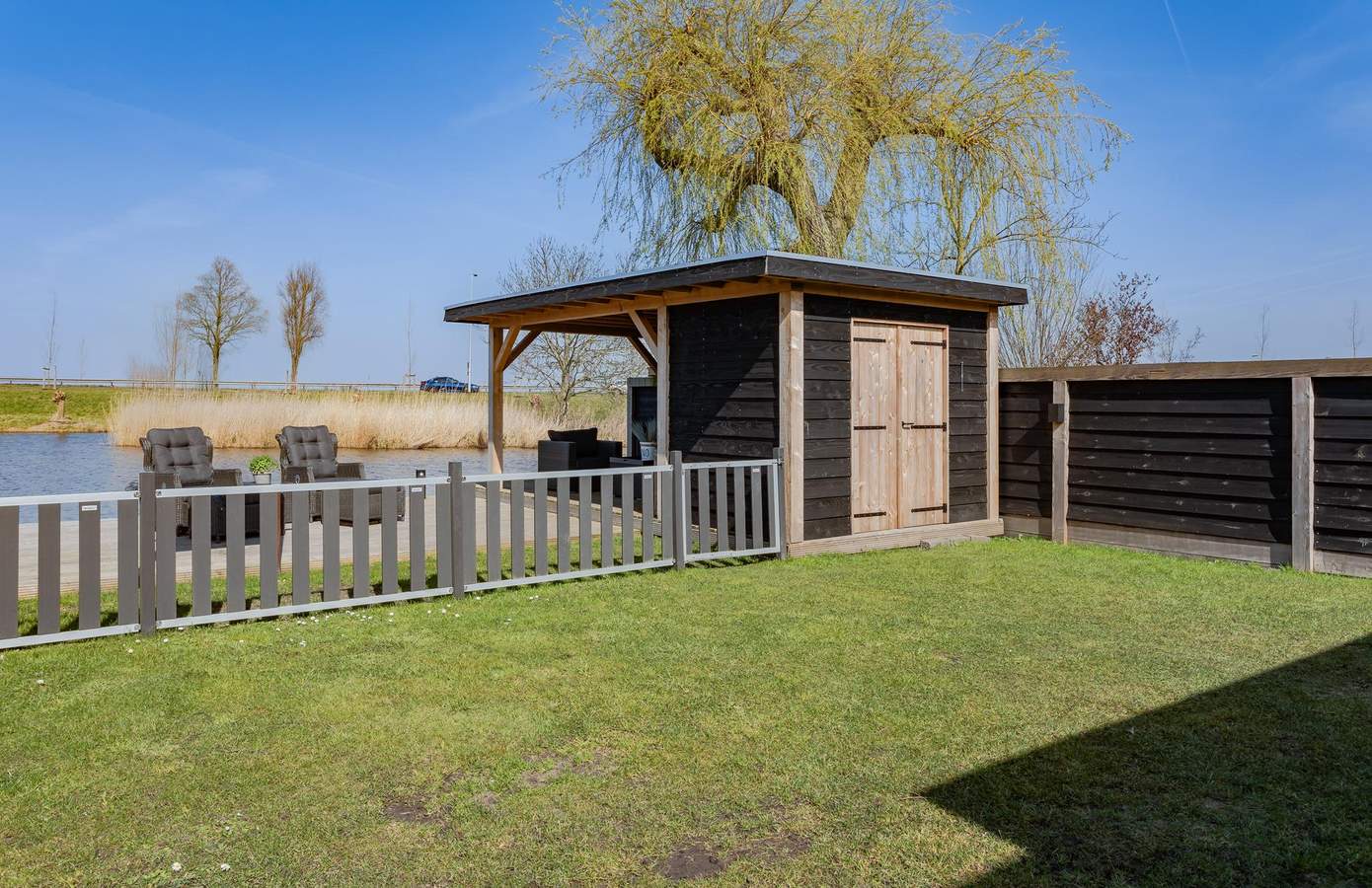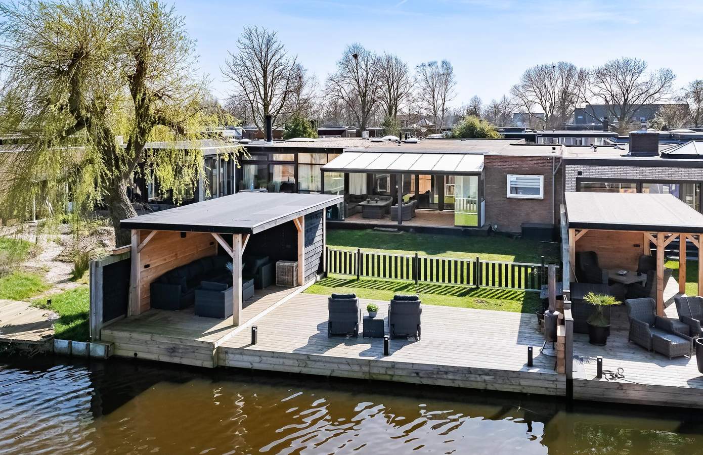 Buiten is er veel ruimte: een grote steiger om uw boot aan te meren, een fraaie vrijstaande overkapping en de riante tuinkamer (met sfeerverlichting) over nagenoeg de gehele breedte van de woning. In de tuin is drainage aangelegd, er zijn nieuwe schuttingen geplaatst en er is een groot gazon aanwezig. Aan de voorzijde, op de oprit, is plek om maximaal twee auto’s te parkeren.