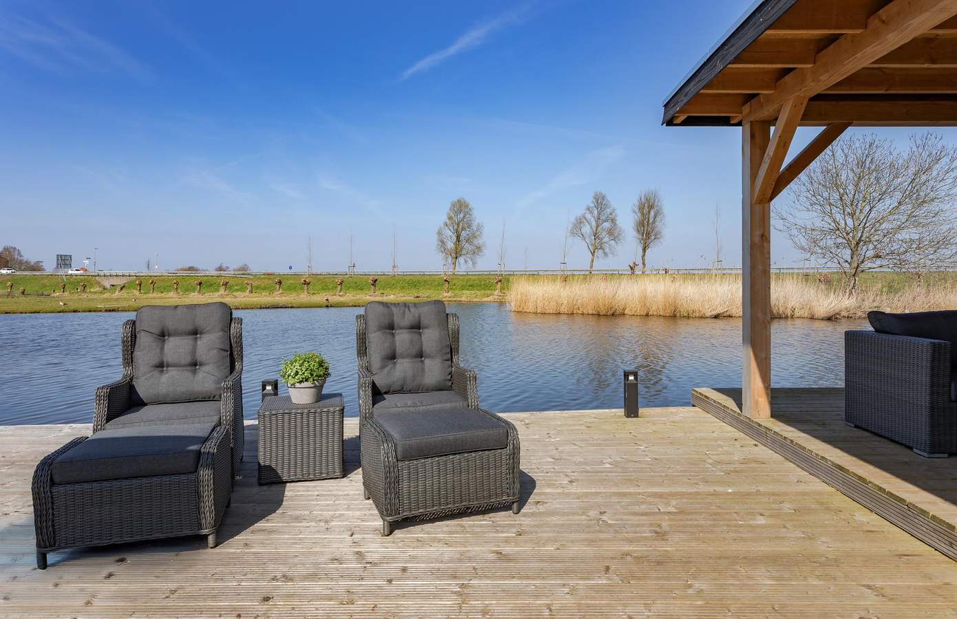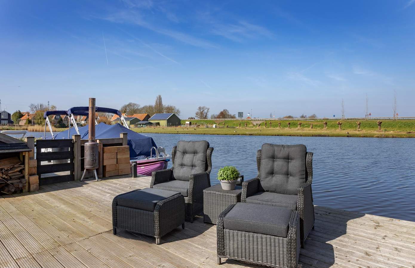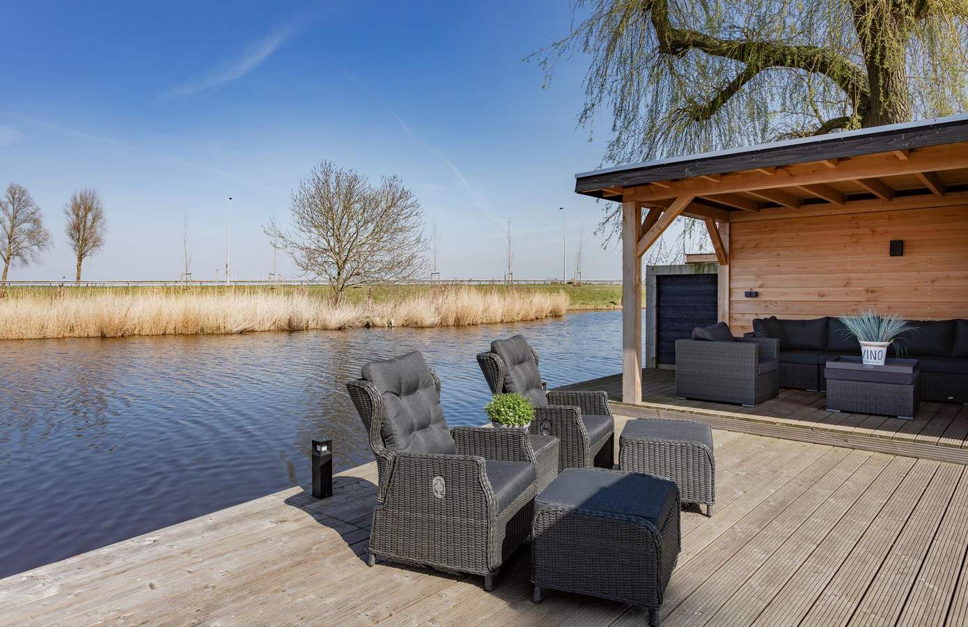 Buiten is er veel ruimte: een grote steiger om uw boot aan te meren, een fraaie vrijstaande overkapping en de riante tuinkamer (met sfeerverlichting) over nagenoeg de gehele breedte van de woning. In de tuin is drainage aangelegd, er zijn nieuwe schuttingen geplaatst en er is een groot gazon aanwezig. Aan de voorzijde, op de oprit, is plek om maximaal twee auto’s te parkeren.