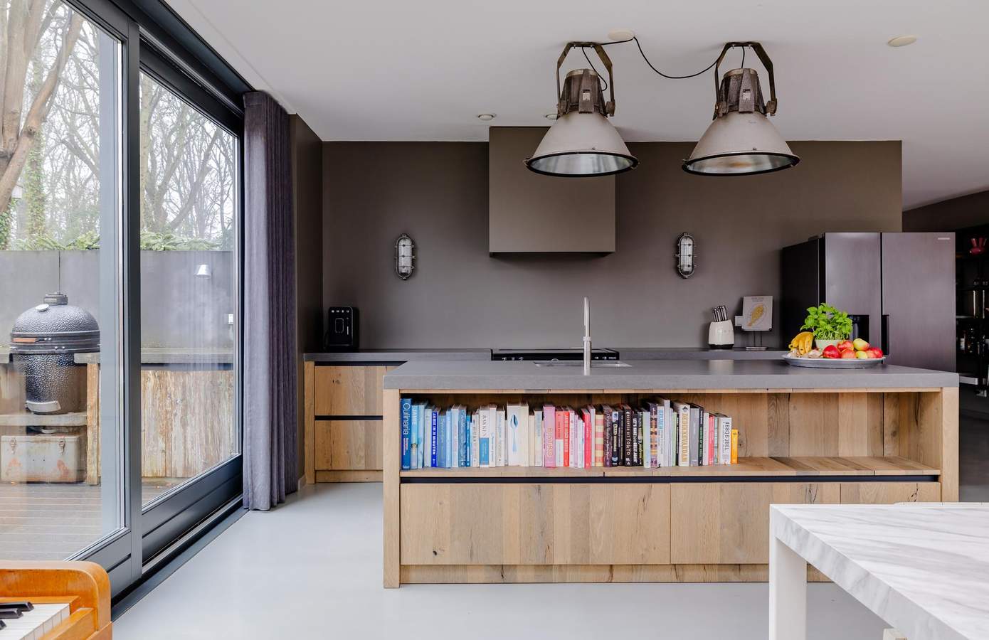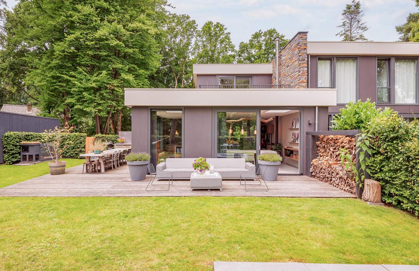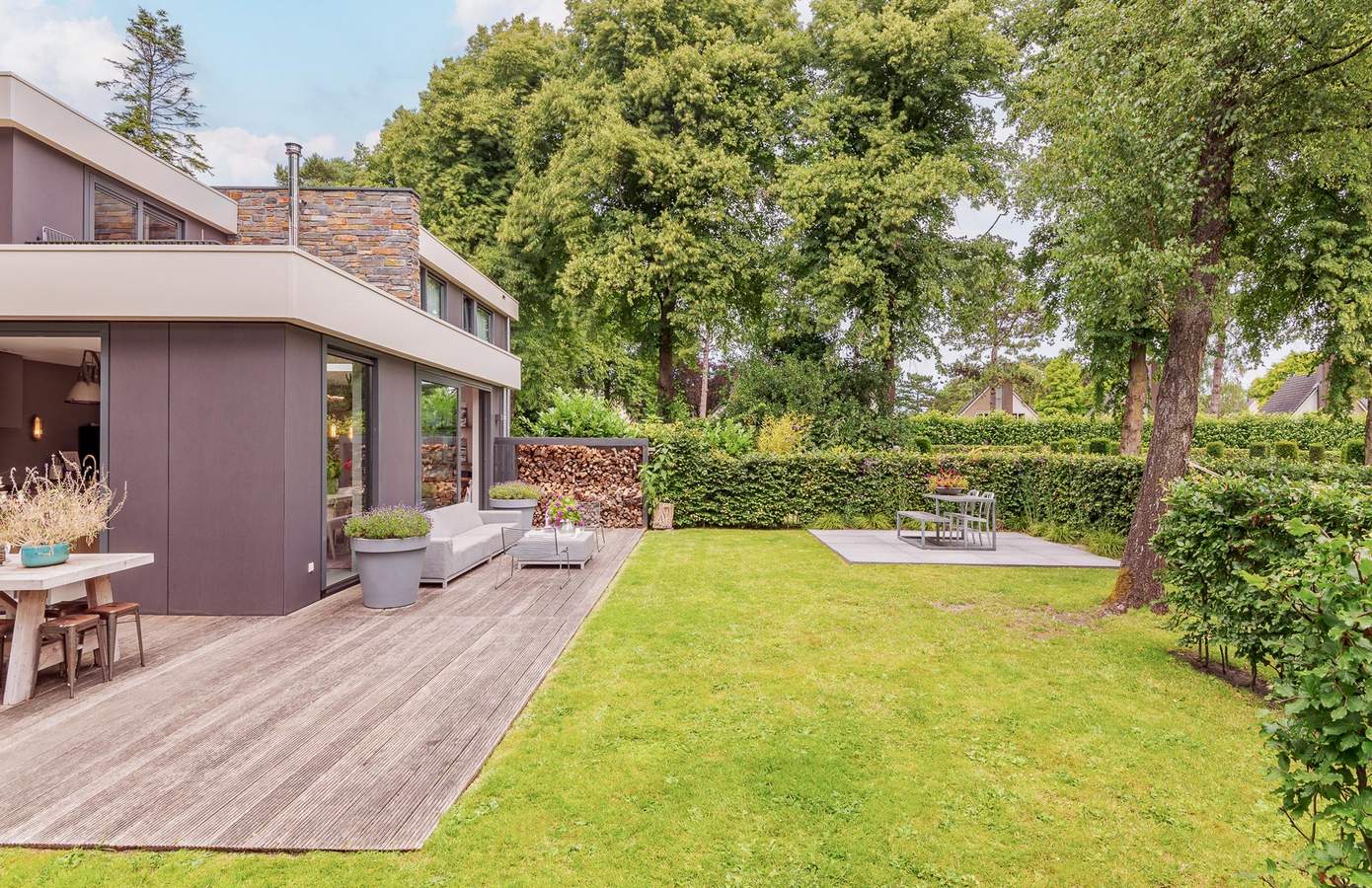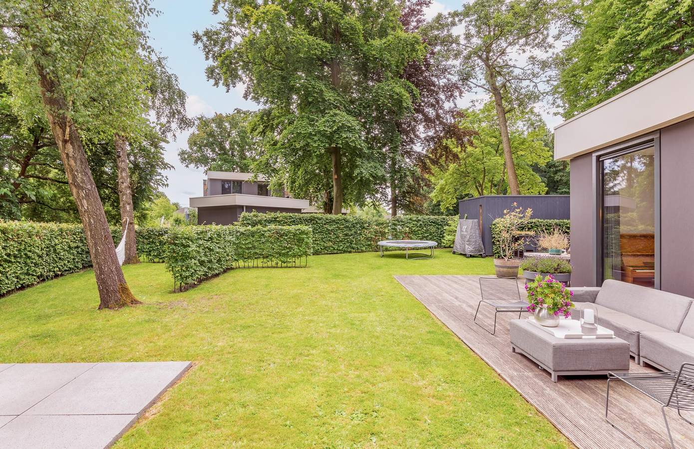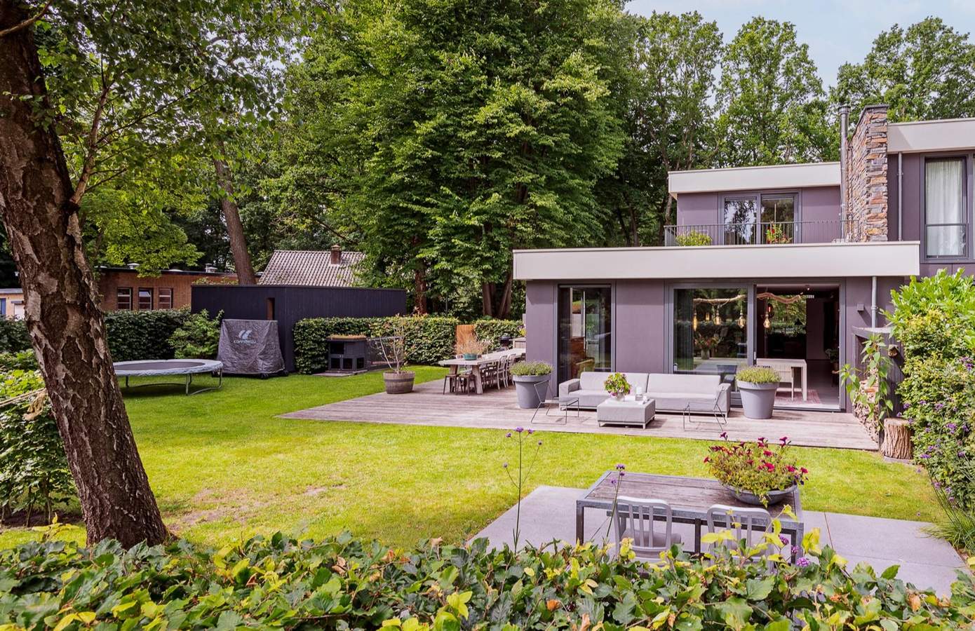 De tuin is luxe aangelegd en vormt een verlengstuk van de woning. Direct aan de leefkeuken ligt een royaal terras met buitenkeuken, een heerlijke plek voor lange zomeravonden met familie en vrienden. Het gazon, de volwassen beplanting en de beschutte ligging zorgen voor privacy en rust. In de tuin bevindt zich een praktische berging voor fietsen en tuingereedschap. Alles is verzorgd en in harmonie met elkaar en de natuurlijke omgeving.