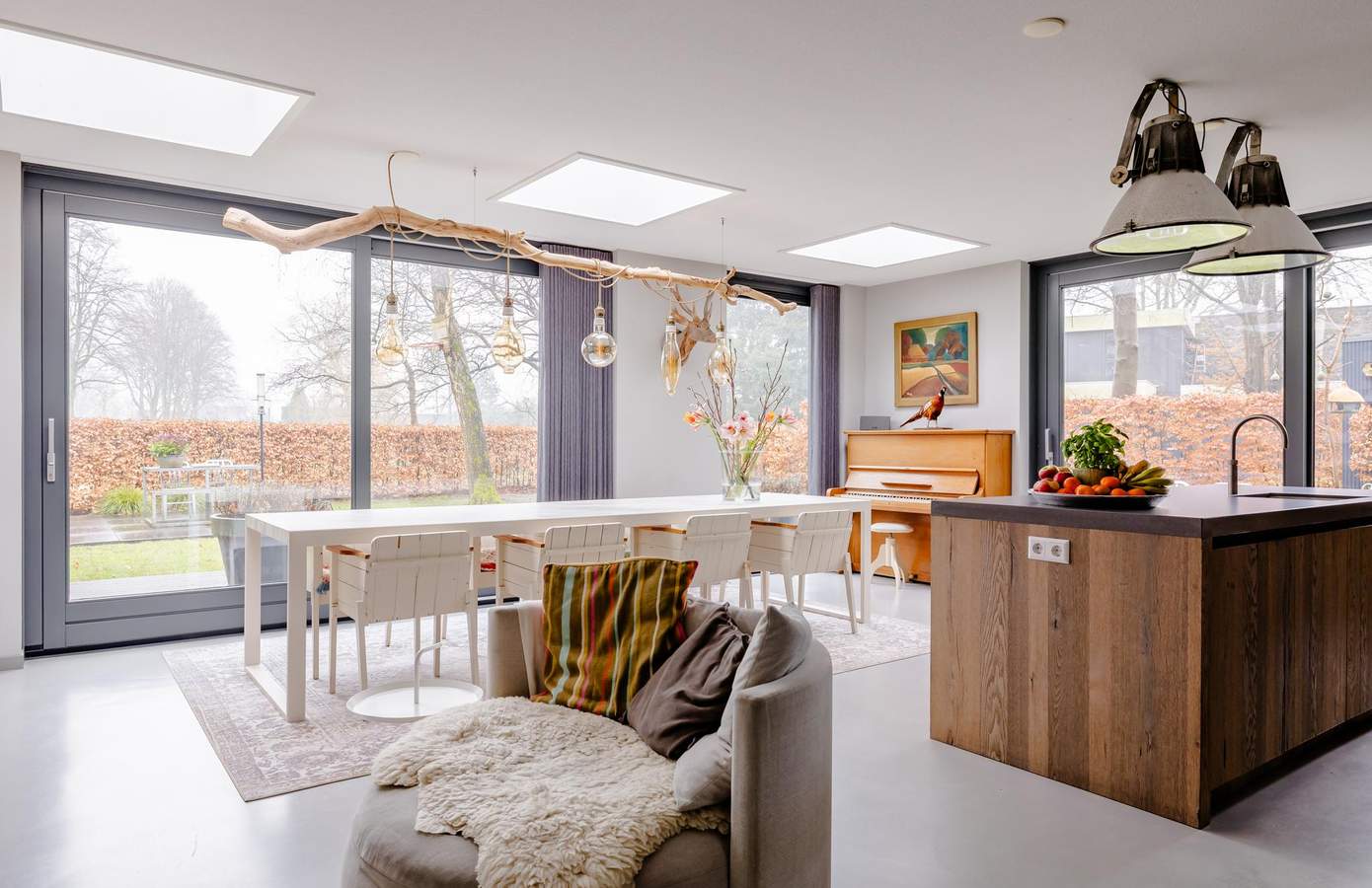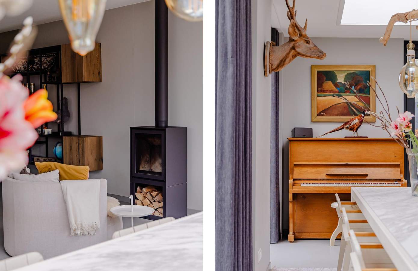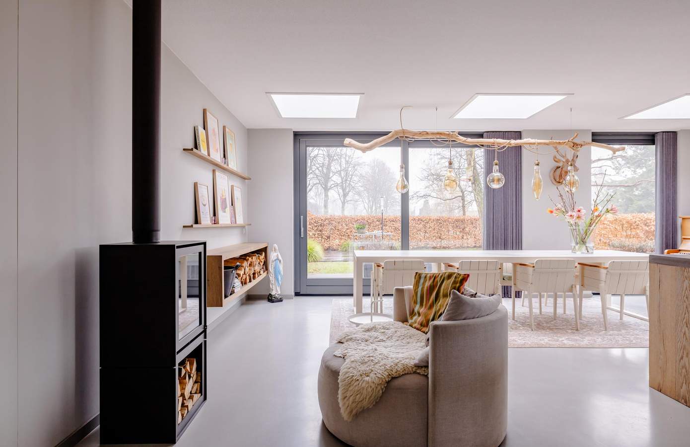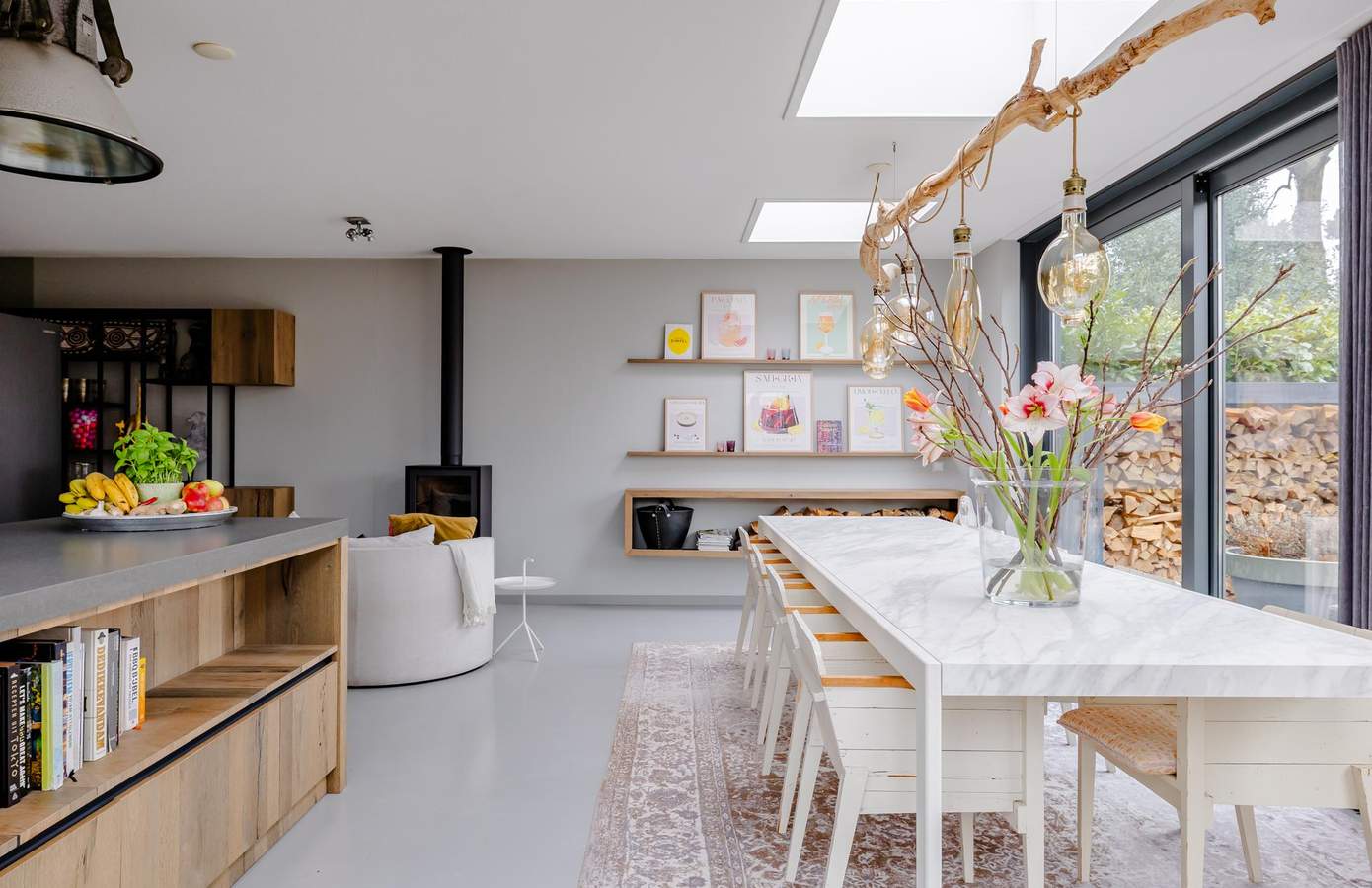 Bij binnenkomst valt gelijk de rustige uitstraling en het prettige daglicht op. De gehele begane grond is uitgevoerd met een strakke gietvloer, die zorgt voor een rustige basis en mooi aansluit bij het moderne karakter van de woning. De royale leefkeuken vormt het hart van het huis. Voorzien van een fornuis met inductiekookplaat, een Quooker en vaatwasser. Grote raampartijen en een schuifpui verbinden binnen met de tuin. De houtkachel zorgt voor extra sfeer in de wintermaanden. De woonkamer, gelegen aan de voorzijde, is een sfeervolle hoek, ook weer voorzien van grote raampartijen. Op de begane grond vindt u een slaapkamer met eigen badkamer, geschikt voor gelijkvloers wonen, maar eventueel ook voor gasten.