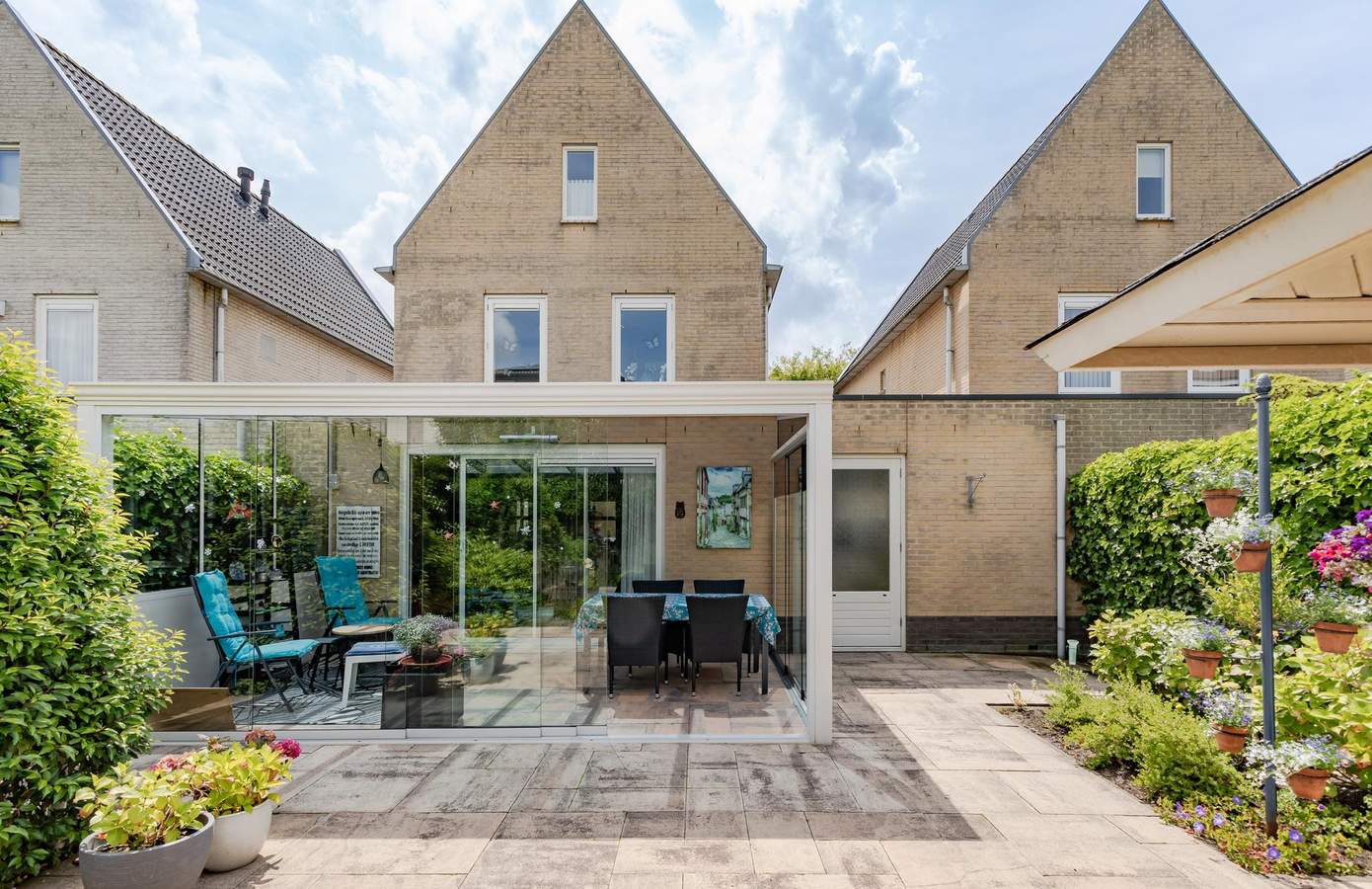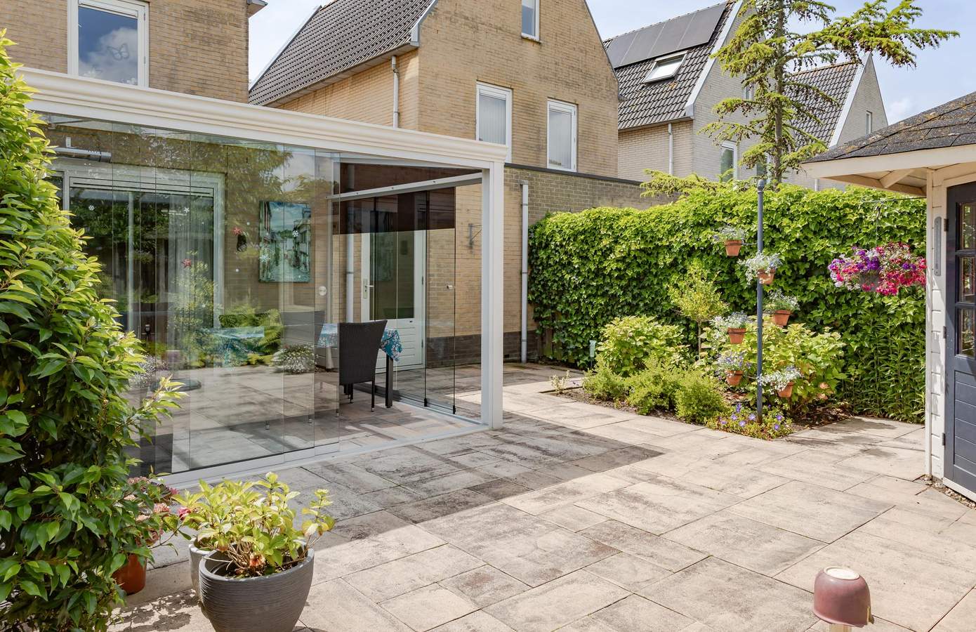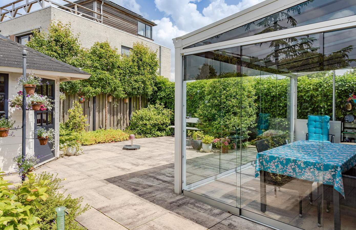 Wie wil dat nou niet? Een tuin waar u het hele jaar door van kunt genieten. Of het nu regent, koud is, waait of de zon schijnt, u kunt altijd heerlijk gebruikmaken van de tuin dankzij de fijne glazen tuinkamer. De tuinkamer is volledig voorzien van glas en alle wanden kunnen worden opengeschoven. Met verlichting en heaters is dit een comfortabel verlengstuk van de woning. De tuin zelf heeft mooie bloemenperken, ligt beschut en is goed onderhouden. Daarnaast is er een handig tuinhuisje voor het opbergen van uw tuinspullen. De voortuin ligt aan een straat met alleen bestemmingsverkeer, waar u uw auto droog kunt parkeren onder uw eigen carport. Vanaf daar kunt u direct naar de garage of naar de voordeur.