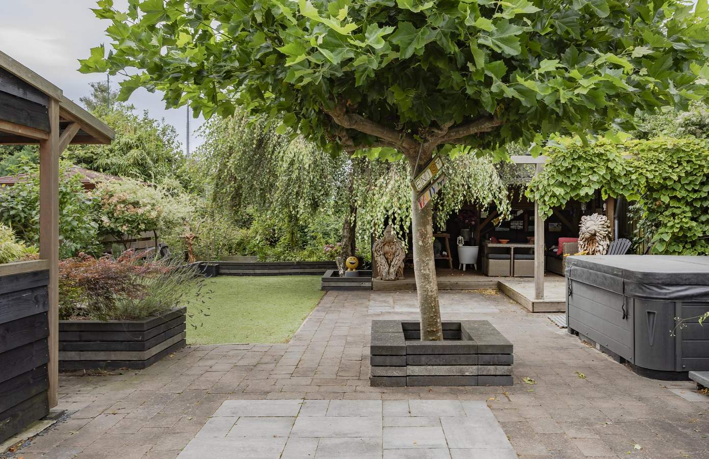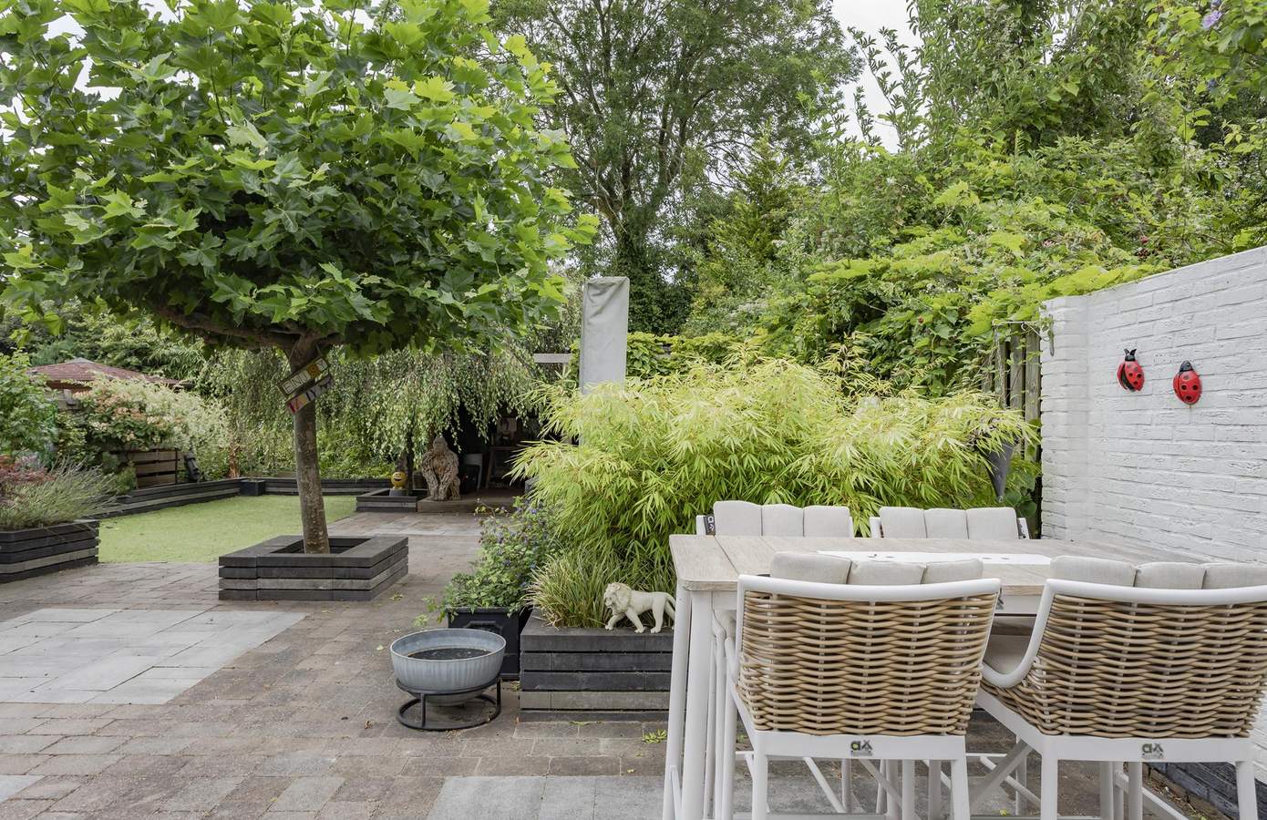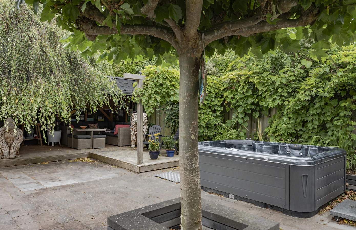 Deze woning staat op een ruim perceel van 341m² en heeft een grote achtertuin op het zonnige zuidwesten. Dankzij het groen aan de achterzijde is er geen inkijk en ervaart u volop privacy. Hier kunt u de hele dag van de zon genieten dankzij de verschillende zitplekjes verspreid door de tuin. Direct aan de woning is een comfortabele terrasoverkapping, en verder achterin de tuin vindt u een ruime overkapping, momenteel ingericht met een sfeervolle buitenhaard en heaters, waar u ook in de koelere maanden van het buitenleven kunt genieten. Voor liefhebbers van barbecueën is er een plek ingericht voor een buitenkeuken. Vanuit de achtertuin heeft u ook directe toegang tot de salon, wat het gebruik van de woning en tuin extra veelzijdig maakt. De tuin biedt veel privacy, comfort en luxe, en is perfect voor elk seizoen.