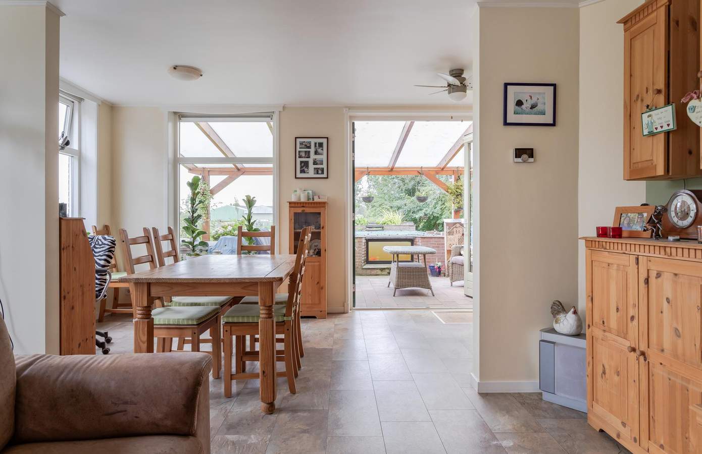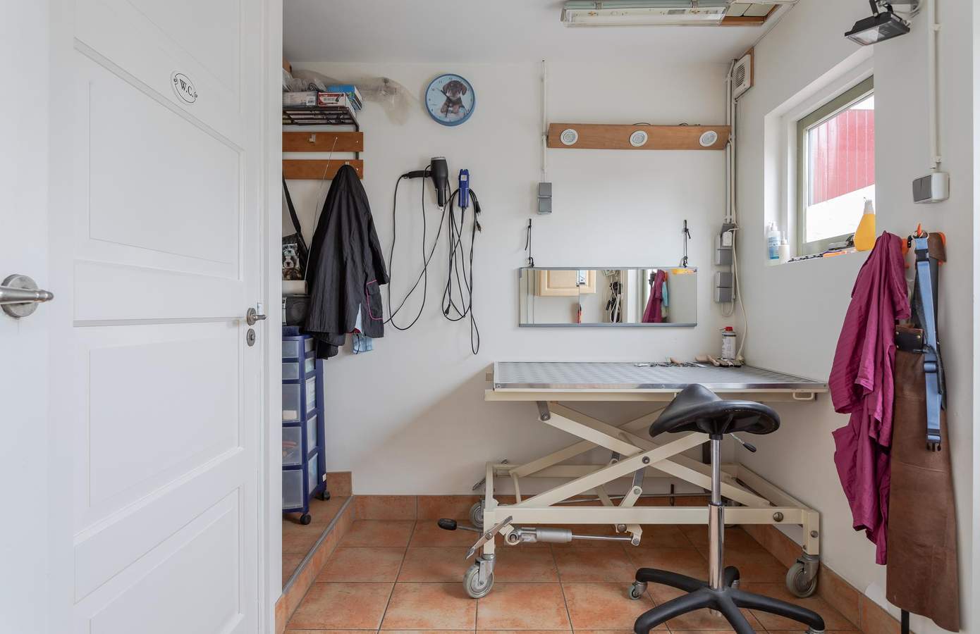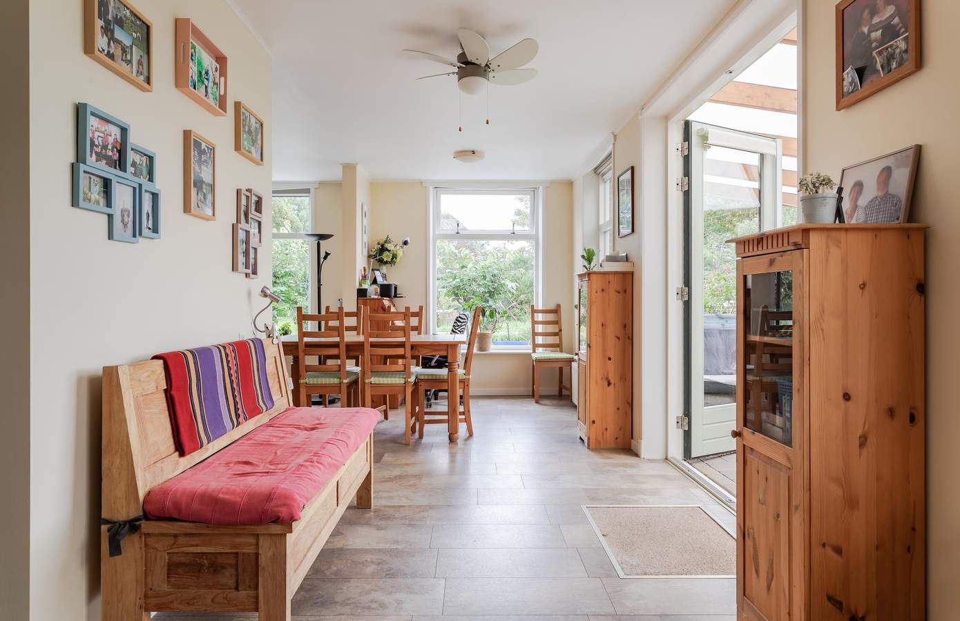 Dat kan hier uiteraard via de voordeur, maar zoals gebruikelijk in dorpen, is de toegang eigenlijk via de tuin aan de achterzijde. Via de openslaande deuren stapt u binnen in de L-vormige woonkamer. Aan de linkerkant bevindt zich de toegang tot de inpandige berging. Dankzij de royale raampartijen heeft de woning veel daglicht en geniet u overal van het uitzicht. De landelijke keuken heeft veel opbergruimte en heeft een opvallend groot 6-pits gasfornuis met oven. Via de keuken betreedt u de ruimte die momenteel dienstdoet als hondentrimsalon, maar ook perfect is voor een eigen praktijk aan huis, met een aparte ingang om werk en privé te scheiden. Via de hal bereikt u de eerste verdieping met 3 slaapkamers, een badkamer met inloopdouche en toilet. De hoofdslaapkamer biedt toegang tot de ruime vliering, hier is nog extra ruimte, ideaal ivoor het opbergen van uw spullen.