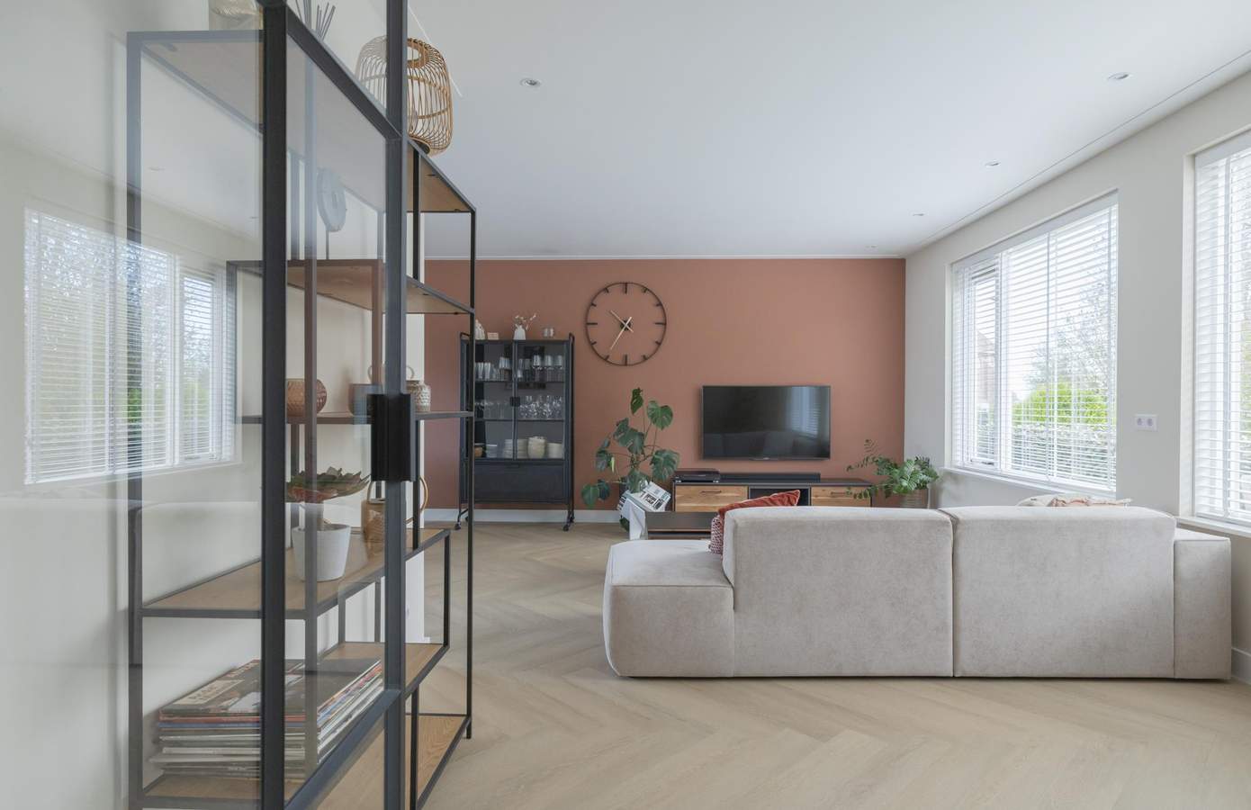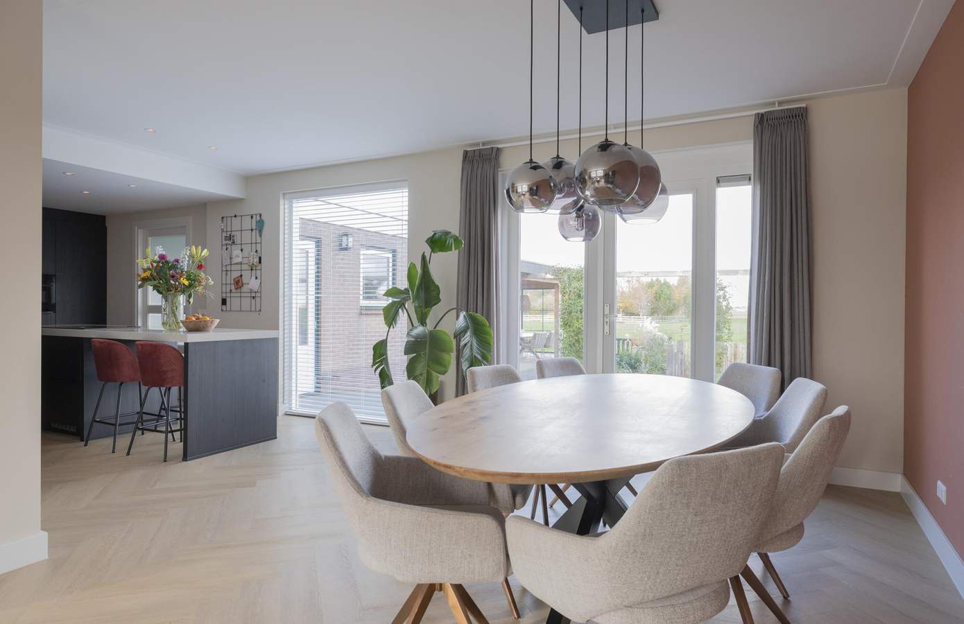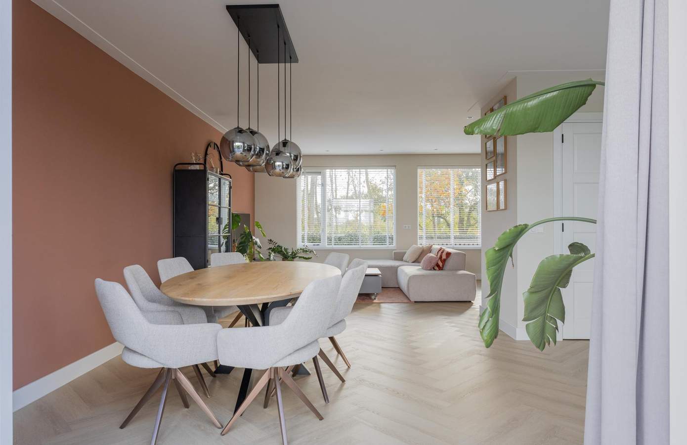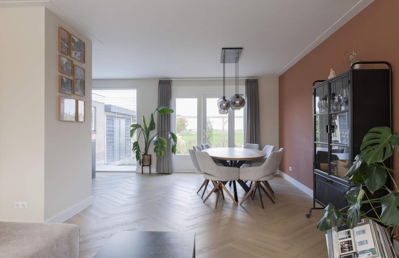 Bij binnenkomst voelt u direct de moderne en warme sfeer die dit huis kenmerkt. In 2021 is de gehele begane grond tot in detail gerenoveerd: van vloeren tot plafonds, van indeling tot verlichting. De stijlvolle visgraatvloer, gladde wanden, inbouwverlichting en hoogwaardige afwerking zorgen voor een eigentijdse en moderne uitstraling. De keuken is strak vormgegeven met een kookeiland, luxe inbouwapparatuur en een prettige verbinding met de eethoek. Vanuit de eethoek heeft u aan de achterzijde een adembenemend uitzicht over de landerijen. Grenzend aan de keuken bereikt u de bijkeuken, ook deze is naast dat de ruimte functioneel is, ook stijlvol. Een op maat gemaakt meubel biedt ruimte aan een koelkast, de wasmachine en droger en er is een aparte wasbak.