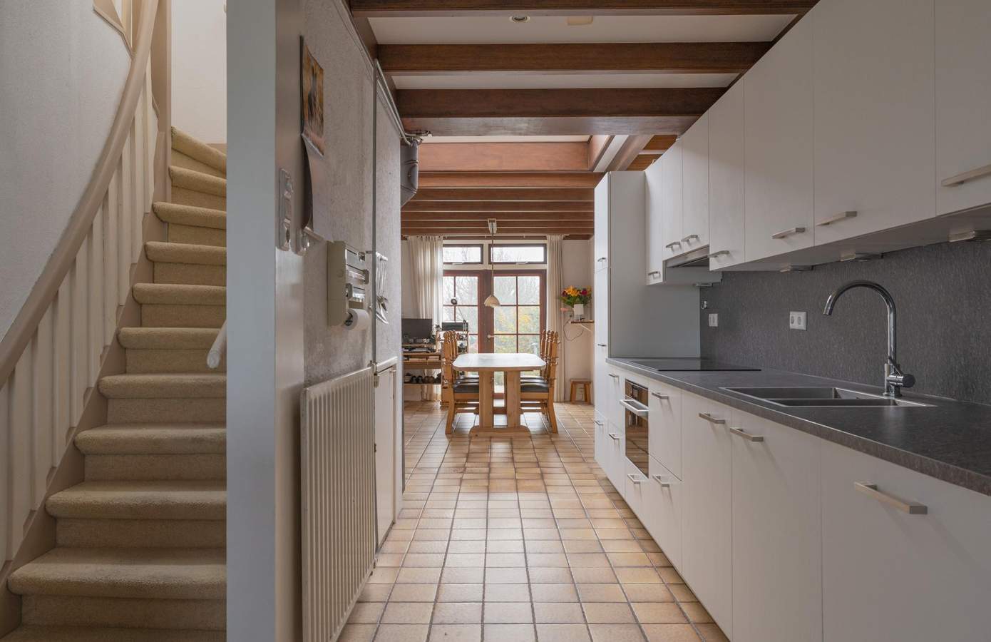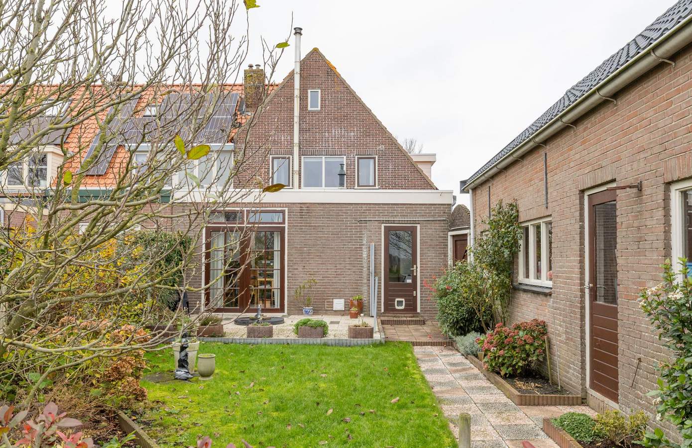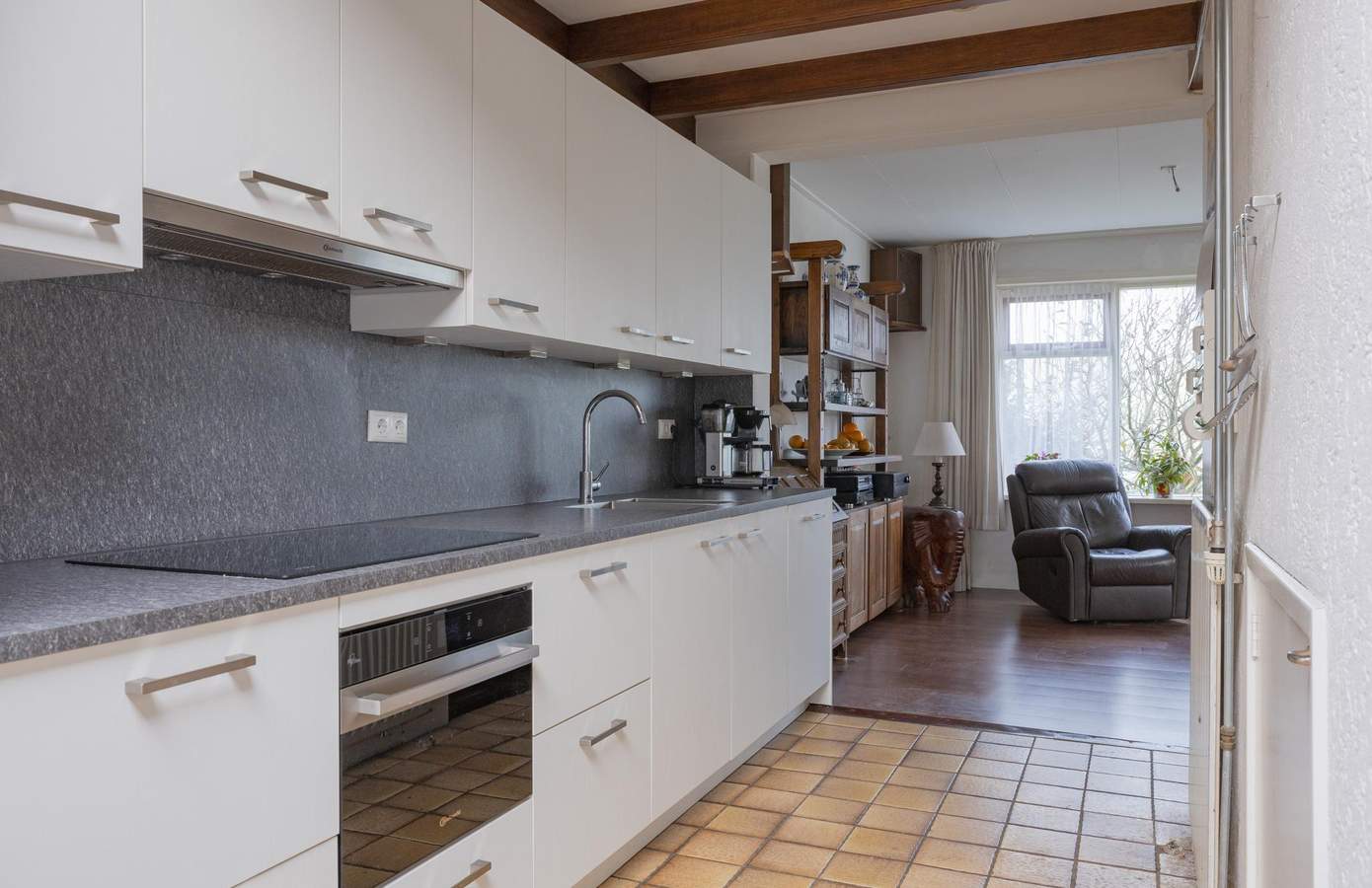 De woonkamer aan de voorzijde van de woning is aangenaam licht dankzij de vele ramen en vormt een prettige leefruimte. Aansluitend bevindt zich de keuken, die in 2022 geheel is vernieuwd en voorzien is van een combi-oven, afzuigkap, vaatwasmachine, inductiekookplaat en koelkast. Op de begane grond vindt u daarnaast de badkamer, eenvoudig maar functioneel ingericht met een bubbelbad, douche, wastafel en toilet. De bijkeuken met ruimte voor wasmachine en droger, de voorraadkast en de kelder maken dit woonniveau extra praktisch en compleet. Op de verdieping liggen drie slaapkamers, waaronder één met uitzicht op de Waddenzee en een tweede met fraai zicht op de achtertuin. Hier bevindt zich ook een separaat toilet. Via een uitschuifbare vlizotrap bereikt u de zolder, die verrassend veel bergruimte biedt.