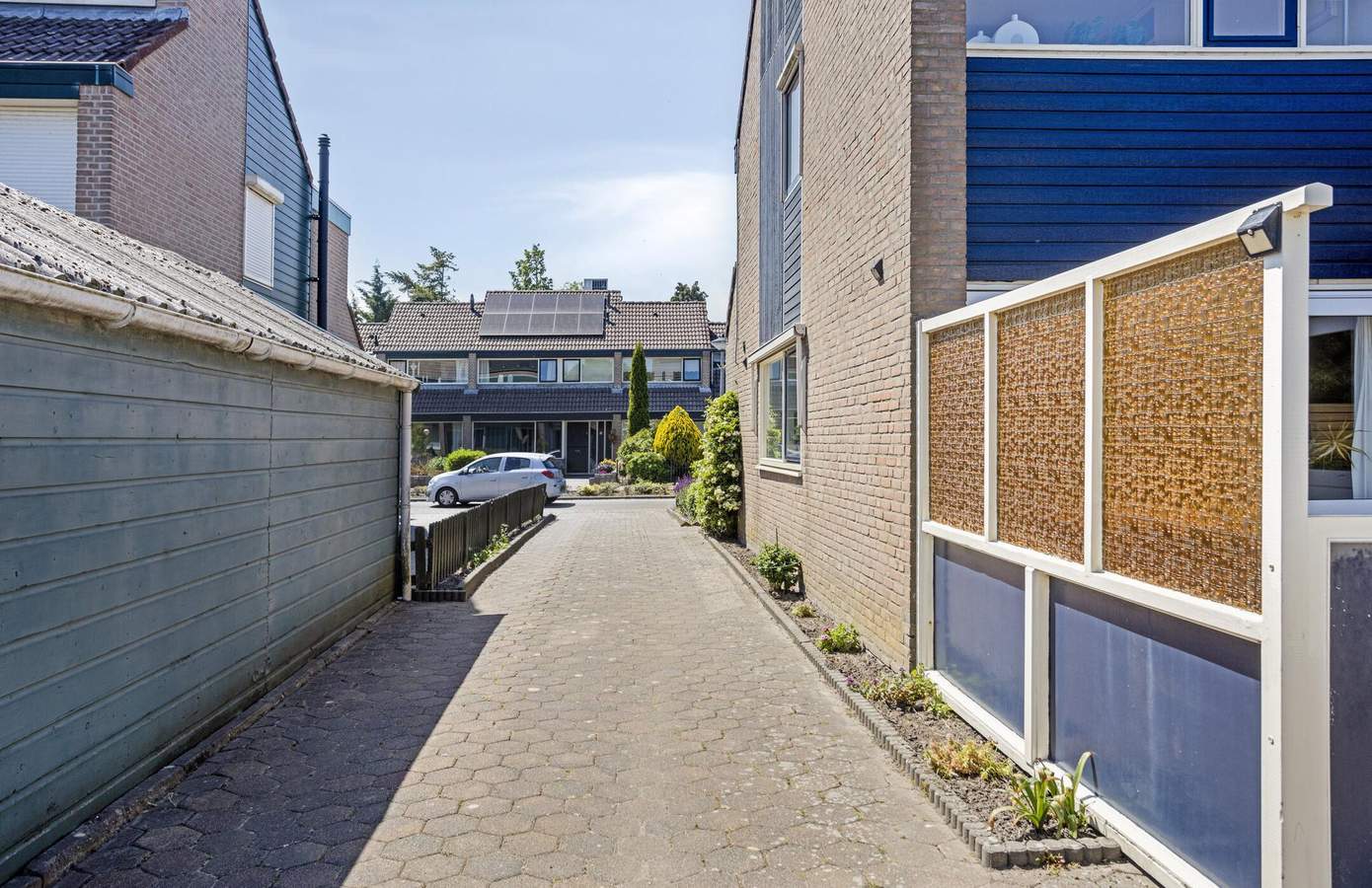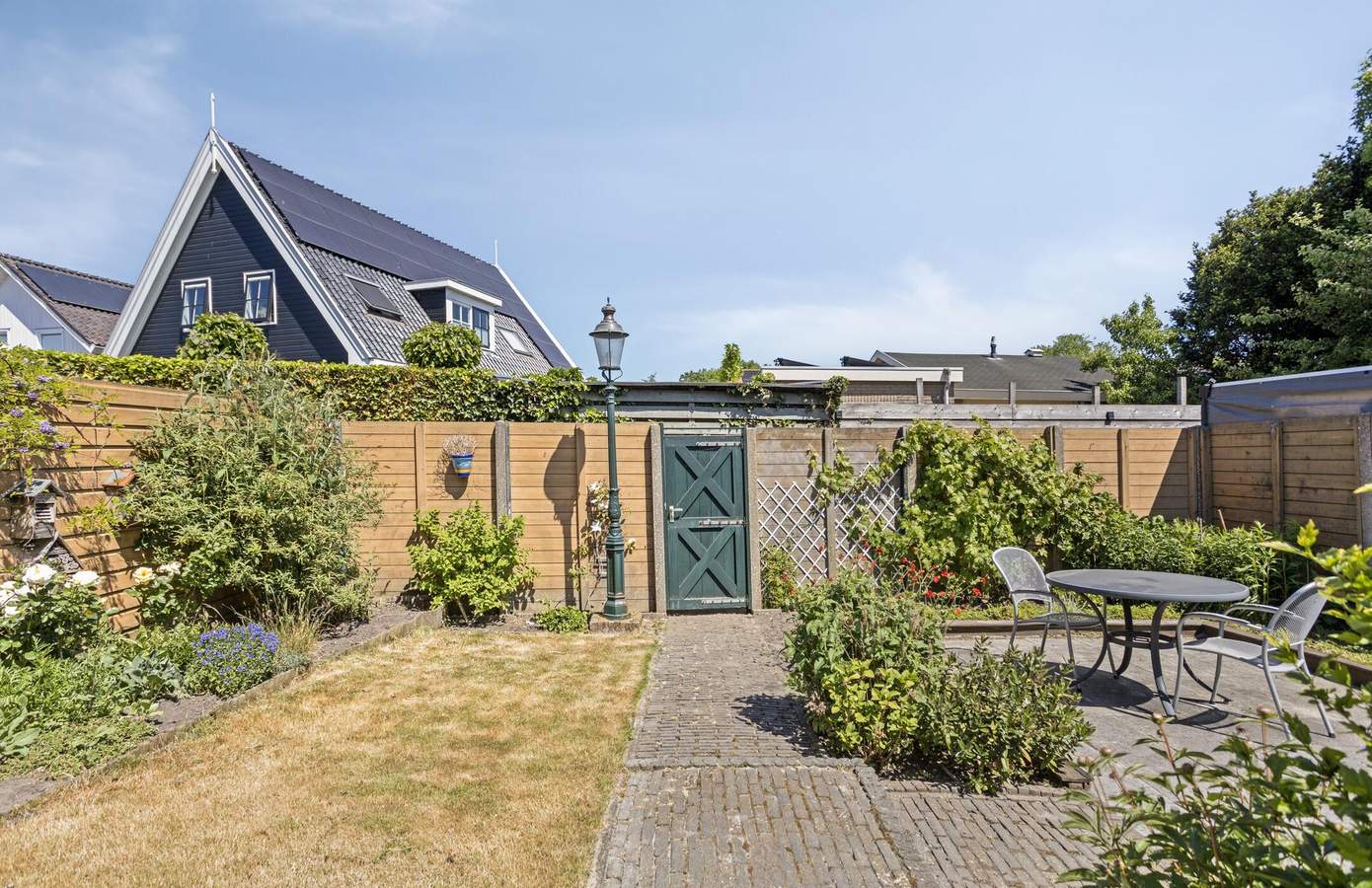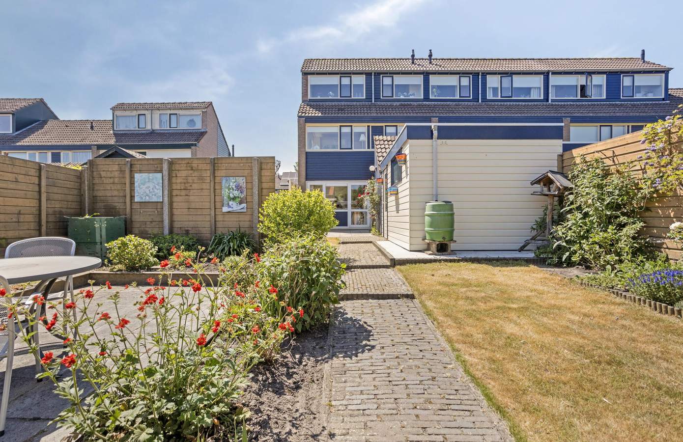 De fraai aangelegde achtertuin, gelegen op het noorden, is een heerlijke plek om buiten te leven. Direct achter de woning ligt een royaal terras met windscherm, waar u al vroeg in het jaar beschut van de zon kunt genieten. Dieper in de tuin staan borders vol kleurige bloemen en planten, waar zich ook nog een tweede terras bevindt. Aangrenzend aan de woning staat een houten berging met elektra, ideaal voor het veilig opbergen van fietsen en tuingereedschap. Langs de zijkant van het huis ligt een ruime oprit met plaats voor meerdere auto’s en dankzij de poort is de tuin ook achterom bereikbaar.