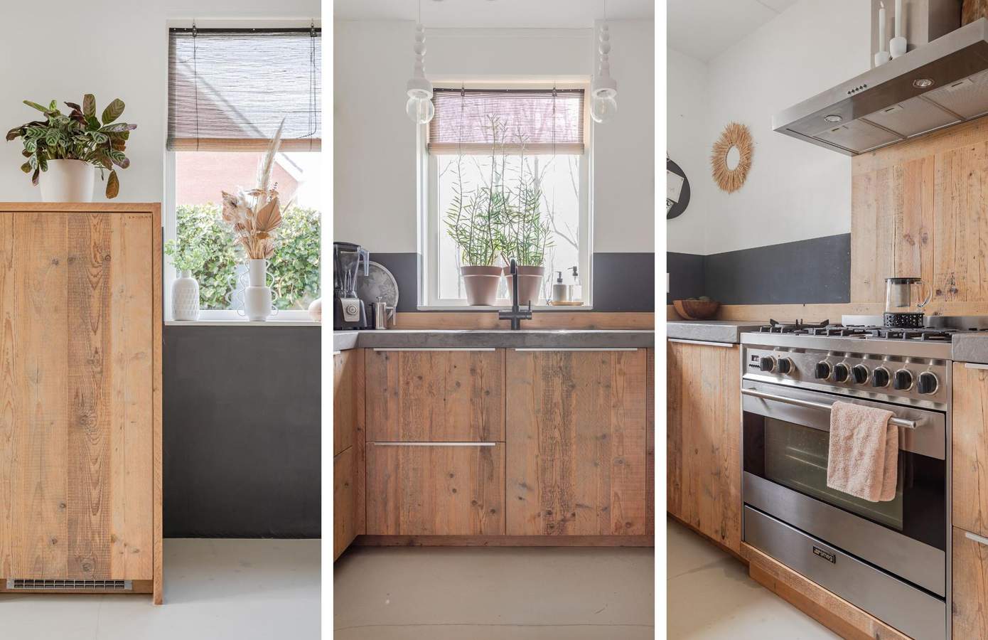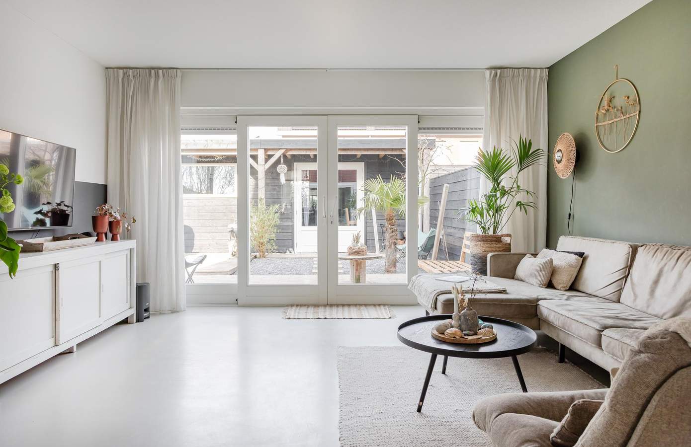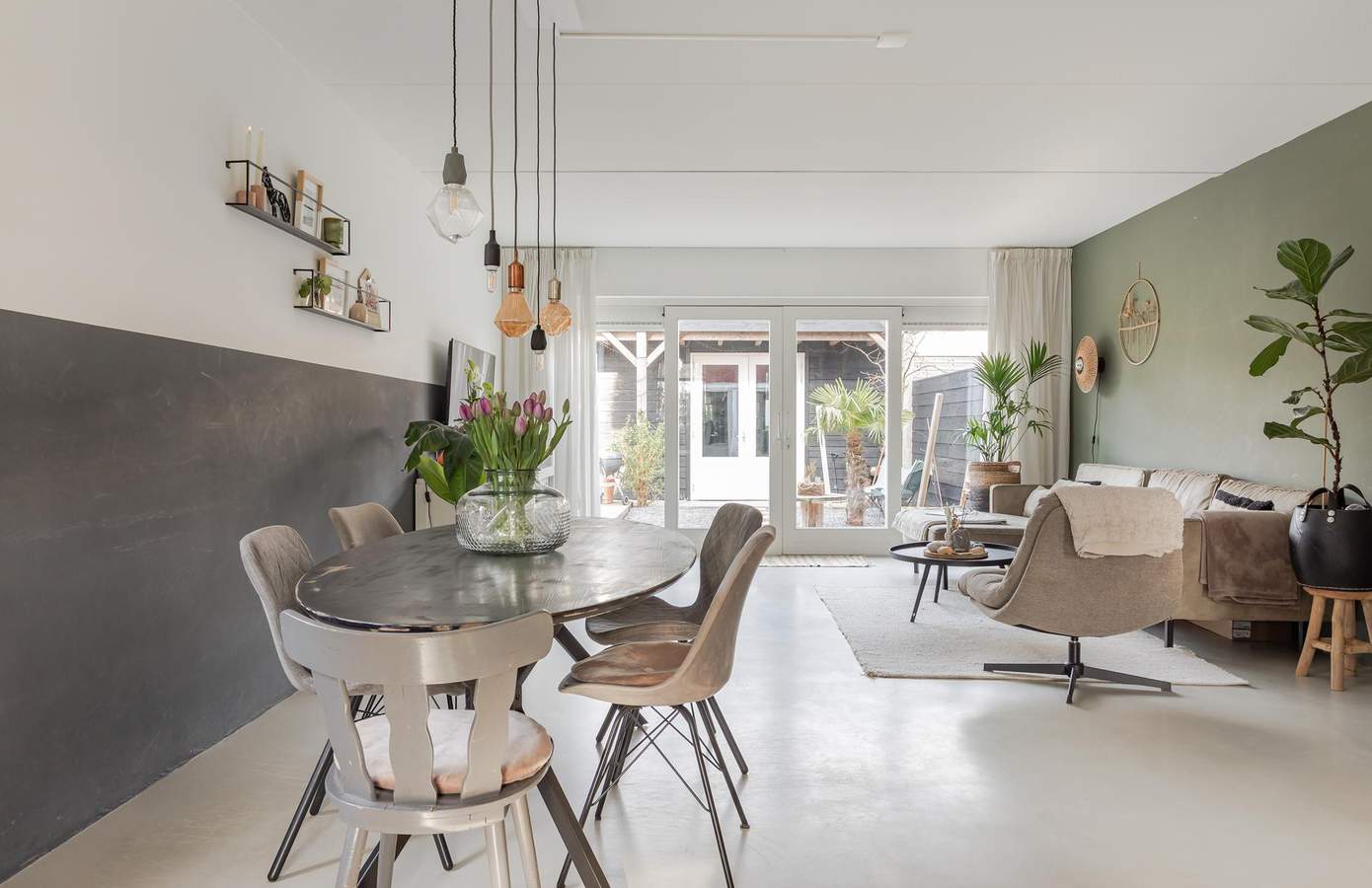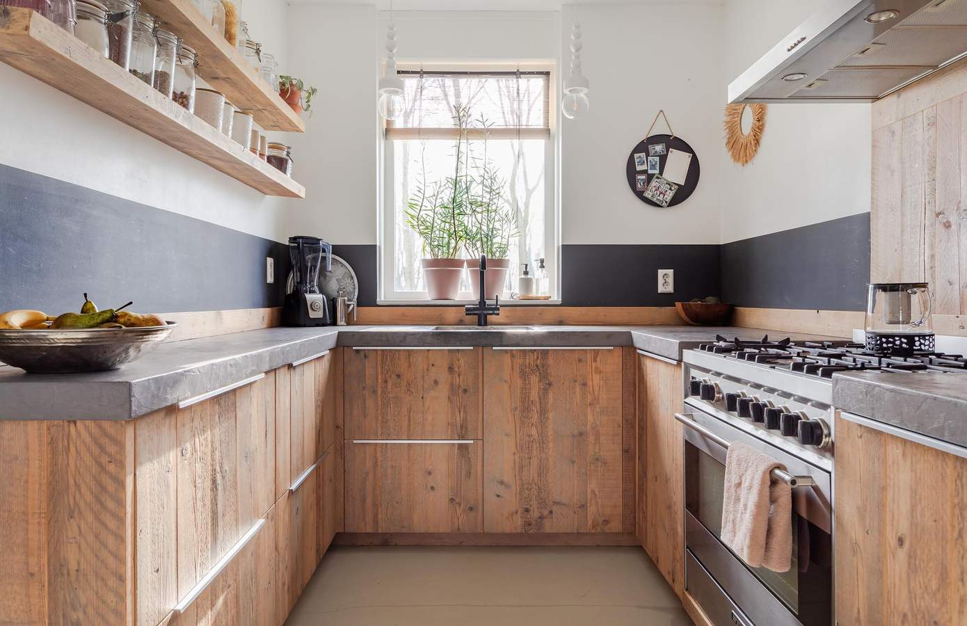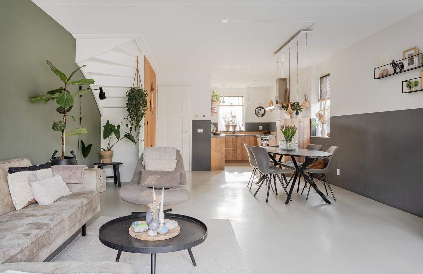 Via de voortuin betreedt u de woning in de ruime hal, waar u toegang heeft tot de meterkast, het moderne toilet, de trap naar de eerste verdieping en de lichte woonkamer. Aan de voorzijde van de woning vindt u de halfopen keuken, gemaakt van steigerhout. De keuken is luxe uitgevoerd en voorzien van een riante Smeg oven, een 6-pits gasfornuis en een kokend water kraan. De gehele begane grond is afgewerkt met een stijlvolle gietvloer en is voorzien van vloerverwarming. Aan de achterzijde van de woning zorgt een schuifpui voor een aangename lichtinval en een directe verbinding met de achtertuin. Via de trap in de hal bereikt u de overloop van de eerste verdieping. Hier bevinden zich twee ruime slaapkamers, een kantoor en een moderne badkamer.