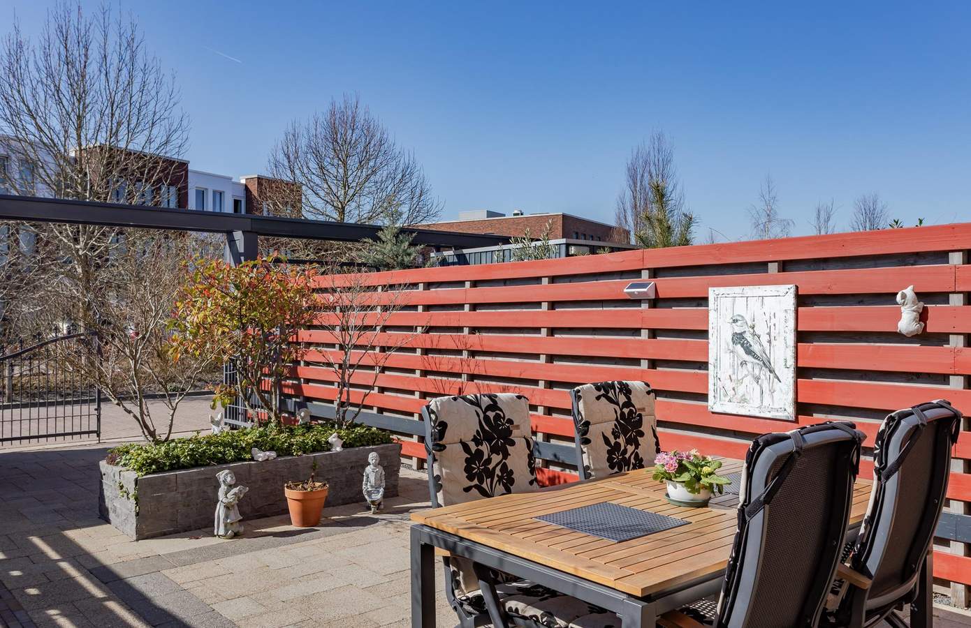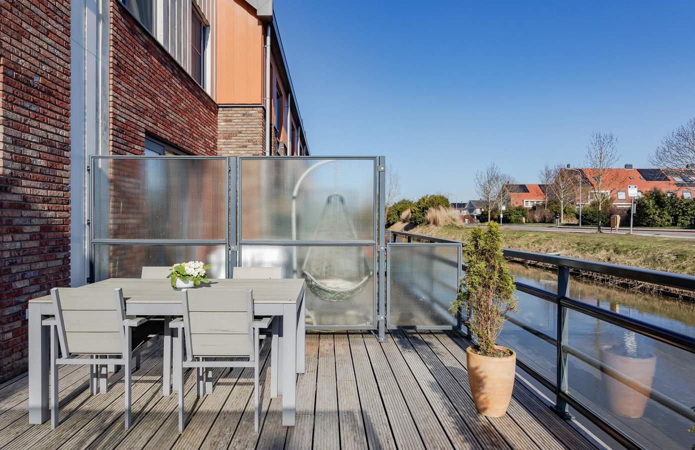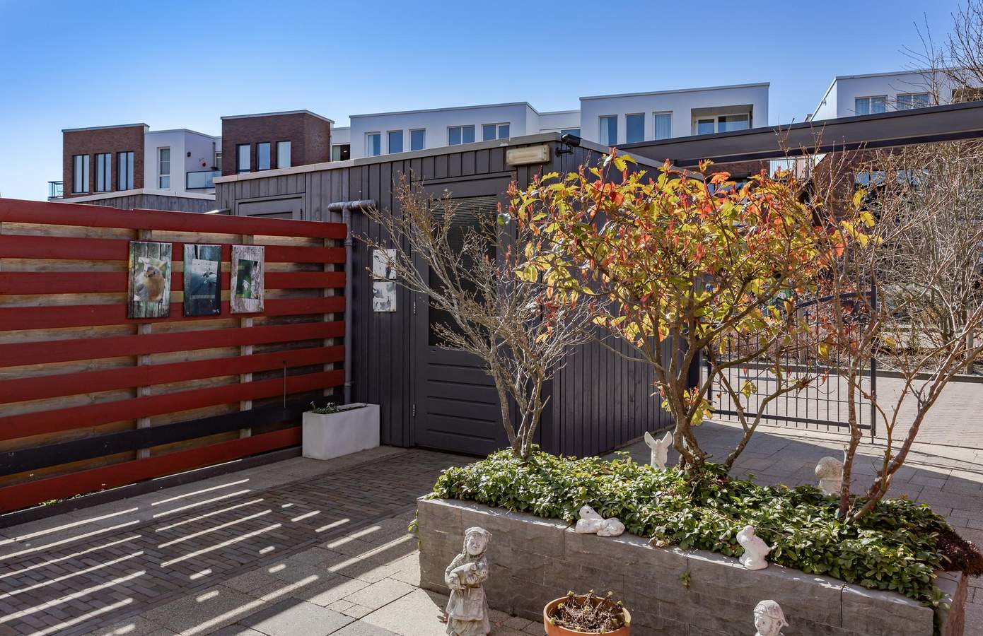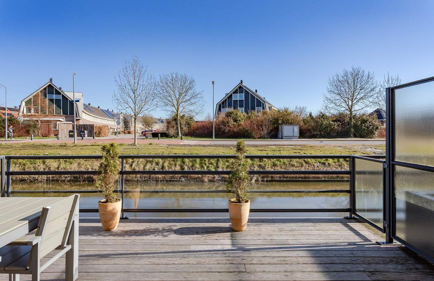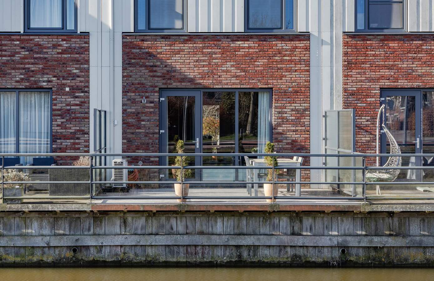 De (voor)tuin, gelegen op het zuidwesten, is een heerlijke plek om van de zon te genieten. Hier vindt u een combinatie van een terras en een fraai aangelegde border met daarnaast een praktische berging voor fietsen en tuingereedschap. De achtertuin grenst aan het water en beschikt over een verrassend ruim vlonderterras van 22 m².