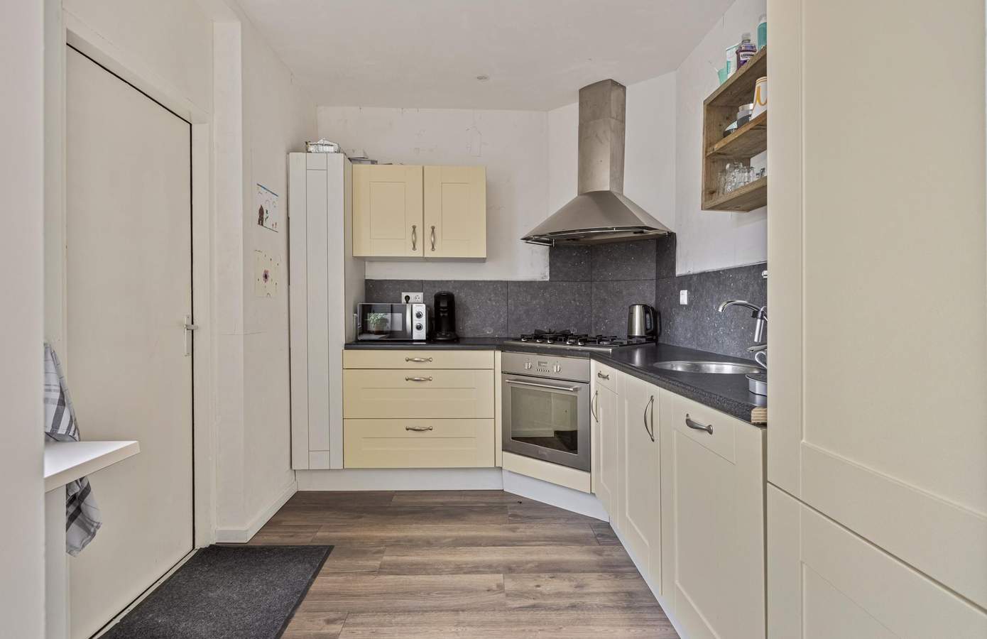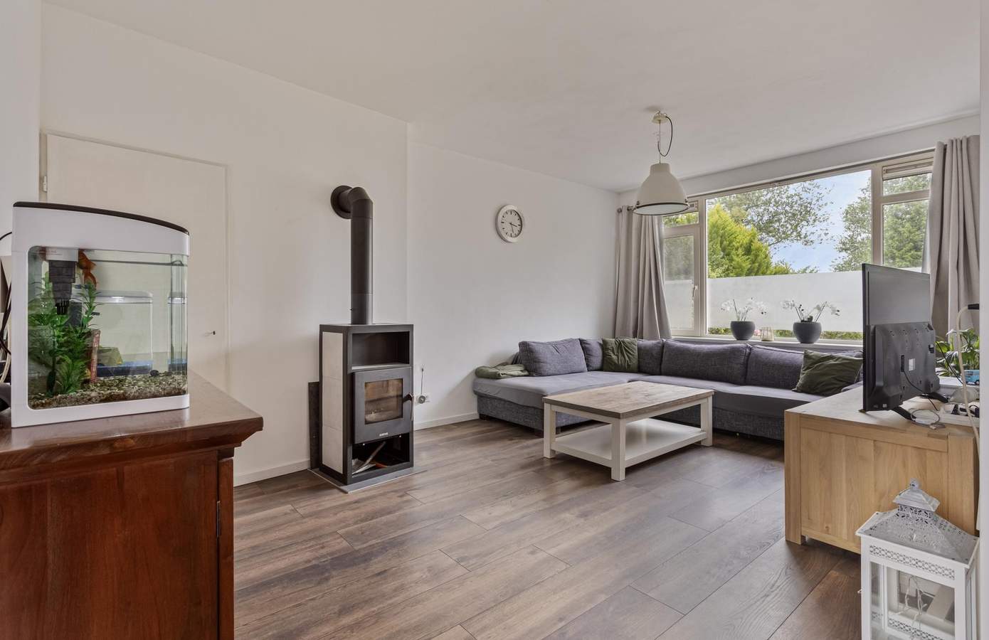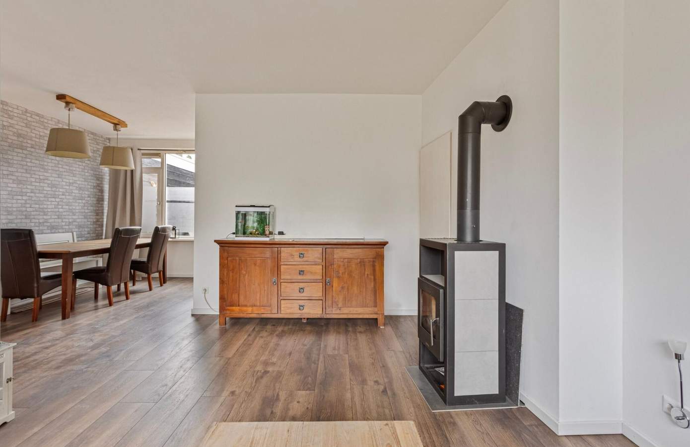 Via de hal komt u binnen in de lichte woonkamer aan de voorzijde van de woning, waar een gezellige houtkachel voor sfeer zorgt. Aan de achterzijde bevinden zich de keuken en eetkamer, met uitzicht op de achtertuin. Vanuit de keuken heeft u toegang tot een handige berging met aansluitingen voor de wasmachine en droger, en een deur naar de achtertuin.