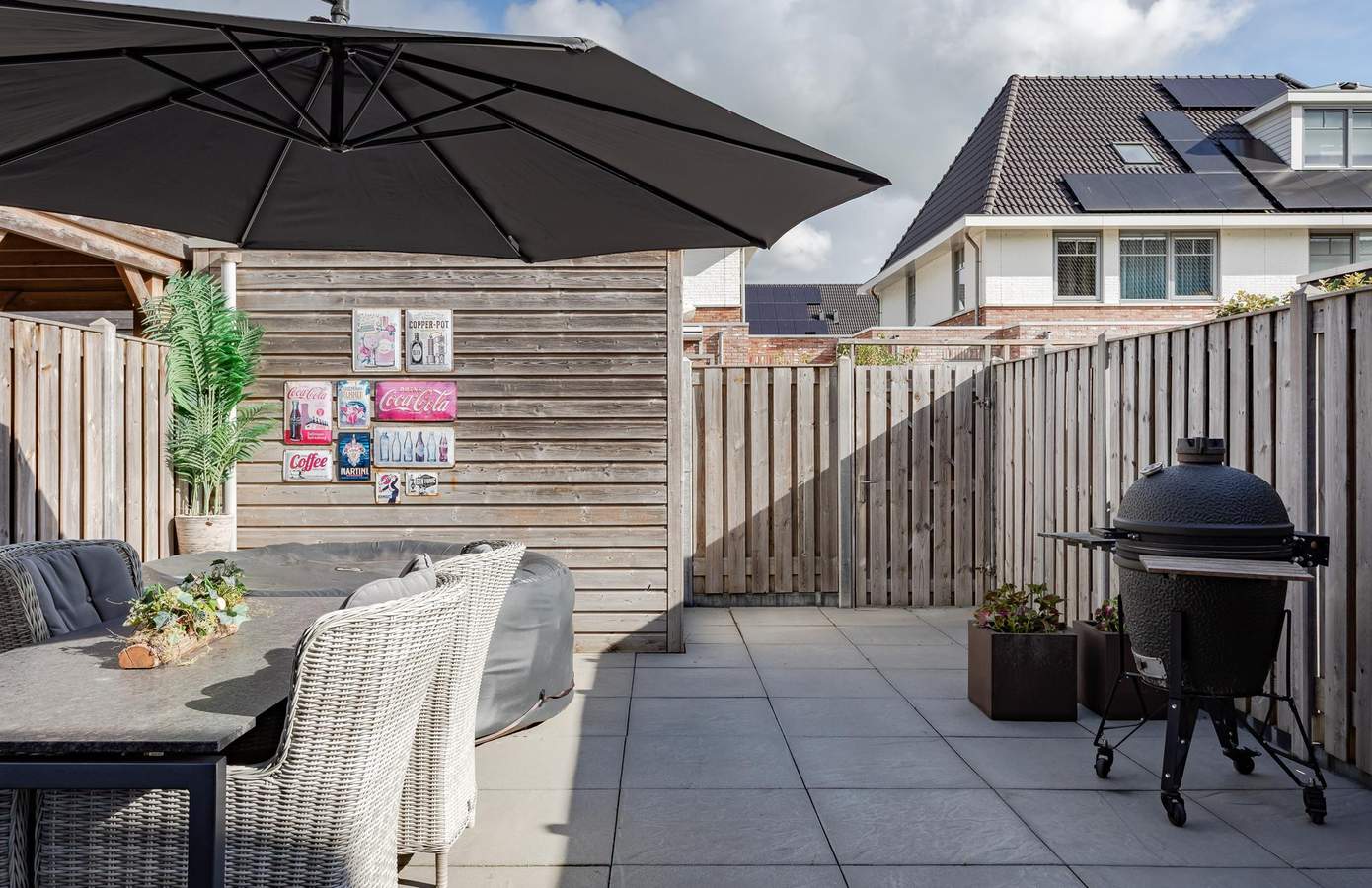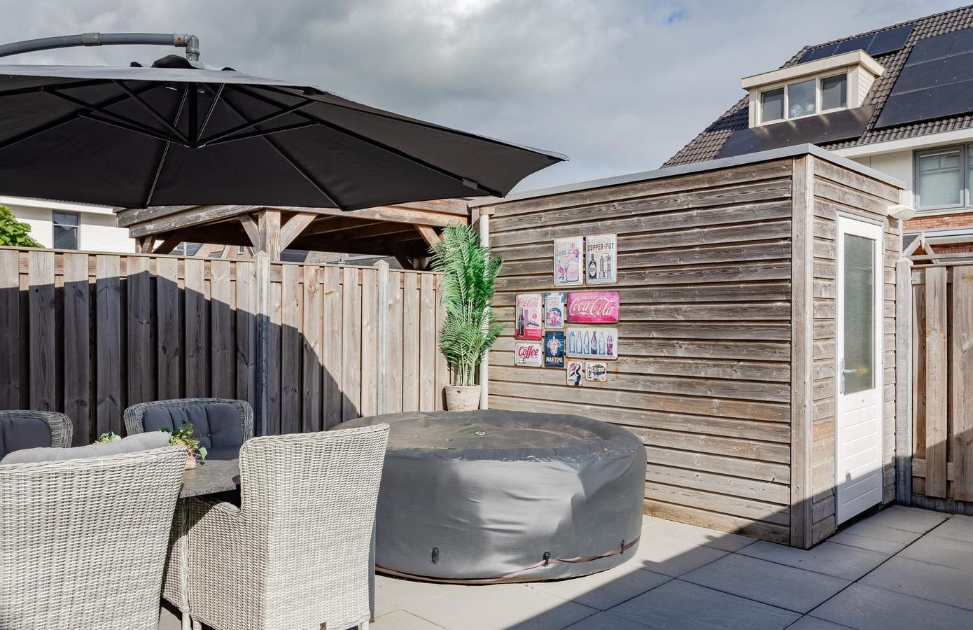 Via openslaande tuindeuren in de woonkamer komt u in de achtertuin. De tuin is aangelegd met sier bestrating en heeft ruimte voor een tuin- of loungeset. Even ontspannen na een lange dag? Dit kan in de jacuzzi. De berging is ideaal voor het stallen van fietsen en uw (tuin)gereedschap. Verder is er een buitenkraan en verlichting in de tuin aanwezig.