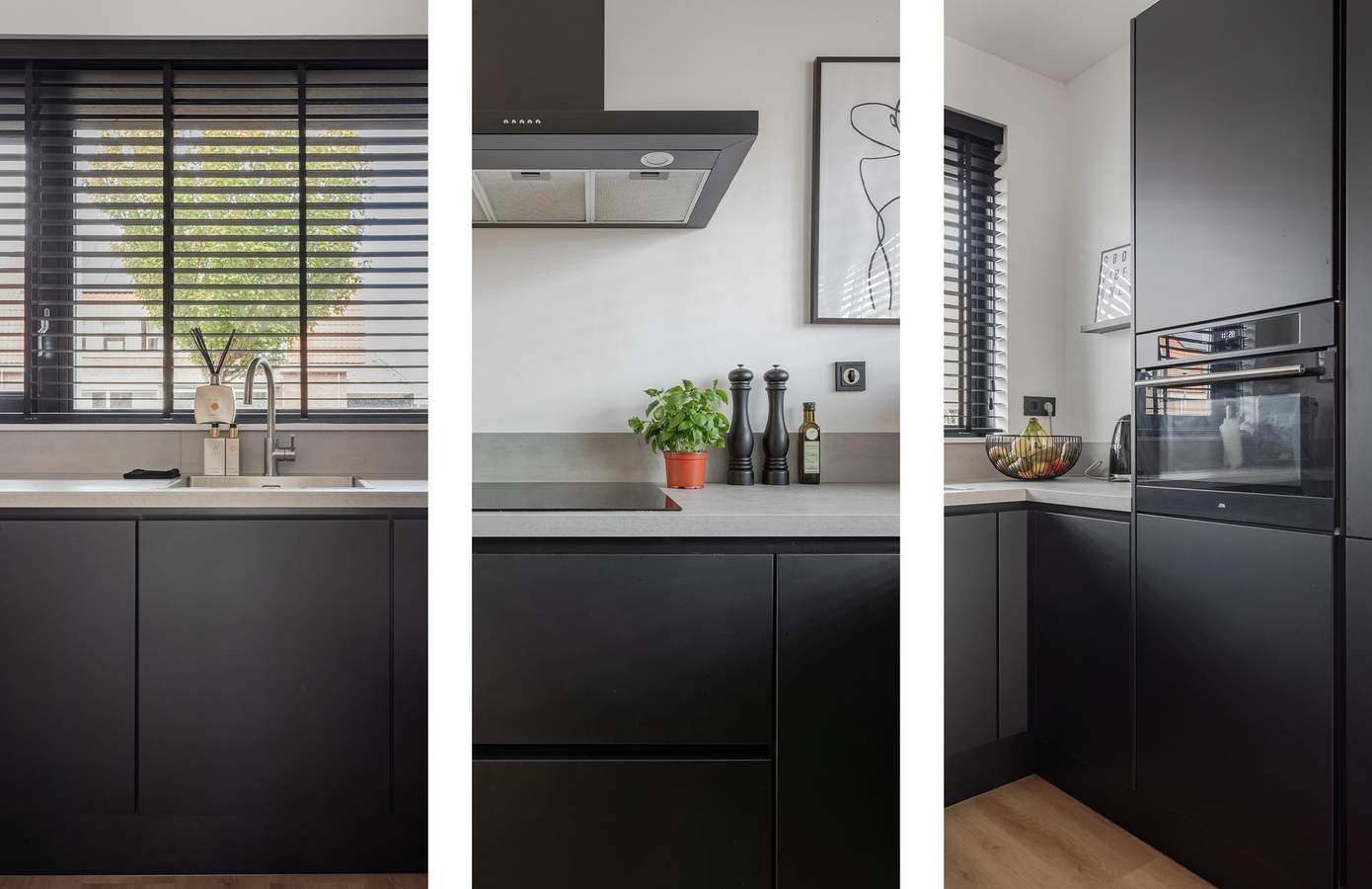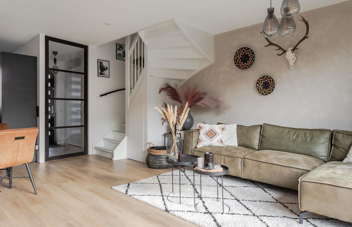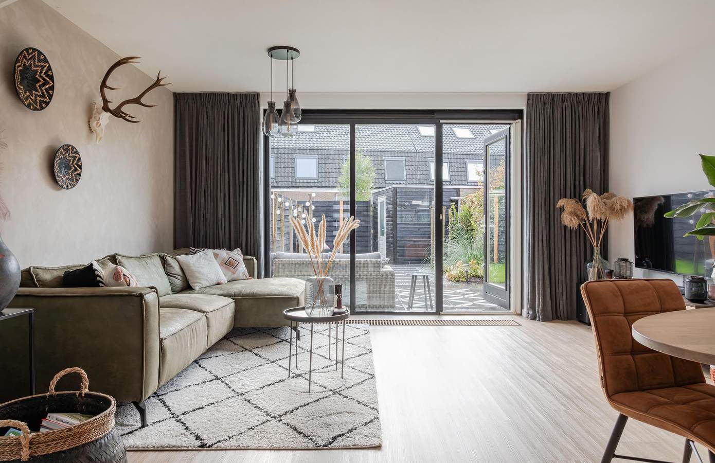 Via de voortuin betreedt u de woning en komt u in de hal, waar u toegang heeft tot de meterkast, het toilet en de woonkamer. Een stijlvolle taatsdeur leidt u naar de lichte en moderne leefruimte. Aan de voorzijde van de woning bevindt zich de open keuken, uitgevoerd in matzwart met een betonlook werkblad en greeploze kasten. Deze luxe keuken is voorzien van een combi-oven, inductiekookplaat, vaatwasser en koel-vriescombinatie. De woonkamer ligt aan de achterzijde van de woning en wordt gekenmerkt door een grote glazen pui, die zorgt voor veel daglicht en een directe verbinding met de achtertuin.