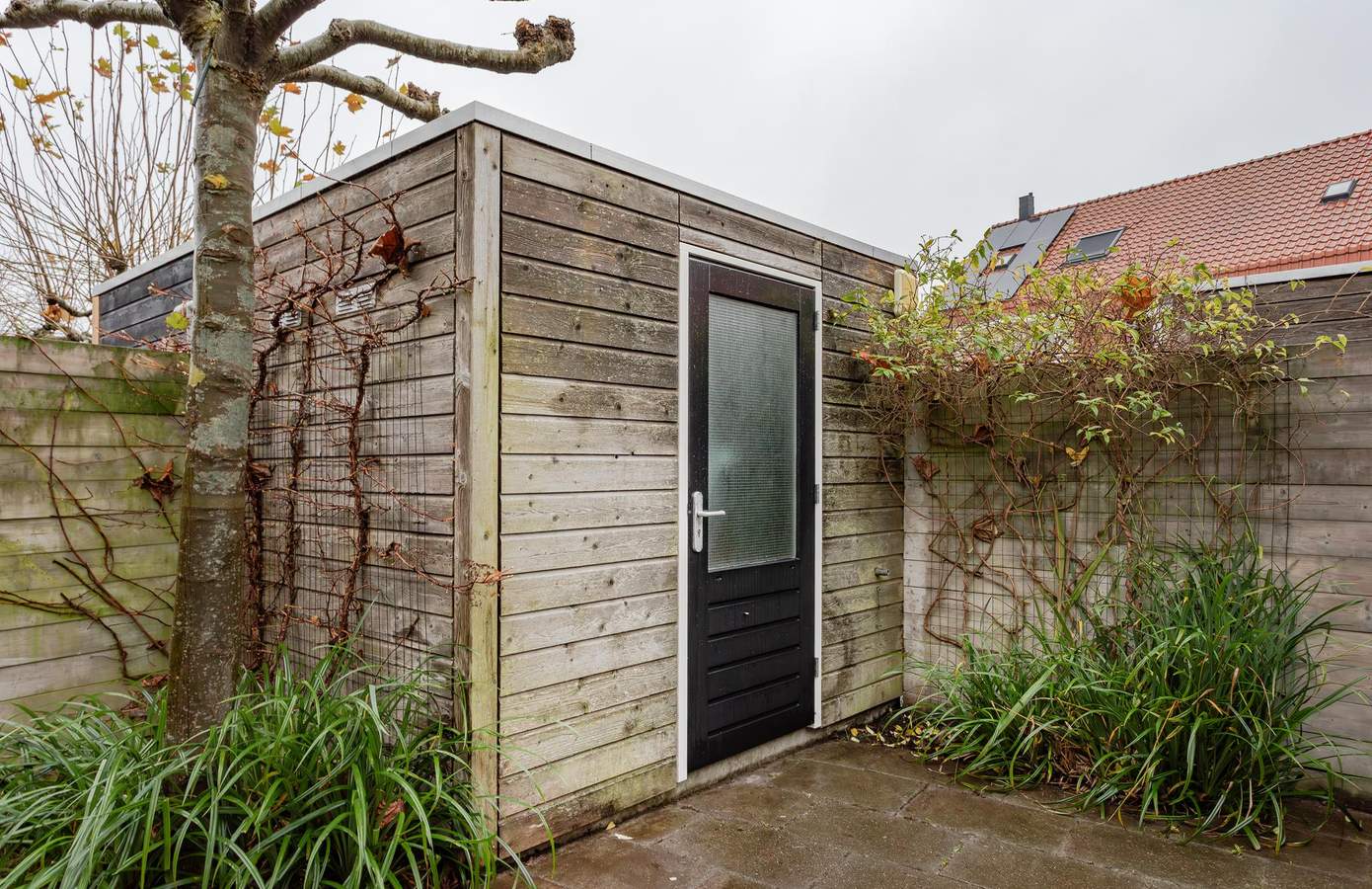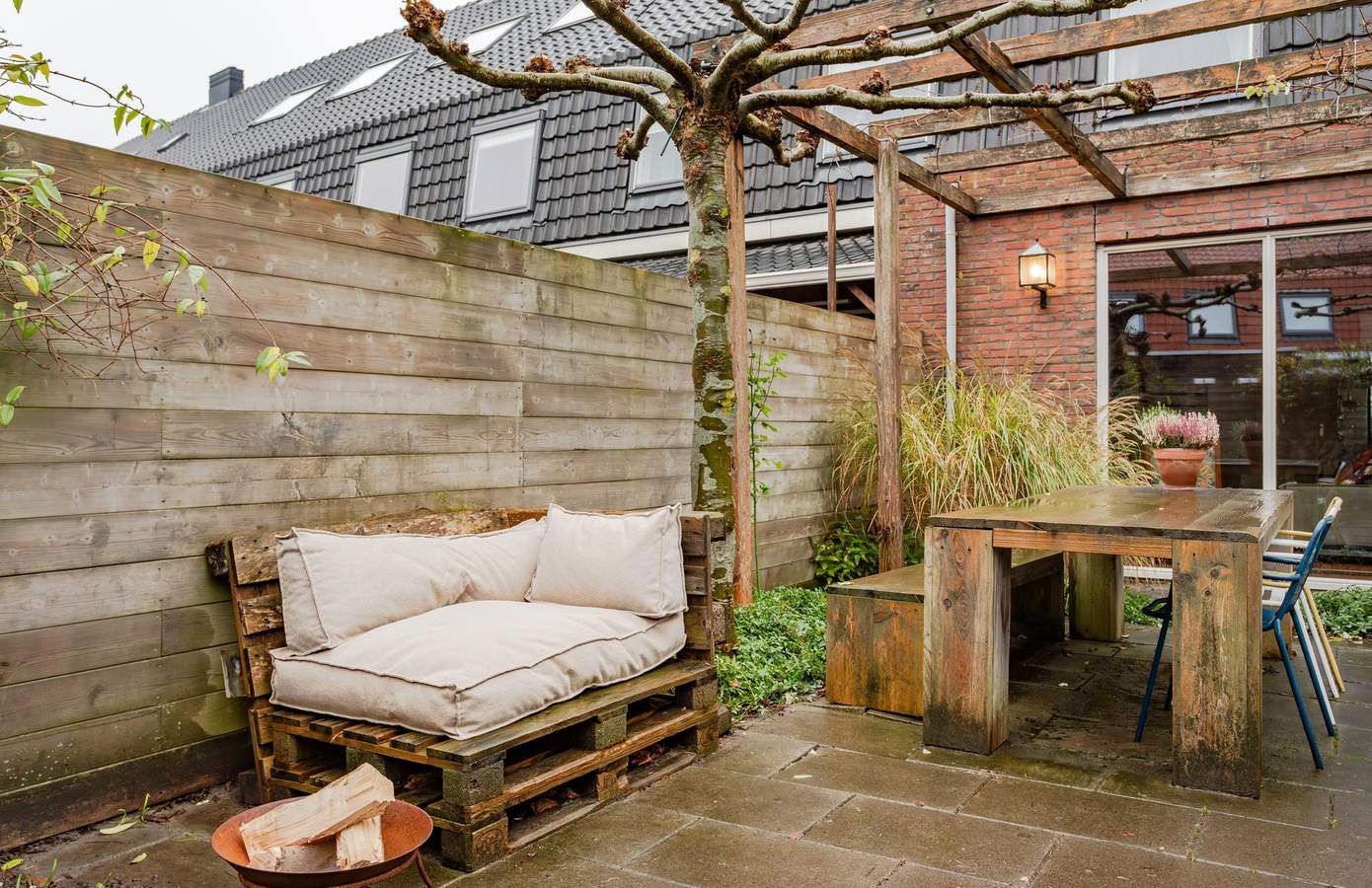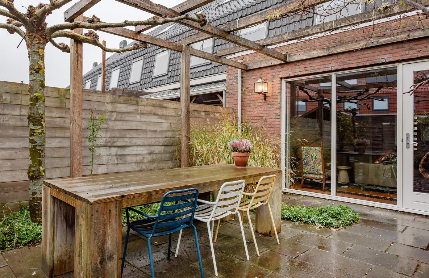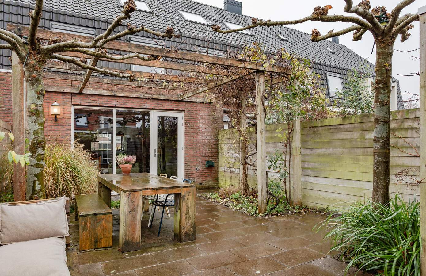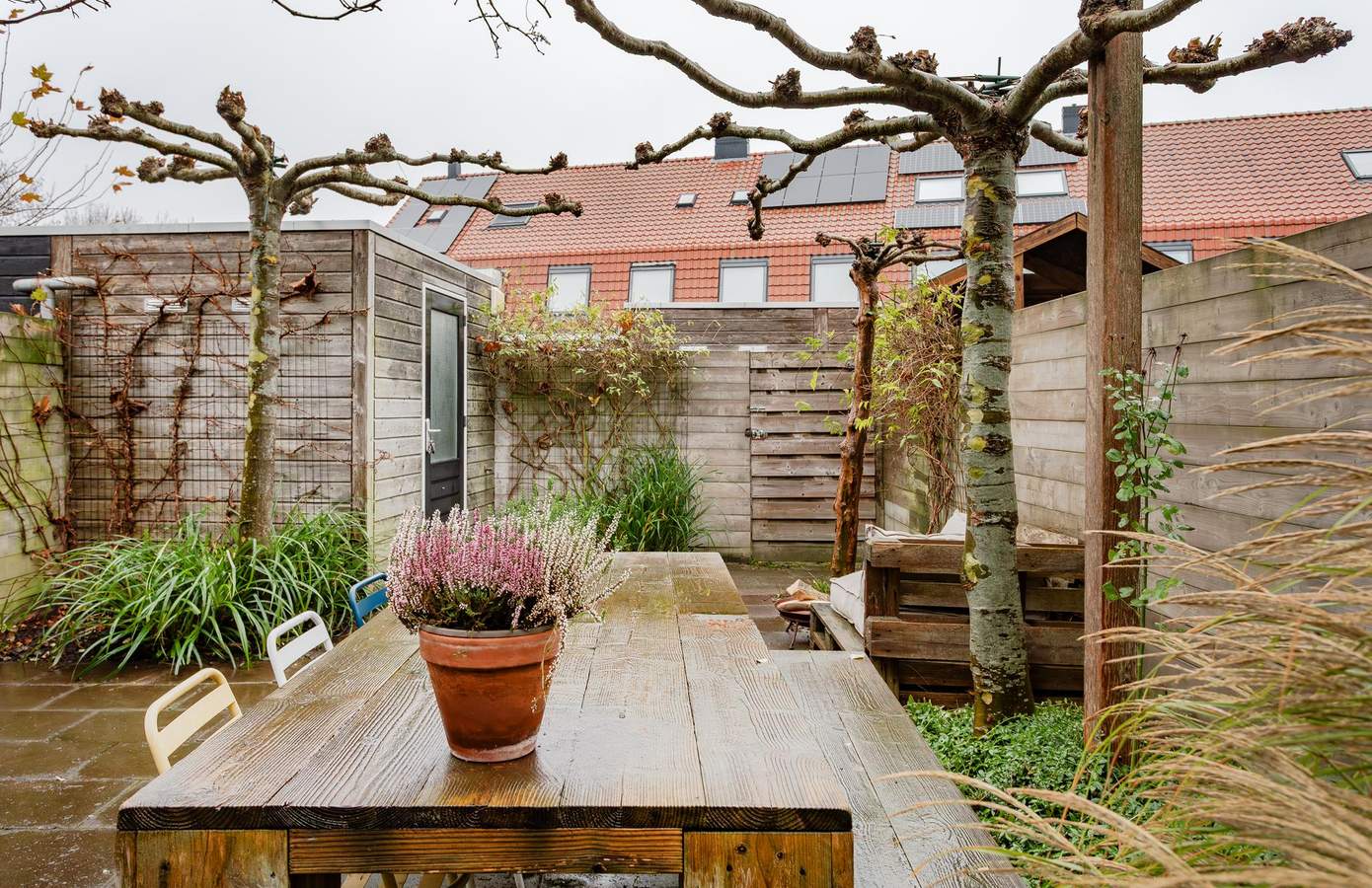 Via de tuindeur in de woonkamer komt u in de achtertuin: een sfeervolle buitenruimte, met platanen, een pergola en mooie planten, die in elk seizoen een ander beeld geeft. De platanen geven de tuin karakter, hoogte en in de zomer een gefilterde schaduw. De druivenrank groeit langs de pergola omhoog en vormt inmiddels in de zomerse maanden een groen dak. Dankzij de slimme indeling en het vele groen voelt de tuin groter dan hij is. Hier kunt u op elk moment van de dag een fijn plekje vinden van een zonnige hoek in het voor- of najaar tot een koel, schaduwrijk terras op warme zomerdagen. Achterin de tuin staat bovendien een praktische berging, perfect voor uw fietsen en tuinspullen.