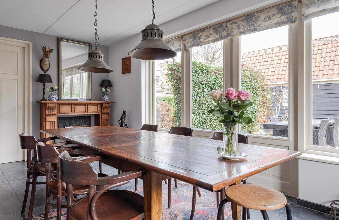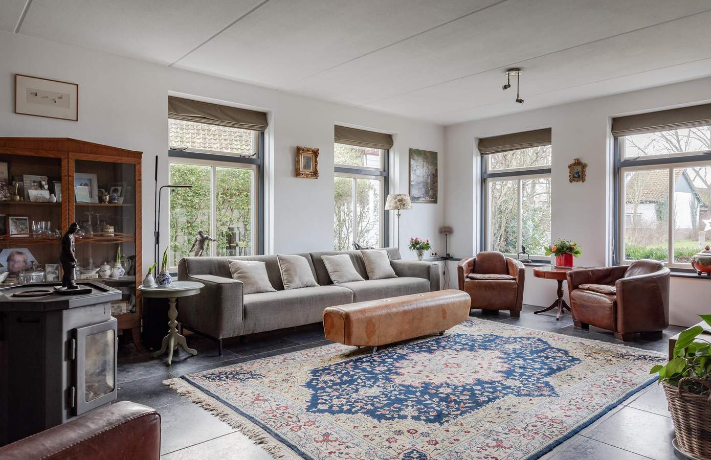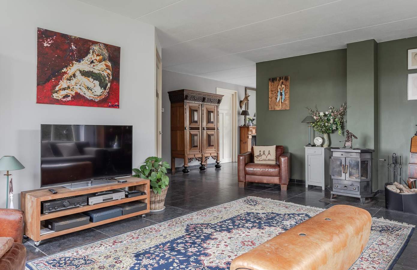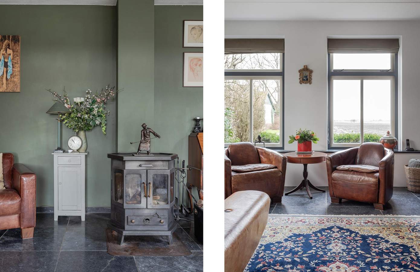 Bij binnenkomst komt u in een ontvangsthal met de meterkast en de trap naar de eerste verdieping. Vanuit de hal heeft u toegang tot de ruime, lichte en sfeervolle woonkamer, die dankzij de grote raampartijen een heerlijk vrij uitzicht over de landerijen biedt. Centraal in de woonkamer staat een sfeervolle haard (houtkachel) welke behaaglijke warmte en gezelligheid geeft. De vloer is afgewerkt met Turks natuursteen en voorzien van vloerverwarming. Aan de voorzijde bevindt zich ook een werk-/studeerkamer. Ideaal wanneer u ruimte nodig heeft voor thuiswerken of studerende kinderen. De woonkamer loopt over in de royale woonkeuken, die voorzien is van een landelijke keuken met schouw en openslaande deuren naar het terras. In de woonkeuken is voldoende ruimte voor een grote eettafel wat het tot een sfeervolle plek maakt. Grenzend aan de keuken is de bijkeuken, deze is uitgerust met een handige boerendeur (in twee te delen) naar de achtertuin. In de bijkeuken is de garderobe, het ruime toilet, plus een aanrechtblad en de wasmachine-aansluiting. Vanuit de bijkeuken is toegang tot de kelder. De indeling biedt niet alleen comfort en functionaliteit, maar ook een fijne balans tussen open leefruimtes en privacy. Op de eerste verdieping zijn in totaal drie ruime slaapkamers en de badkamer. De badkamer is van alle gemakken voorzien, zo is er een ruime douche, een ligbad en een stijlvol badkamermeubel met een dubbele wastafel en het toilet. Aan de voorzijde van de woning zijn twee slaapkamers, waarvan één met een inloopkast. De slaapkamer aan de achterzijde is zeer ruim en indien gewenst zijn hier twee slaapkamers van te maken. Op de overloop heeft u ook toegang tot een tweede inloopkast. Via een vaste trap bereikt u de zolderverdieping, waar een slaapkamer en veel bergruimte aanwezig is. Desgewenst kan hier een vijfde slaapkamer worden gerealiseerd.