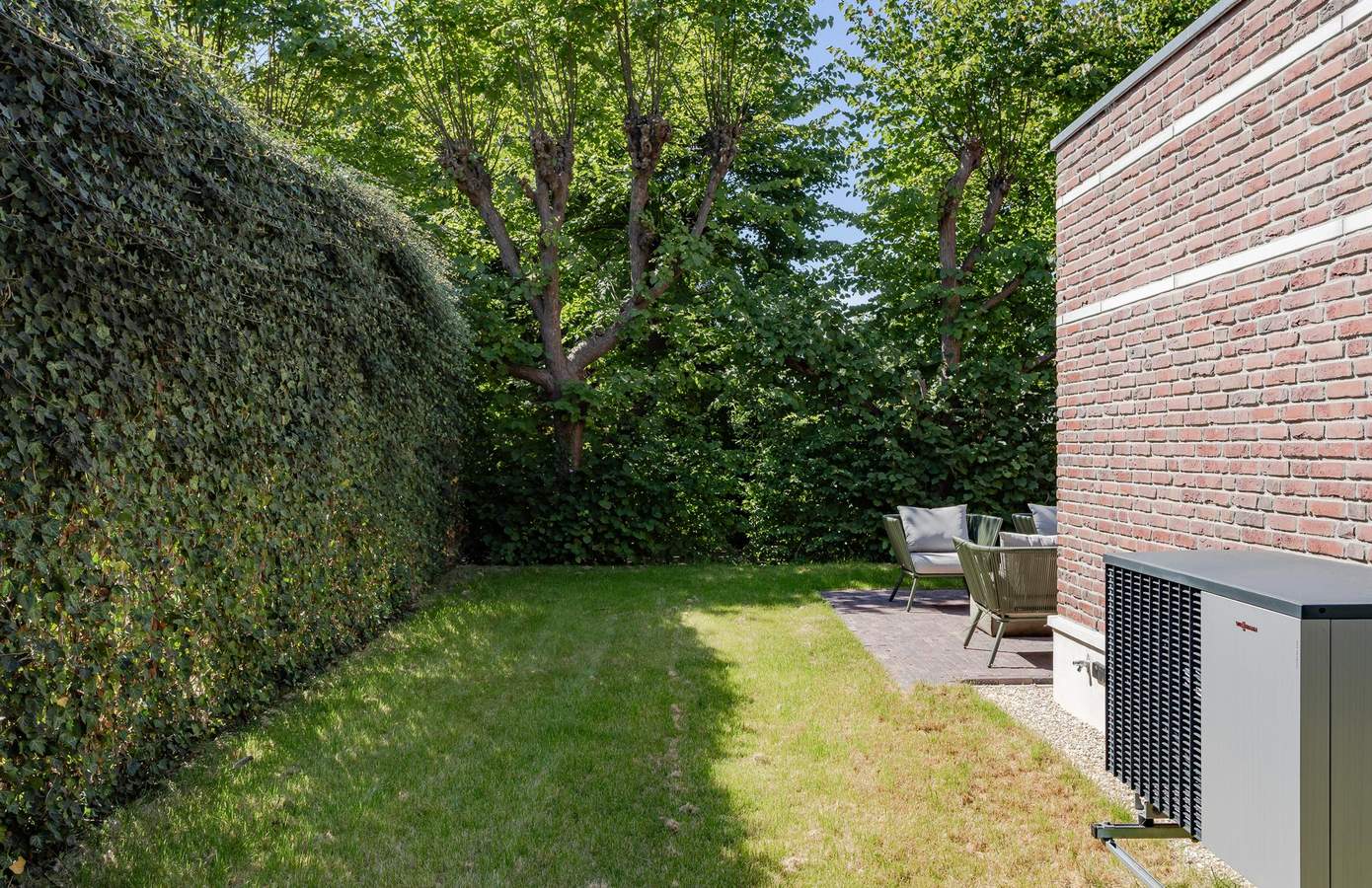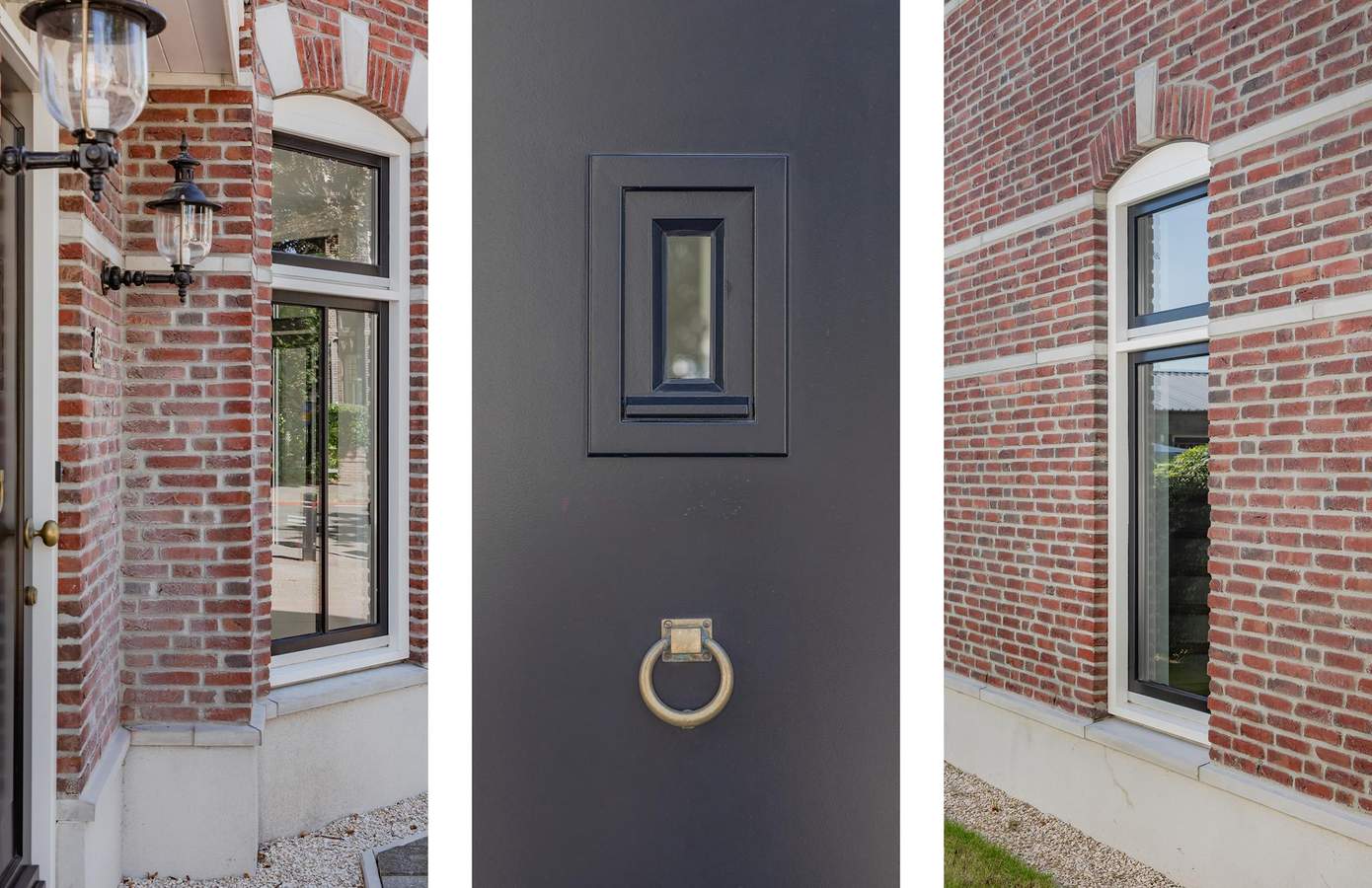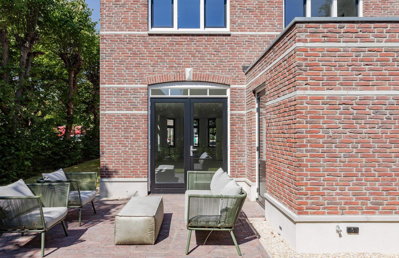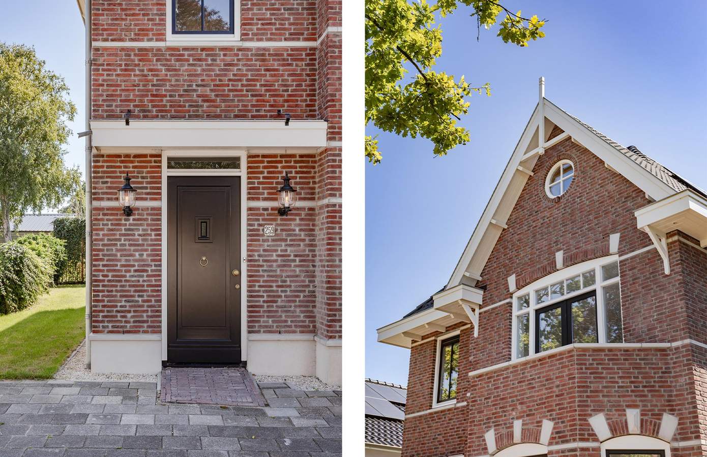 Rondom de woning ligt een strak aangelegd gazon en aan de zijkant vindt u een ruime oprit waar u uw auto op eigen terrein kunt parkeren. Het terras op het zuidoosten grenst direct aan de woonkeuken. De architectonische details – van de klassieke buitenverlichting tot de zorgvuldig gemetselde rollagen boven de ramen en het ronde raam in de topgevel – onderstrepen de signatuur van de architect, waarbij eigentijds comfort naadloos is verweven met traditionele allure.