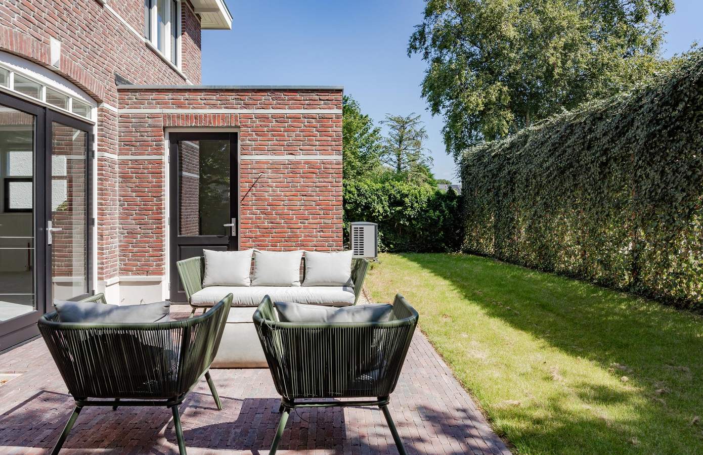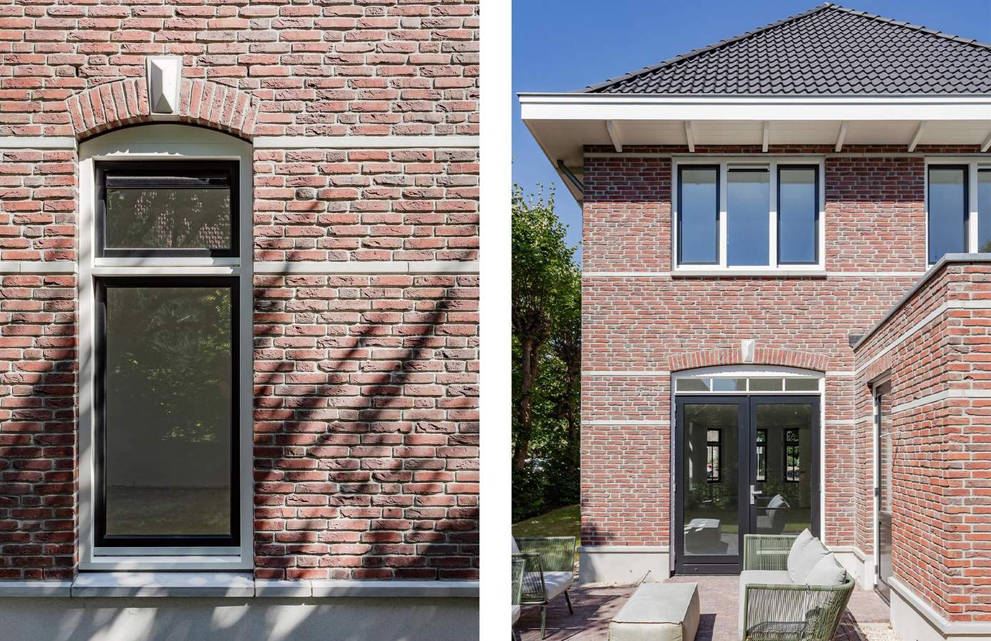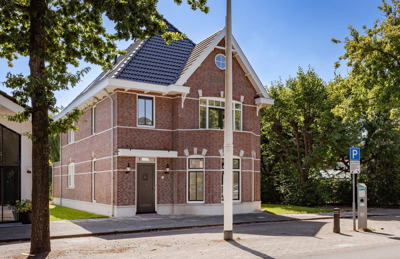 Rondom de woning ligt een strak aangelegd gazon en aan de zijkant vindt u een ruime oprit waar u uw auto op eigen terrein kunt parkeren. Het terras op het zuidoosten grenst direct aan de woonkeuken. De architectonische details – van de klassieke buitenverlichting tot de zorgvuldig gemetselde rollagen boven de ramen en het ronde raam in de topgevel – onderstrepen de signatuur van de architect, waarbij eigentijds comfort naadloos is verweven met traditionele allure.