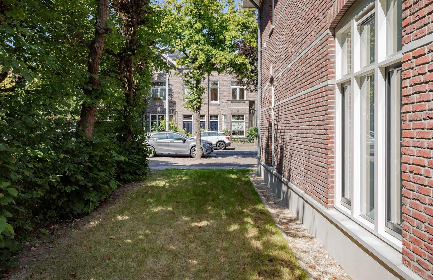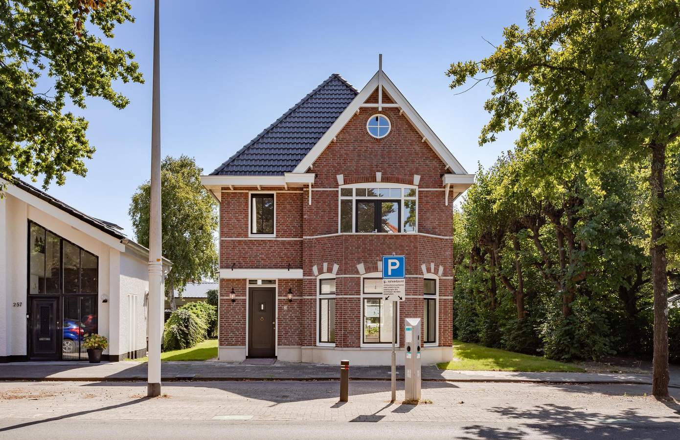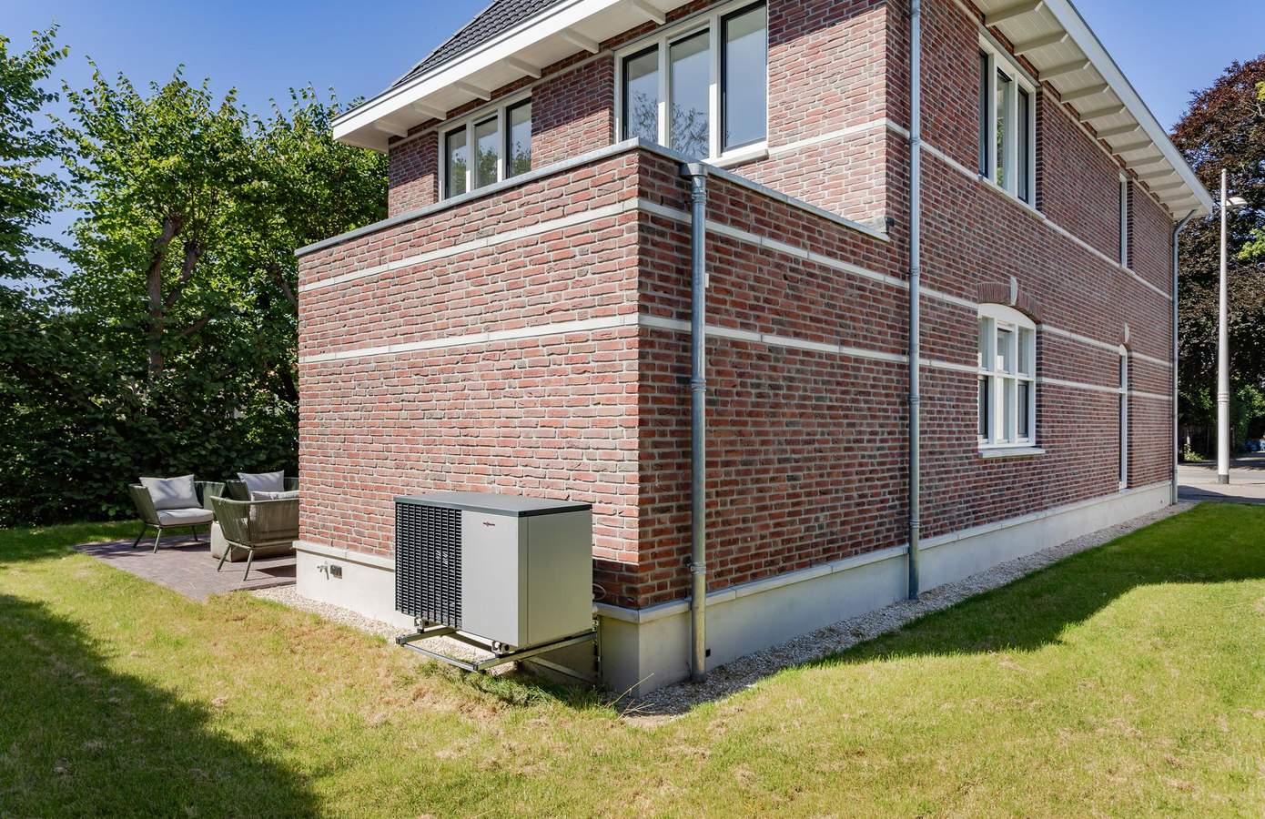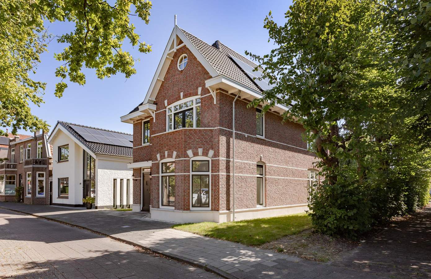 Rondom de woning ligt een strak aangelegd gazon en aan de zijkant vindt u een ruime oprit waar u uw auto op eigen terrein kunt parkeren. Het terras op het zuidoosten grenst direct aan de woonkeuken. De architectonische details – van de klassieke buitenverlichting tot de zorgvuldig gemetselde rollagen boven de ramen en het ronde raam in de topgevel – onderstrepen de signatuur van de architect, waarbij eigentijds comfort naadloos is verweven met traditionele allure.