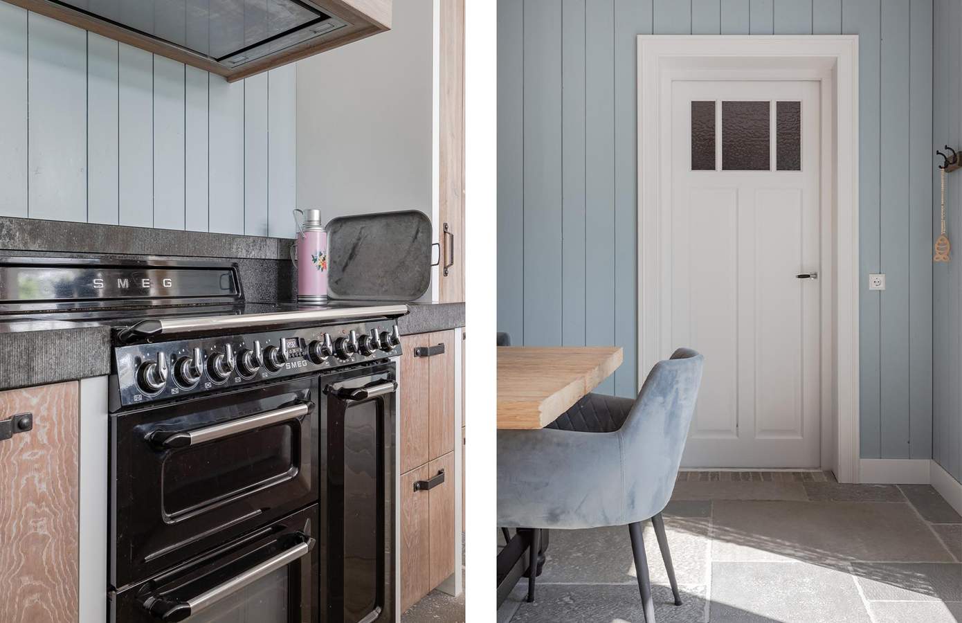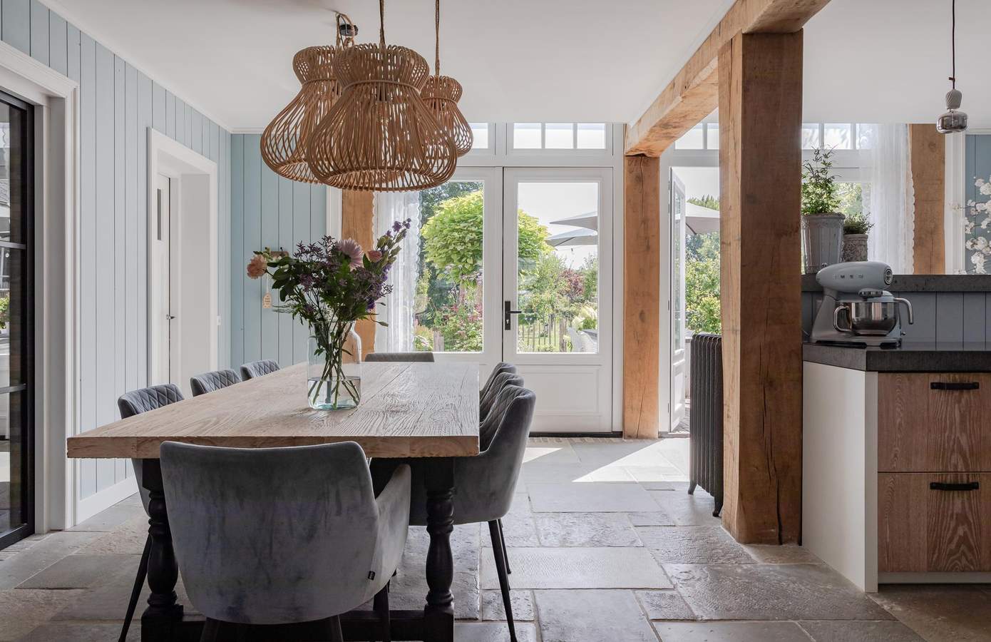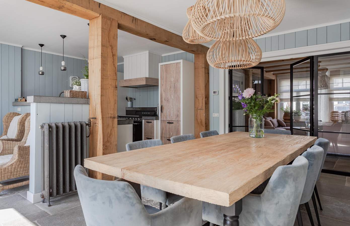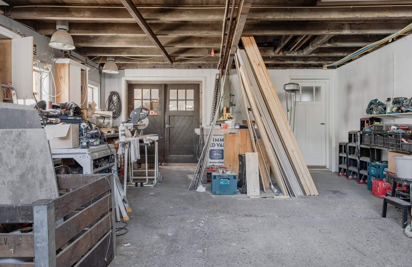 Stap binnen in de lichte hal, waar de combinatie van natuurlijke materialen en moderne afwerking u meteen welkom heet. Vanuit de hal loopt u door naar de woonkamer, een sfeervolle ruimte waar houten draagbalken en grote ramen zorgen voor een landelijke en warme sfeer. De natuurstenen vloer met vloerverwarming geeft niet alleen een luxe uitstraling, maar zorgt ook voor extra wooncomfort in elk seizoen. De leefkeuken is het kloppend hart van deze woning. Uitgevoerd met eikenhouten kastfronten, een stijlvol donker granieten werkblad en hoogwaardige apparatuur, is dit een plek waar koken en samenzijn centraal staan. Het landelijke karakter wordt versterkt door de houten wandafwerking in een frisse, zachte kleurstelling. Aan de ruime eettafel is alle plaats voor gezellige diners, terwijl openslaande deuren zorgen voor een naadloze verbinding met het terras en de tuin. Grenzend aan de keuken vindt u een praktische bijkeuken, voorzien van aansluitingen voor wasapparatuur en extra opbergruimte. Vanuit hier heeft u toegang tot verschillende bergruimtes en de ruime garage/werkplaats. Deze ruimte is momenteel ingericht als timmerwerkplaats, maar biedt talloze mogelijkheden: van hobbymatig gebruik tot een atelier of praktijkruimte.