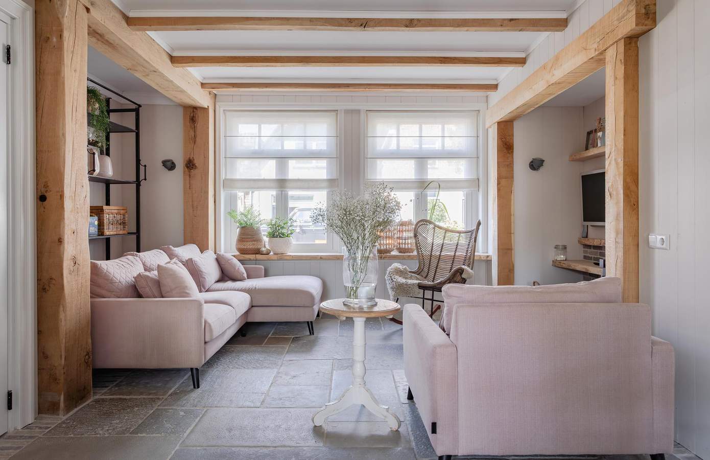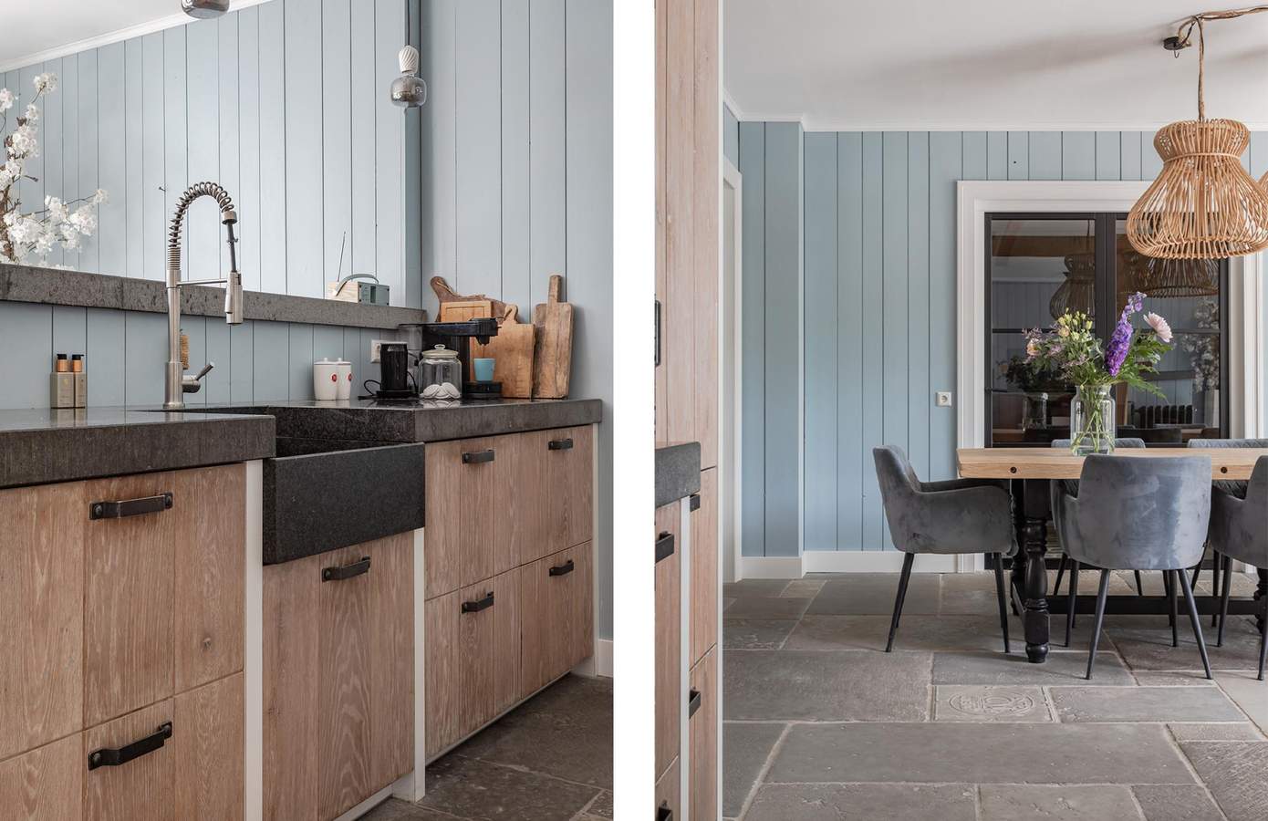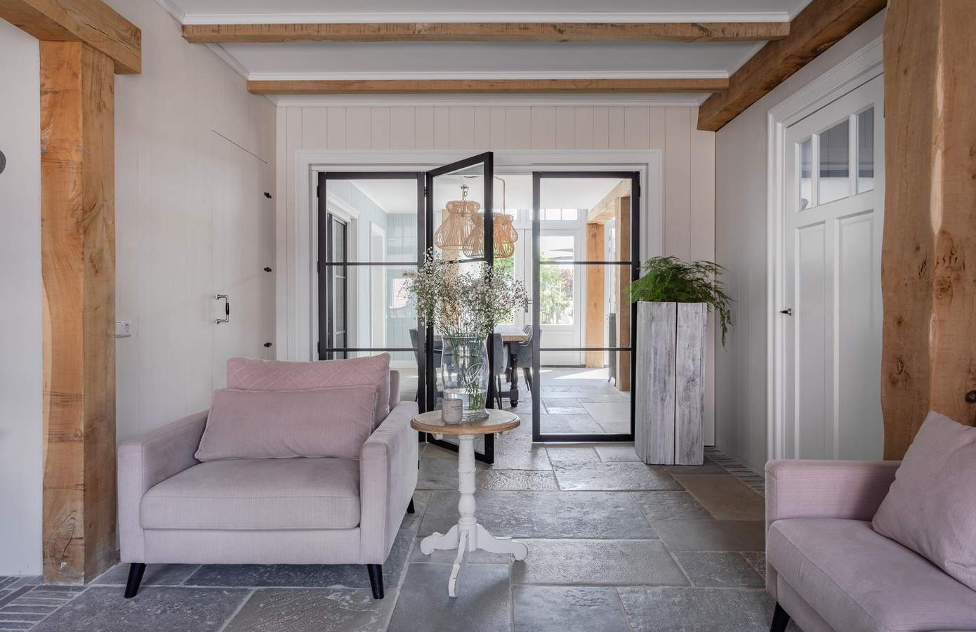 Stap binnen in de lichte hal, waar de combinatie van natuurlijke materialen en moderne afwerking u meteen welkom heet. Vanuit de hal loopt u door naar de woonkamer, een sfeervolle ruimte waar houten draagbalken en grote ramen zorgen voor een landelijke en warme sfeer. De natuurstenen vloer met vloerverwarming geeft niet alleen een luxe uitstraling, maar zorgt ook voor extra wooncomfort in elk seizoen. De leefkeuken is het kloppend hart van deze woning. Uitgevoerd met eikenhouten kastfronten, een stijlvol donker granieten werkblad en hoogwaardige apparatuur, is dit een plek waar koken en samenzijn centraal staan. Het landelijke karakter wordt versterkt door de houten wandafwerking in een frisse, zachte kleurstelling. Aan de ruime eettafel is alle plaats voor gezellige diners, terwijl openslaande deuren zorgen voor een naadloze verbinding met het terras en de tuin. Grenzend aan de keuken vindt u een praktische bijkeuken, voorzien van aansluitingen voor wasapparatuur en extra opbergruimte. Vanuit hier heeft u toegang tot verschillende bergruimtes en de ruime garage/werkplaats. Deze ruimte is momenteel ingericht als timmerwerkplaats, maar biedt talloze mogelijkheden: van hobbymatig gebruik tot een atelier of praktijkruimte.