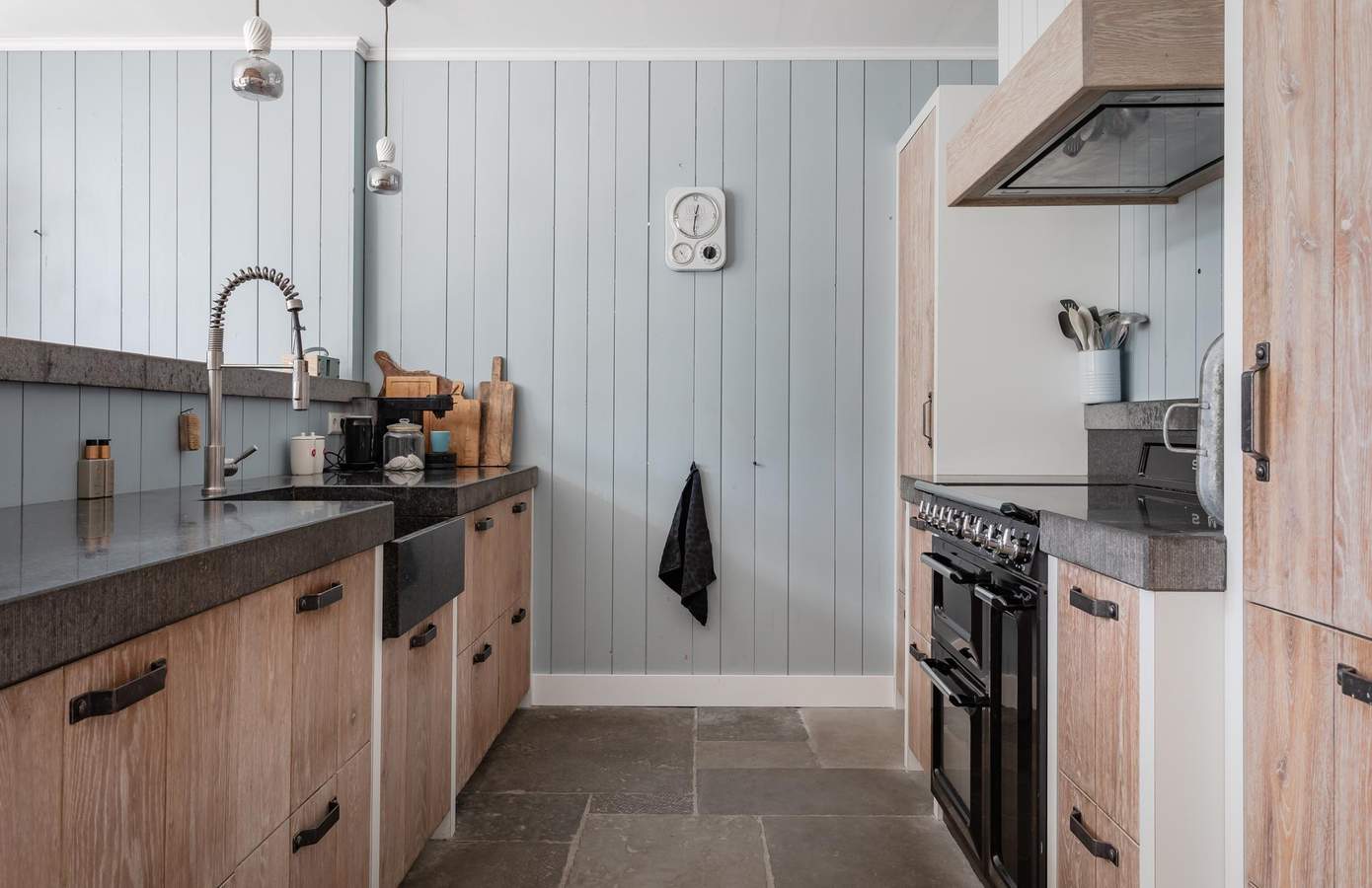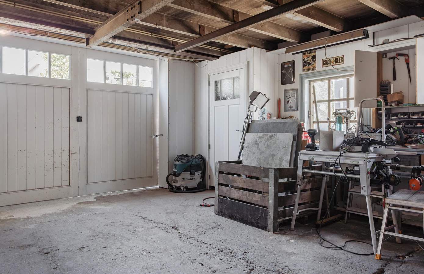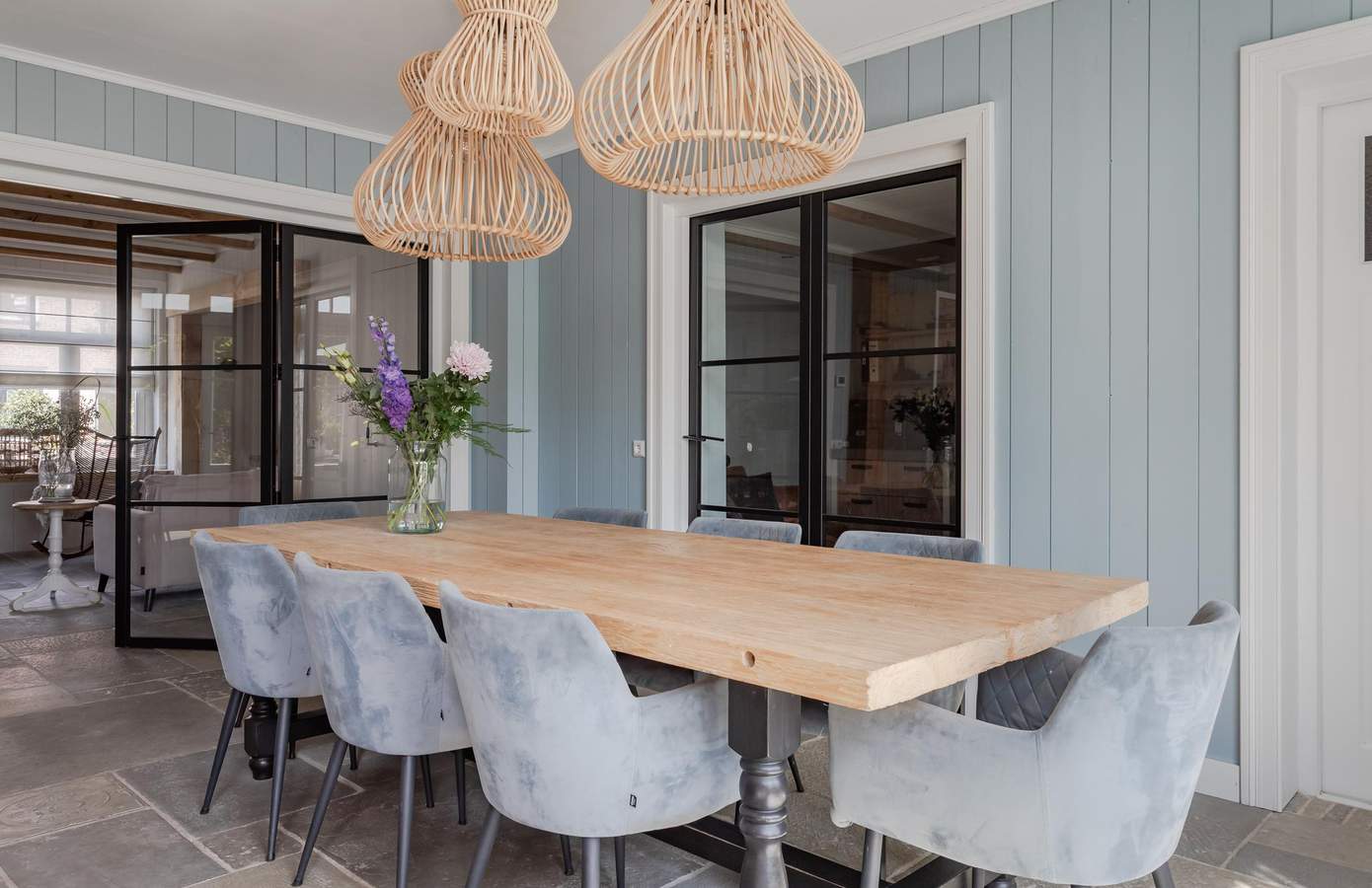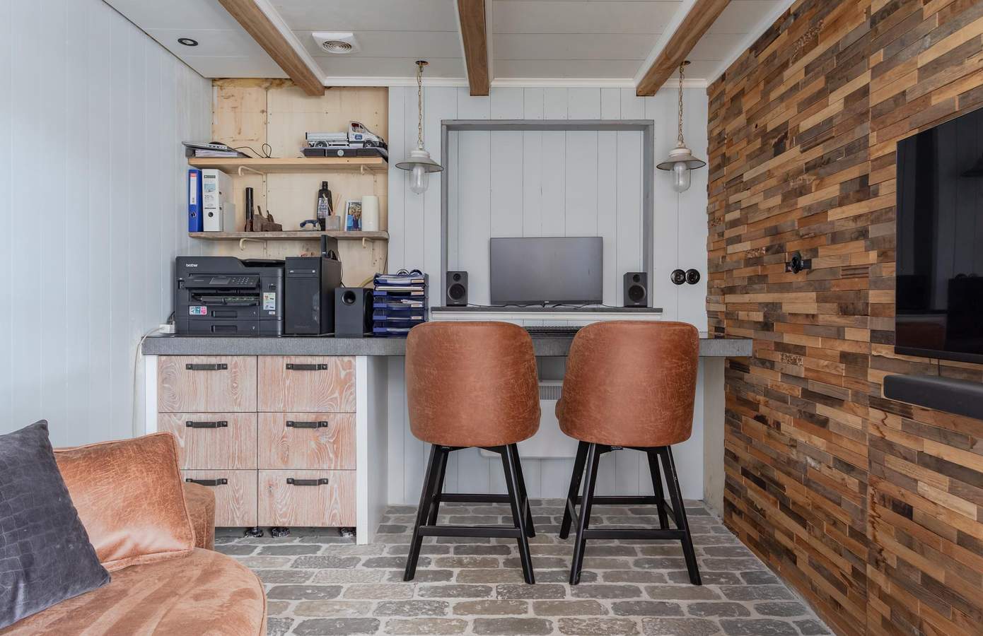 Stap binnen in de lichte hal, waar de combinatie van natuurlijke materialen en moderne afwerking u meteen welkom heet. Vanuit de hal loopt u door naar de woonkamer, een sfeervolle ruimte waar houten draagbalken en grote ramen zorgen voor een landelijke en warme sfeer. De natuurstenen vloer met vloerverwarming geeft niet alleen een luxe uitstraling, maar zorgt ook voor extra wooncomfort in elk seizoen. De leefkeuken is het kloppend hart van deze woning. Uitgevoerd met eikenhouten kastfronten, een stijlvol donker granieten werkblad en hoogwaardige apparatuur, is dit een plek waar koken en samenzijn centraal staan. Het landelijke karakter wordt versterkt door de houten wandafwerking in een frisse, zachte kleurstelling. Aan de ruime eettafel is alle plaats voor gezellige diners, terwijl openslaande deuren zorgen voor een naadloze verbinding met het terras en de tuin. Grenzend aan de keuken vindt u een praktische bijkeuken, voorzien van aansluitingen voor wasapparatuur en extra opbergruimte. Vanuit hier heeft u toegang tot verschillende bergruimtes en de ruime garage/werkplaats. Deze ruimte is momenteel ingericht als timmerwerkplaats, maar biedt talloze mogelijkheden: van hobbymatig gebruik tot een atelier of praktijkruimte.