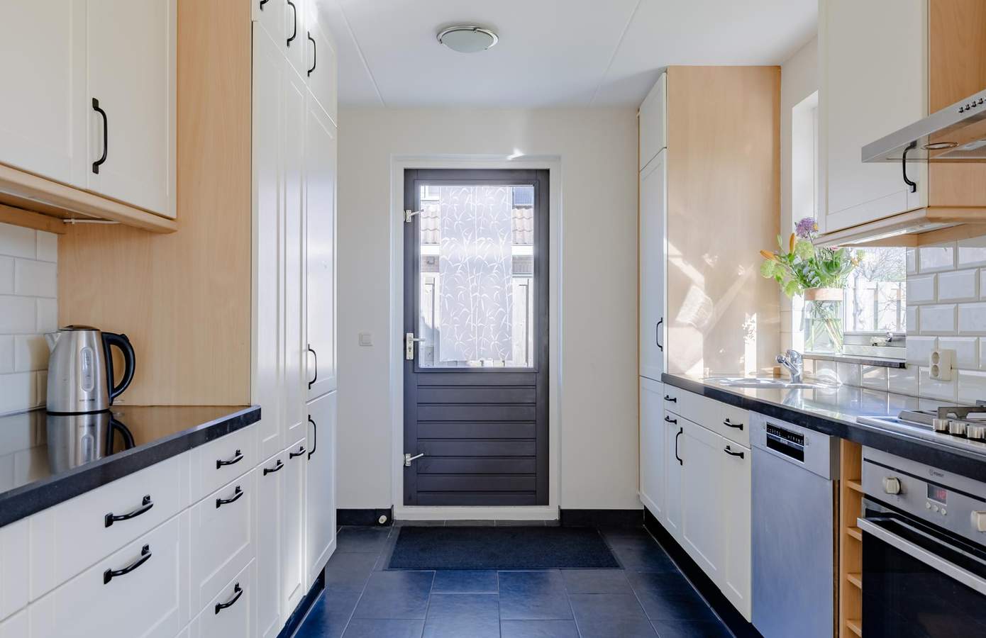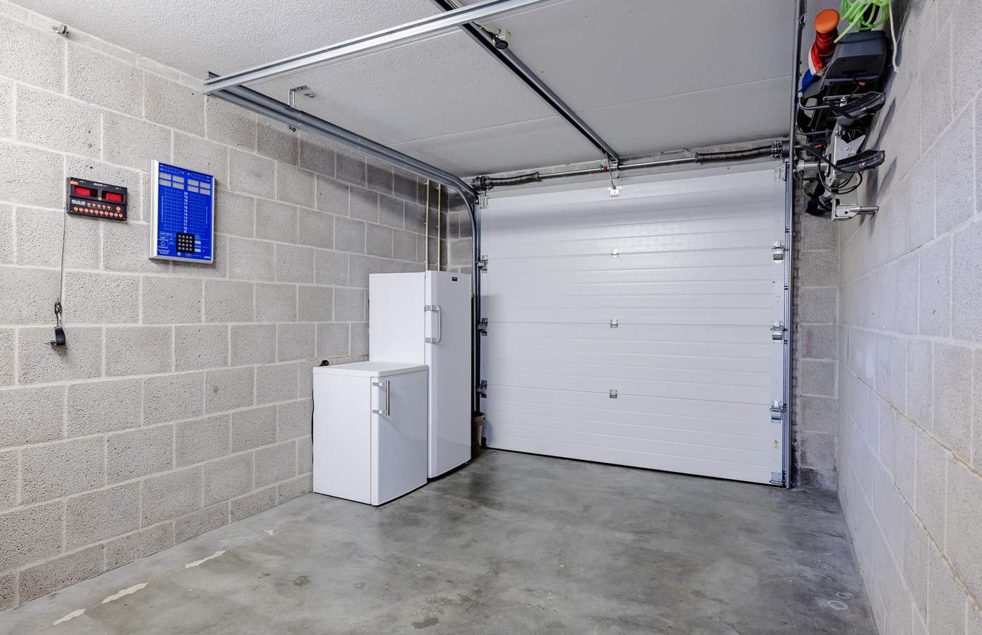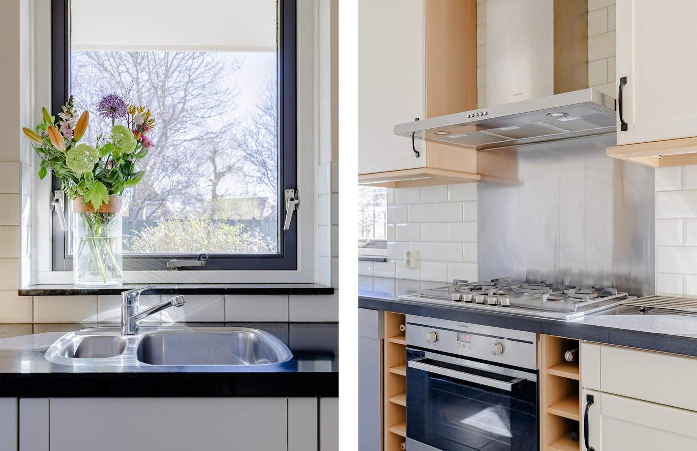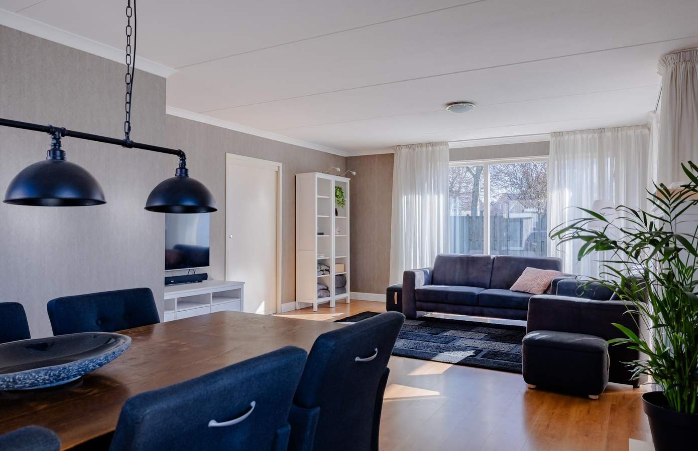 De woonkamer is ruim van opzet en aangenaam licht dankzij de vele raampartijen. De schuifpui zorgt voor een vloeiende overgang tussen binnen en buiten, waardoor de tuin een natuurlijk verlengstuk van de leefruimte vormt. De keuken is functioneel ingericht en heeft van diverse inbouwapparatuur, waaronder een vaatwasser, oven, koelkast en gaskookplaat. Daarnaast beschikt u hier over een handige voorraadkast. Vanuit de keuken bereikt u tevens de inpandige garage, een praktische en volledig geïsoleerde ruimte met elektra. De perfecte plek voor het stallen van uw auto, fietsen of als extra bergruimte.