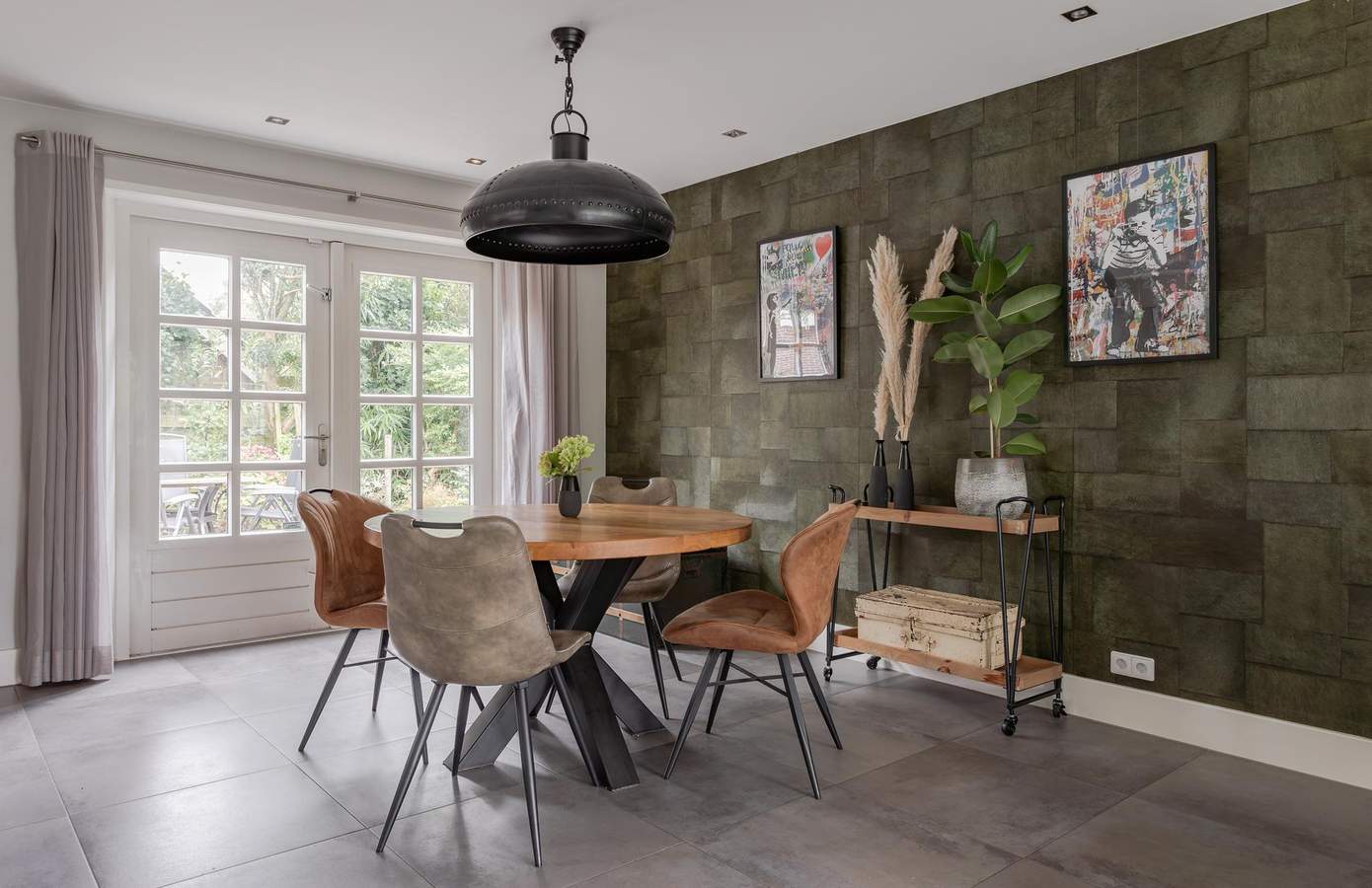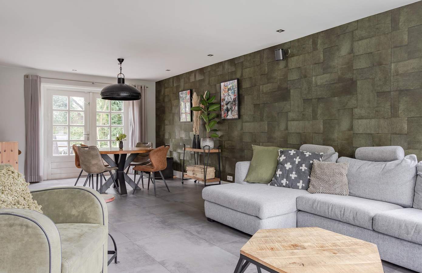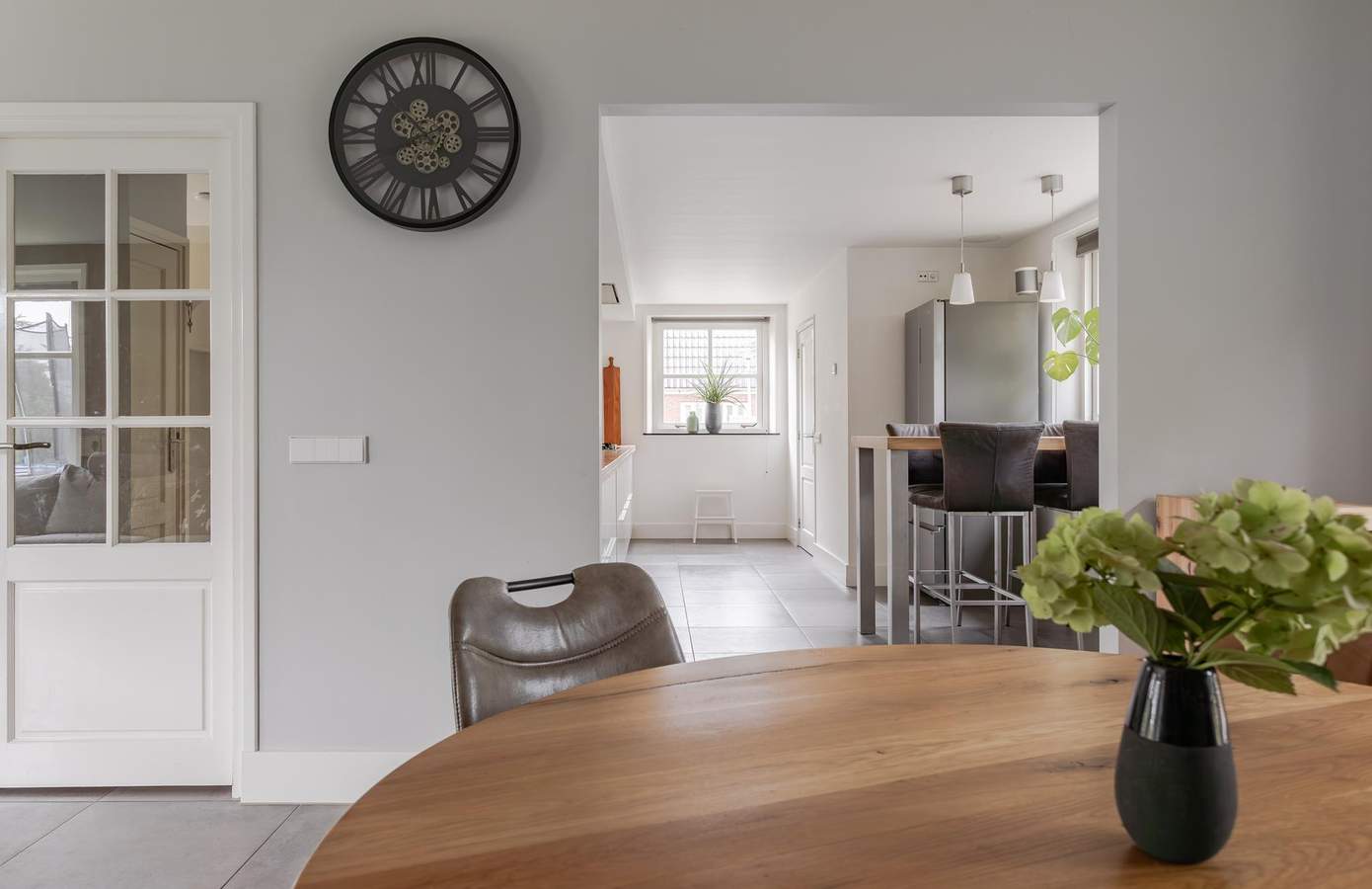 De woning beschikt over twee entrees: een achterom, bereikbaar vanaf de oprit, zoals dat vaak gaat in dorpen, en een hoofdingang aan de Heerenweg. Via deze ingang komt u binnen in een ruime en lichte hal. Aan de linkerkant van de hal bevindt zich een werkkamer, die ook uitstekend kan dienen als extra slaapkamer of als kantoor aan huis. Rechts vanuit de hal komt u uit tussen de woonkamer en de eetkamer. De woonkamer ligt aan de voorkant van de woning, terwijl de eetkamer aan de achterzijde is gesitueerd, met openslaande deuren naar de achtertuin.