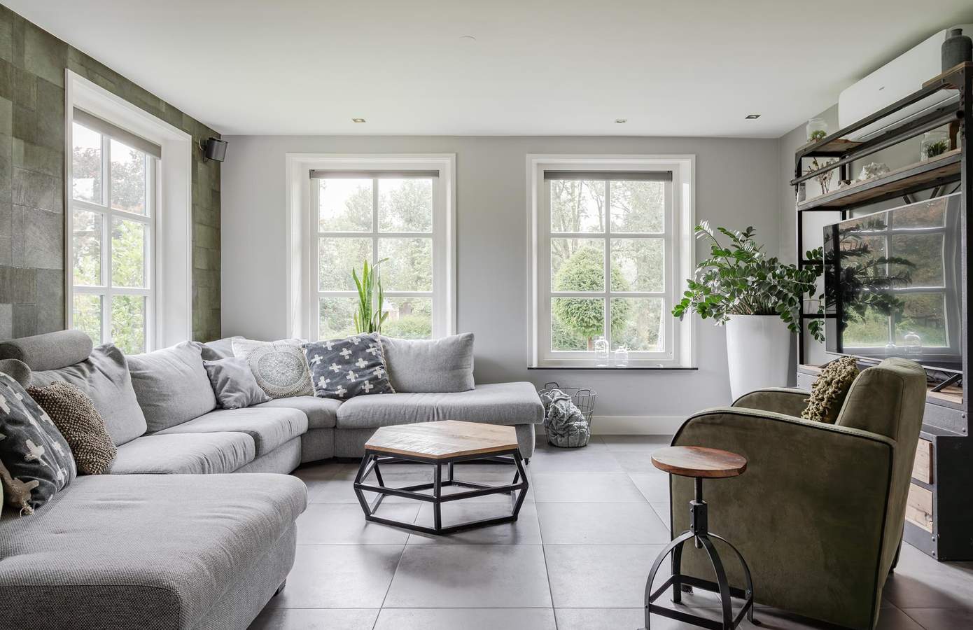 Het souterrain beslaat de volledige onderzijde van het woonhuis en is zowel via de zijkant van de woning als via een trap vanuit de hoofdentree bereikbaar. Beneden betreedt u de hal met ingebouwde kasten en een handige wasruimte. Rechts hiervan bevindt zich de hobbyruimte, momenteel ingericht als gym, maar ook perfect geschikt voor bijvoorbeeld een thuisbioscoop. De deur rechts leidt naar de garage, voorzien van een elektrische roldeur en ruimte voor meerdere auto’s. Daarnaast vindt u hier een volledig uitgeruste werkplaats, ideaal voor zowel de professionele als de hobbyklusser. Achter de garage ligt nog een extra ruimte, klaar om naar eigen wens in te richten.