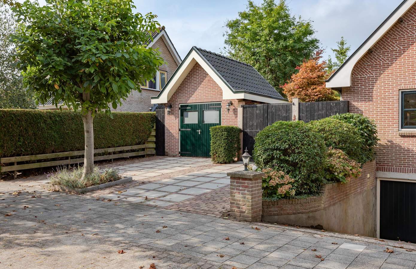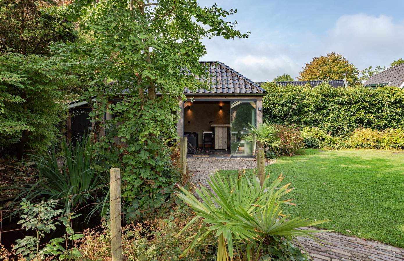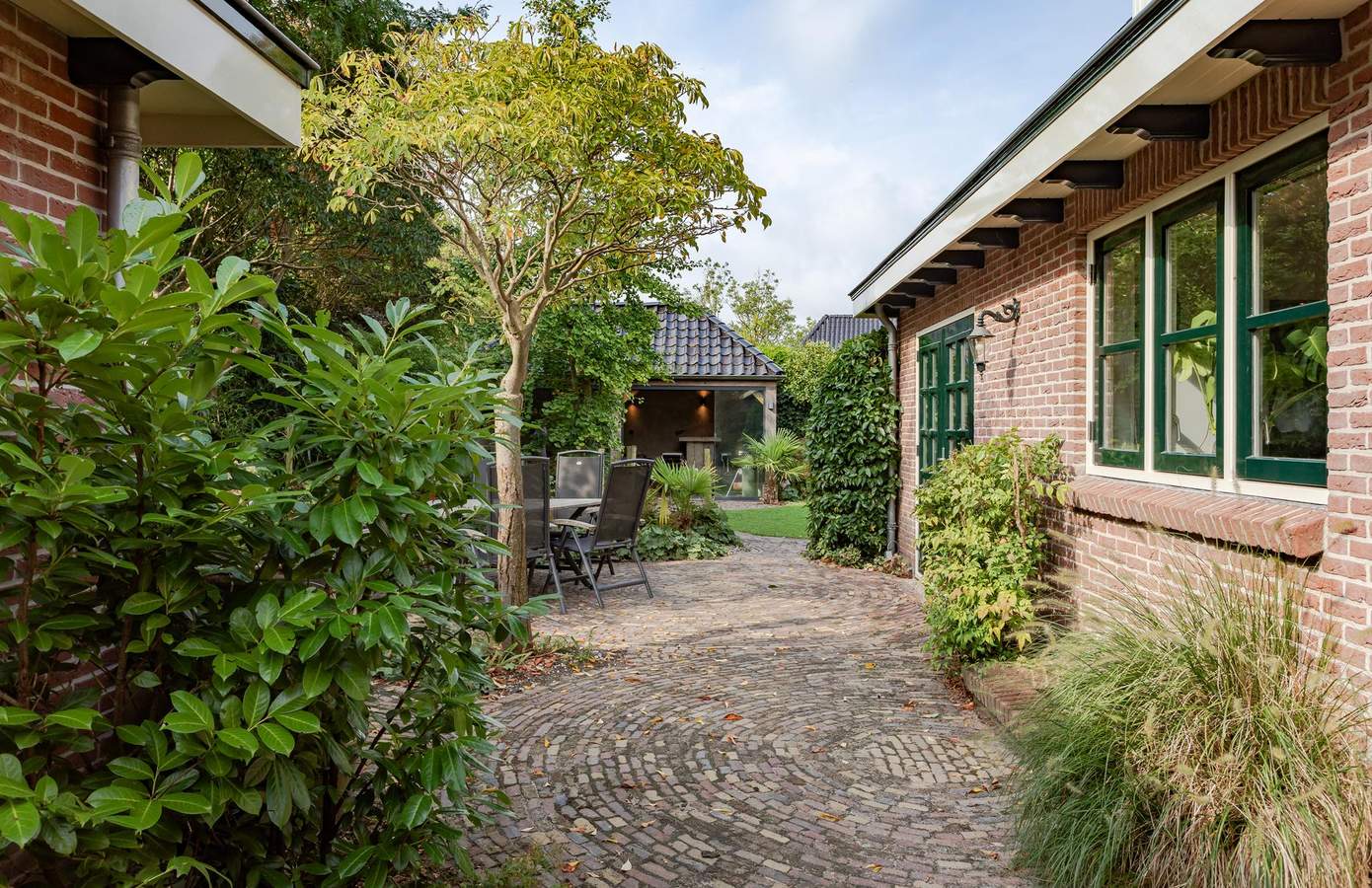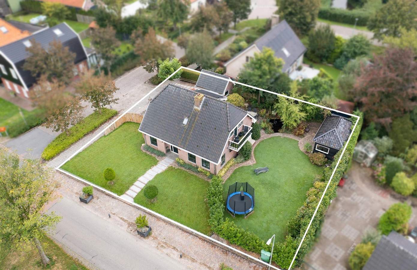 Doordat de woning op een terp is gebouwd, ligt deze hoger dan de weg en wordt zowel aan de voor- als achterkant omgeven door een prachtig aangelegde tuin, vol groene struiken, bomen, beplanting en zelfs een vijver. Aan de achterzijde van het huis bevindt zich een fijn terras op het zuiden, waar u heerlijk kunt genieten van de zon. Aan de zijkant van de woning ligt een groen gazon, een ideale speelplek voor kinderen om rond te rennen en te spelen. Als kers op de taart vindt u achterin de tuin een luxe overkapping met berging. De overkapping is voorzien van glazen schuifwanden en heaters, zodat u ook in de winter buiten kunt zitten. Binnen is een buitenkeuken gerealiseerd, compleet met een ingebouwde koelkast. Daarnaast is er vanaf de oprit toegang tot een bijgebouw met dubbele deuren en een vliering, ideaal voor het stallen van uw fietsen. De oprit biedt verder ruimte voor één auto en er is een gastenparkeerplaats voor de kelderuitgang, waar tevens een laadpaal voor elektrische auto’s aanwezig is.
