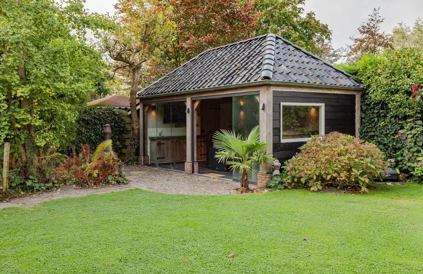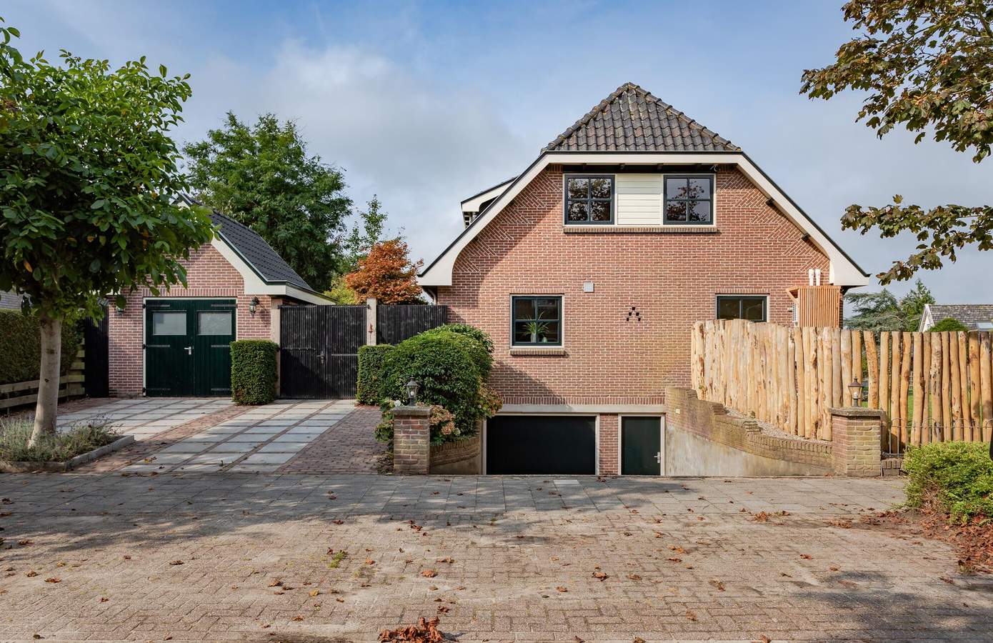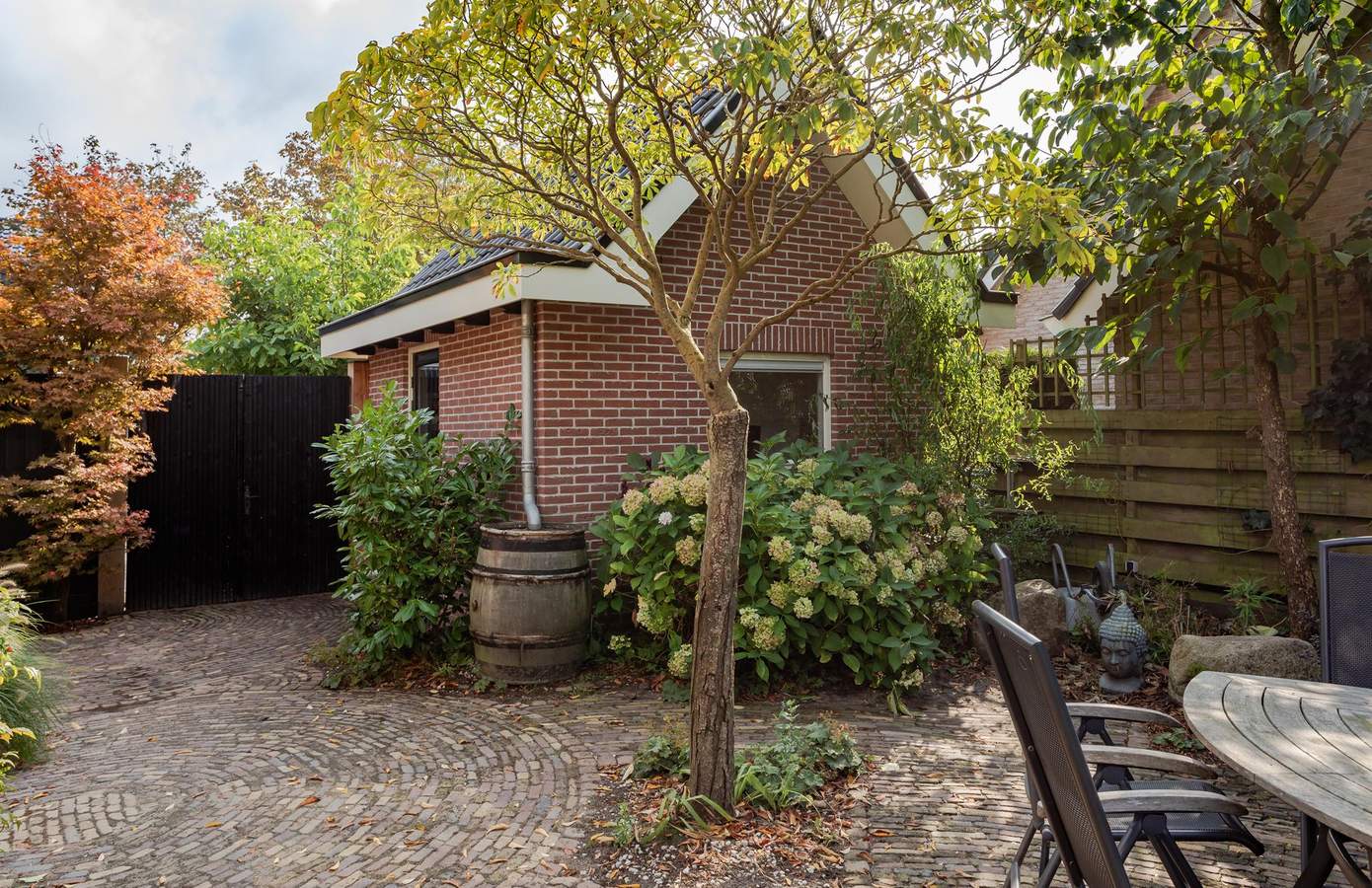 Doordat de woning op een terp is gebouwd, ligt deze hoger dan de weg en wordt zowel aan de voor- als achterkant omgeven door een prachtig aangelegde tuin, vol groene struiken, bomen, beplanting en zelfs een vijver. Aan de achterzijde van het huis bevindt zich een fijn terras op het zuiden, waar u heerlijk kunt genieten van de zon. Aan de zijkant van de woning ligt een groen gazon, een ideale speelplek voor kinderen om rond te rennen en te spelen. Als kers op de taart vindt u achterin de tuin een luxe overkapping met berging. De overkapping is voorzien van glazen schuifwanden en heaters, zodat u ook in de winter buiten kunt zitten. Binnen is een buitenkeuken gerealiseerd, compleet met een ingebouwde koelkast. Daarnaast is er vanaf de oprit toegang tot een bijgebouw met dubbele deuren en een vliering, ideaal voor het stallen van uw fietsen. De oprit biedt verder ruimte voor één auto en er is een gastenparkeerplaats voor de kelderuitgang, waar tevens een laadpaal voor elektrische auto’s aanwezig is.